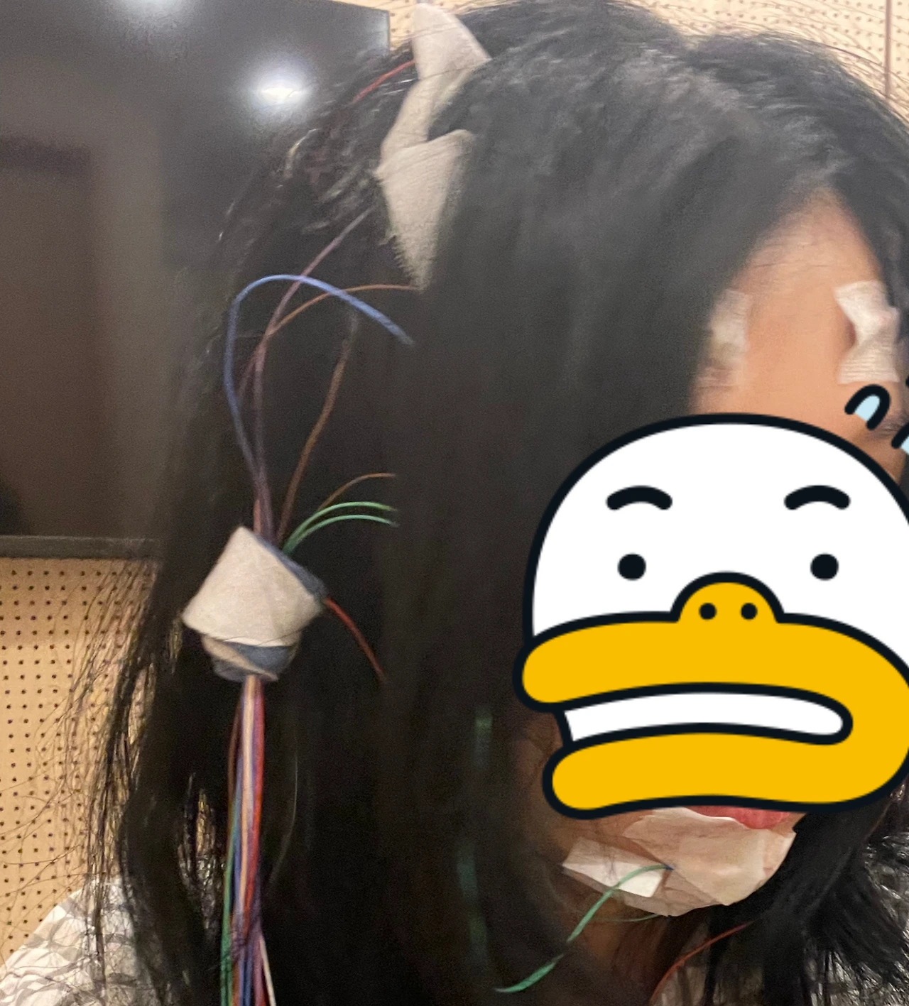 그런데 병원에 오기 전 덕지덕지 바른 수분크림의 물광이 과했는지 ”기름이 이렇게 많으면 전극이 붙지 않으니 세수하고 오시라”는 명이 떨어졌다. 나는 기름이 아닌걸 혼자 억울해 하며 채 벅벅 세수를 했다. 그리고는 9시부터 대략 11시까지, 두 시간 동안 머리에 전극을 부착했다. 뭐 얼굴은 당겼지만 전극은 척척 잘 붙더라…