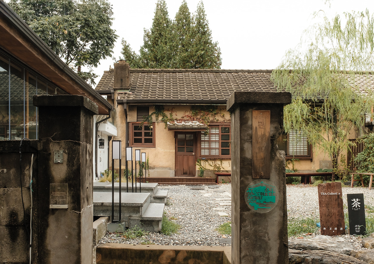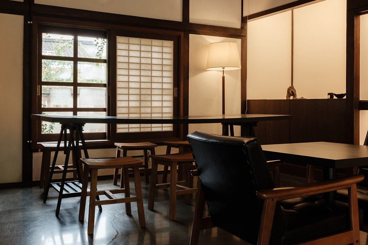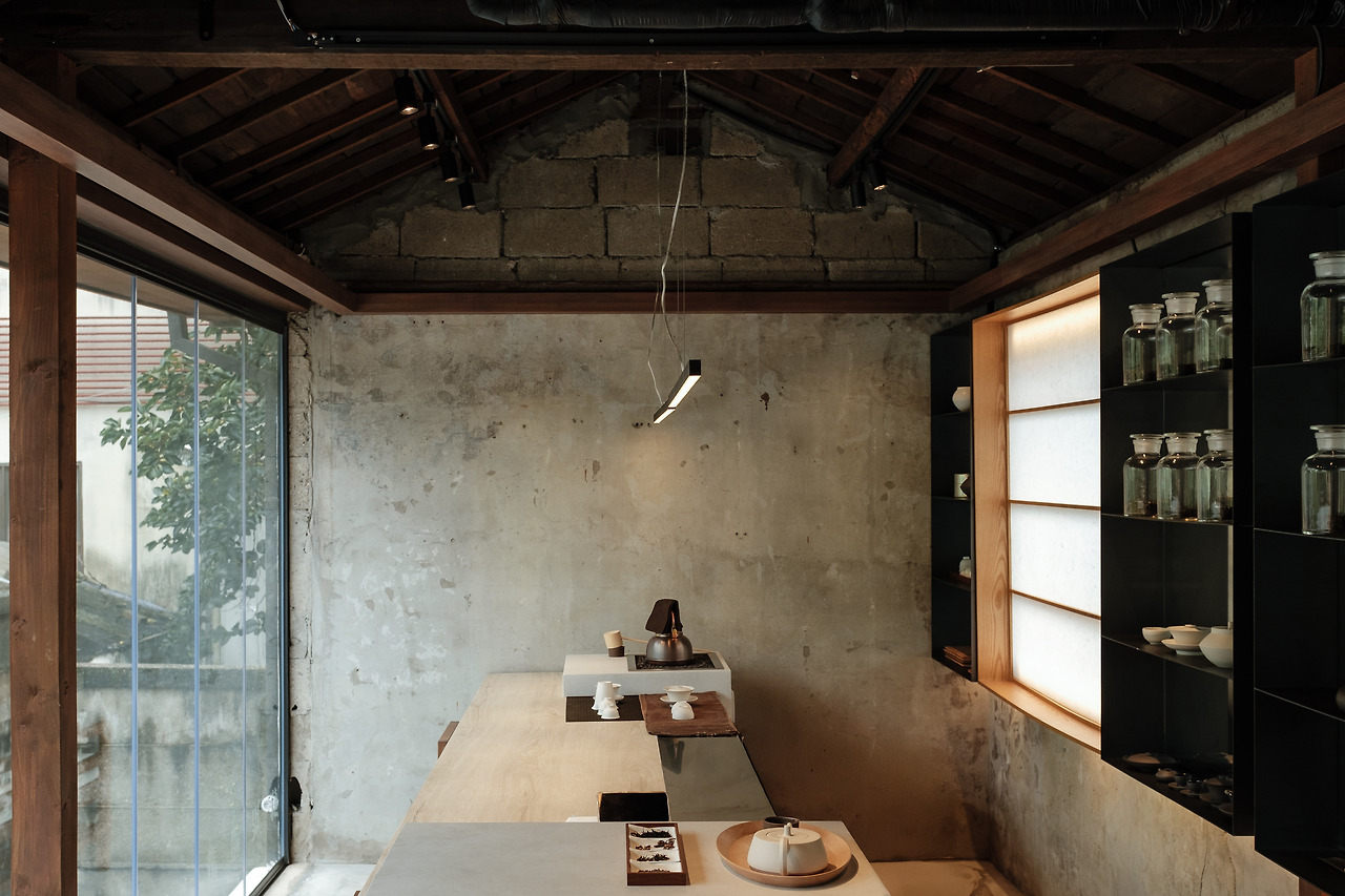 담장 너머 보이는 건물은 적산가옥의 형태를 그대로 간직하고 있어 역사적 시간을 정면으로 마주하게 한다.다. 그 옆으로는 또 하나의 건물이 자리하고 있는데 통유리창 너머로 보이는 다실의 모습이 소박하면서도 인상적이다. 유리벽 너머 다실에 들어서면 가로로 길게 늘어진 테이블과 몇 개의 의자가 전부로 공간이 협소해 더 많은 것을 채울 수 없었지만 오히려 덜어냄으로써 공간의 미학을 살린다. 대신 벽을 시원하게 뚫어 통유리창을 설치하고 건물의 방향을 따르는 목재 진열장으로 통일감을 주었다. 진열장 벽면에는 거울을 설치해 마당의 풍경이 반사되도록 하여 공간의 개방감을 높이고 가장 매력적인 마당을 실내를 다실로 끌어들였다.