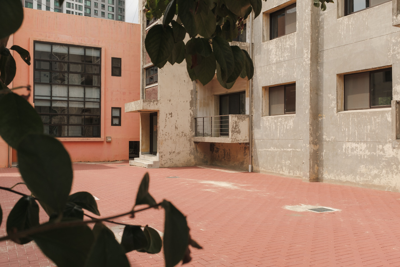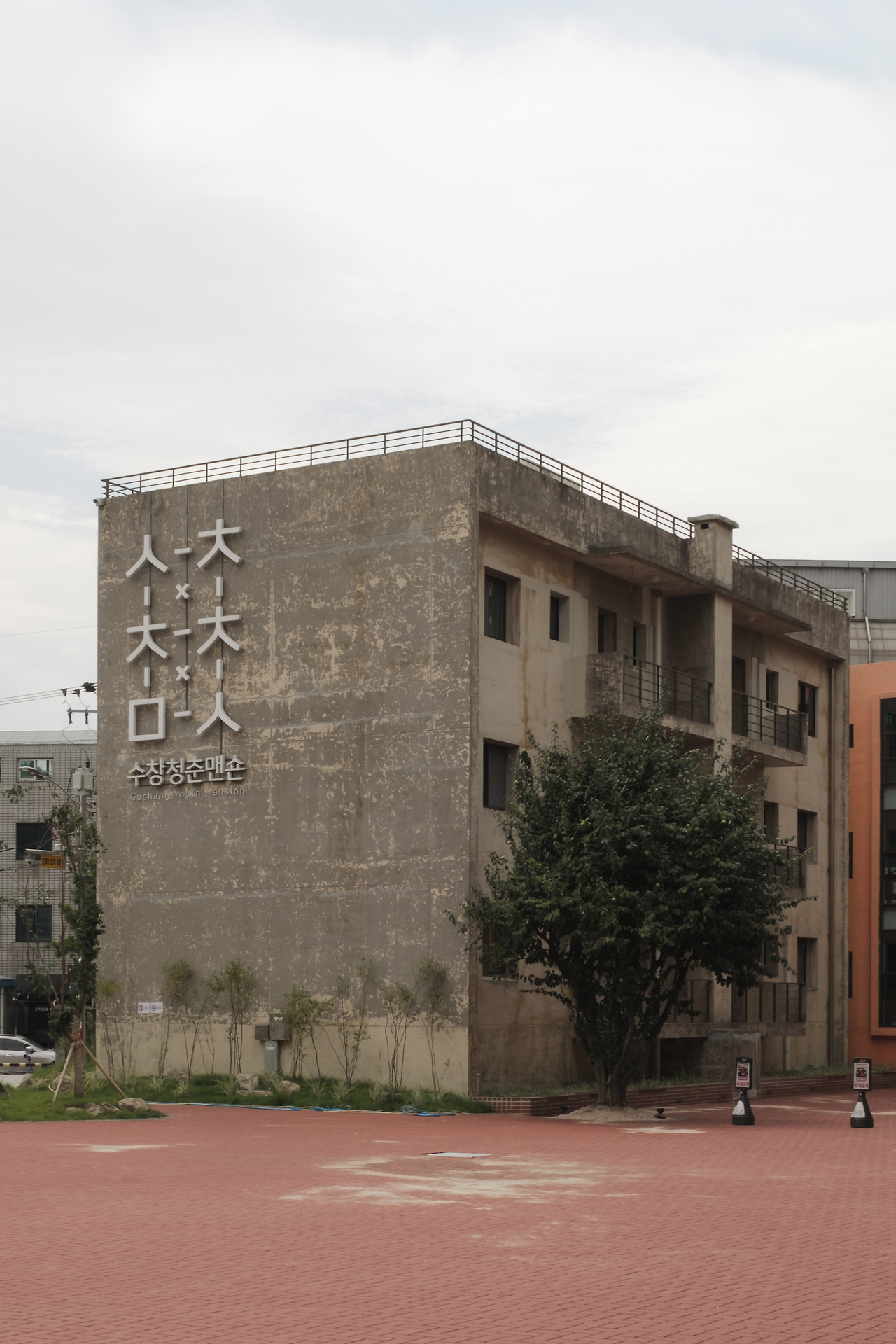 그 반대편에 위치한 수창청춘맨숀은 1976년 지어진 복도식 관사 아파트다. 연초제조창에 근무하던 직원들의 주거공간이었던 이곳은 공장 폐쇄 이후 20년 넘게 방치되었다가 2016년 문화재생사업을 통해 예술 공간으로 변신한 곳이다. 이 건물이 특별하게 느껴지는 부분은 바로 변화된 방식이다. 철거와 재건축이 아니라 ‘남겨진 것’을 존중하는 방식으로 리모델링이 이뤄졌다는 점이다. 맨숀의 계단을 오르면 발밑으로 느껴지는 마모된 철제 난간의 감촉과, 균열이 남은 벽면의 표면이 손끝에 닿을 듯 가깝다. 회색 몰탈 외벽, 일정한 간격의 창, 반복된 창틀의 리듬들까지. 이 모든 것이 시간의 패턴처럼 공간에 새겨져 있다.