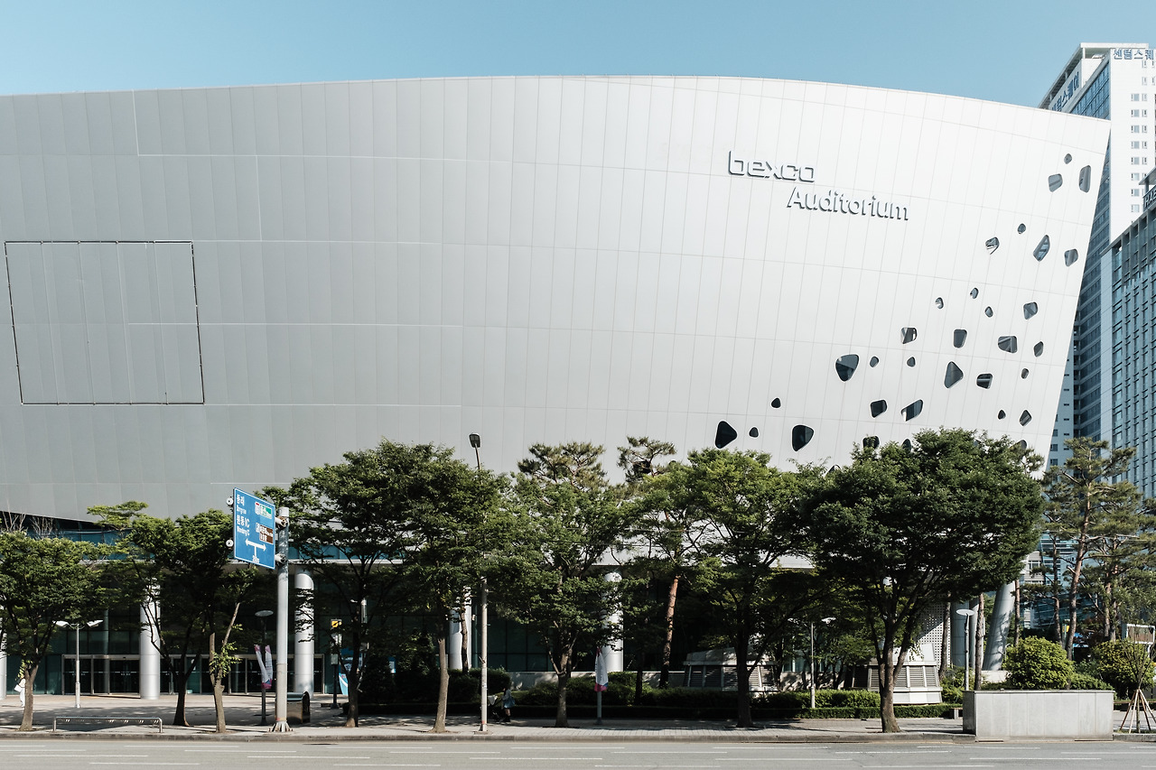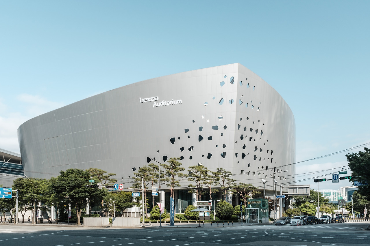 해운대 수영강변을 따라 펼쳐진 선형적 도시 흐름 속에서 마치 바다의 곡선을 닮은 이 건물은 도시의 리듬을 뒤흔든다. 바로 벡스코 오디토리움이다. 회색빛 도시 풍경 속, 오디토리움의 은색 곡면은 하늘을 빛을 받아 은근한 광택을 내며 마치 수면 위로 떠오른 고래의 등처럼 느껴진다. 건물은 구불구불한 곡선의 지붕과 유려한 파사드로 시선을 사로잡는다. 직선과 모서리가 지배하는 센텀의 풍경에서 이 건축은 유일하게 흐름을 품고 있는 구조다.