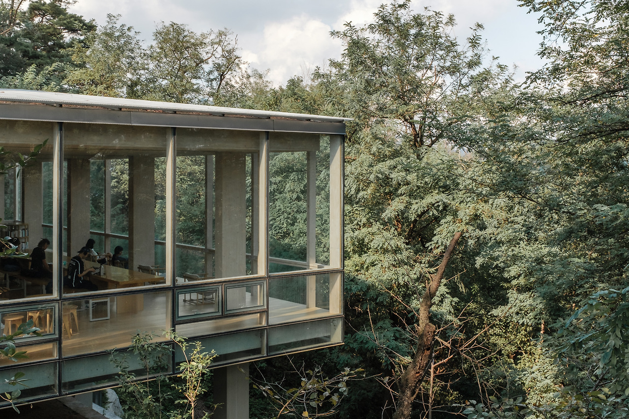 성벽을 따라 조금 더 올라서면 바위와 숲이 이어지는 언덕 중턱에 쉼터라고 적힌 이정표가 세워져 있고, 그 길을 따라 깊숙이 들어서면 묵직한 콘크리트 필로티 위로 지붕이 올려져 있는 건축이 모습을 드러낸다.