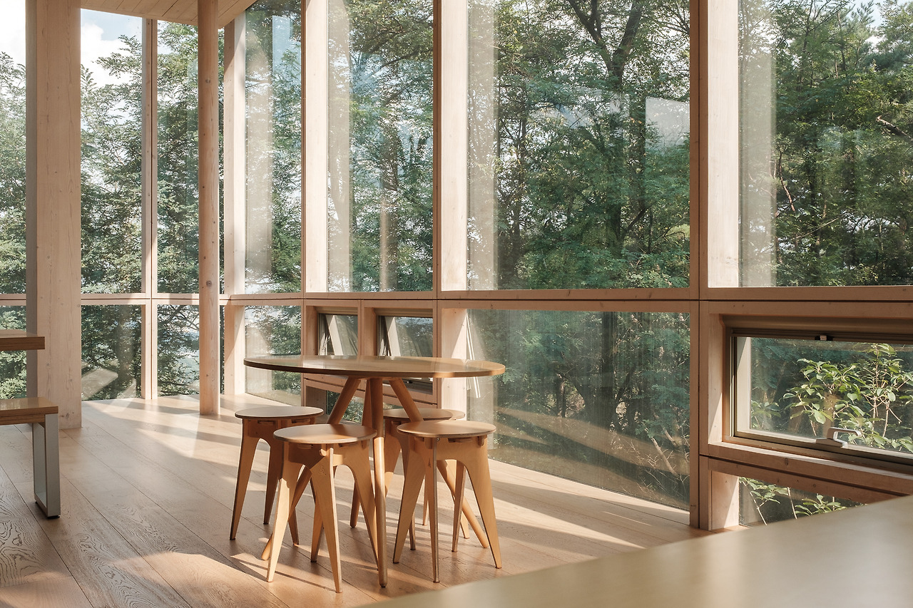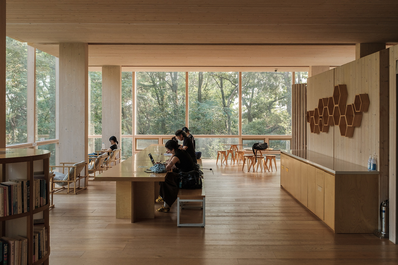 목구조로 구성된 내부는 외관의 무거운 인상과 달리 가벼운 인상을 준다. 철근콘크리트 필로티 기둥 위로 목재 기둥을 세우고, 그 사이에 지붕판을 끼워 넣는 형식으로 구조물을 조립했다. 거대한 크기의 지붕판은 목재 기둥 위에 얹힌게 아닌 그 사이에 끼움으로써 하중 전달을 분산하고 기둥에 의해 비워진 틈은 간접조명으로 그 효과를 강조했다. 여기에 통창으로 들어오는 외부의 햇살은 공간을 더 가볍고 부유하게 만든다.