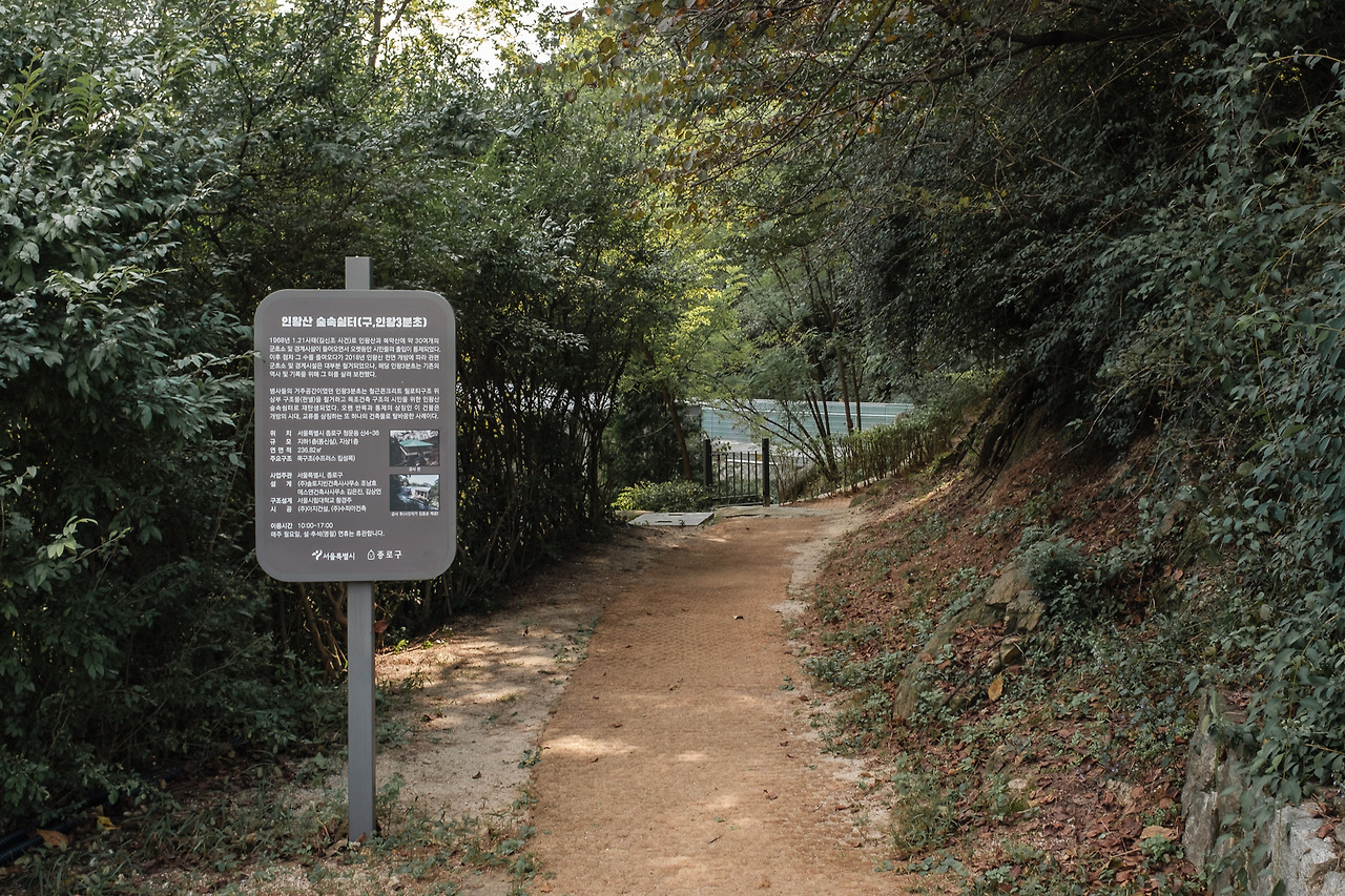 숲길 사이로 불쑥 모습을 드러낸 쉼터는 과거 인왕3분초로 군 초소이자 초병들의 거주공간으로 사용되던 공간이다. 1968년 1.21 사태 이후 북안산과 인왕산에는 약 30여 개의 군 초소가 들어서면서 오랫동안 시민들의 출입을 통제했다. 도시의 경계에서 통제와 감시의 기억이 머물던 자리는 그 폐쇄적 시간 위에 바람과 빛 그리고 고요가 머무는 풍경을 펼치며 시민들을 위한 쉼터로 재구성됐다.
