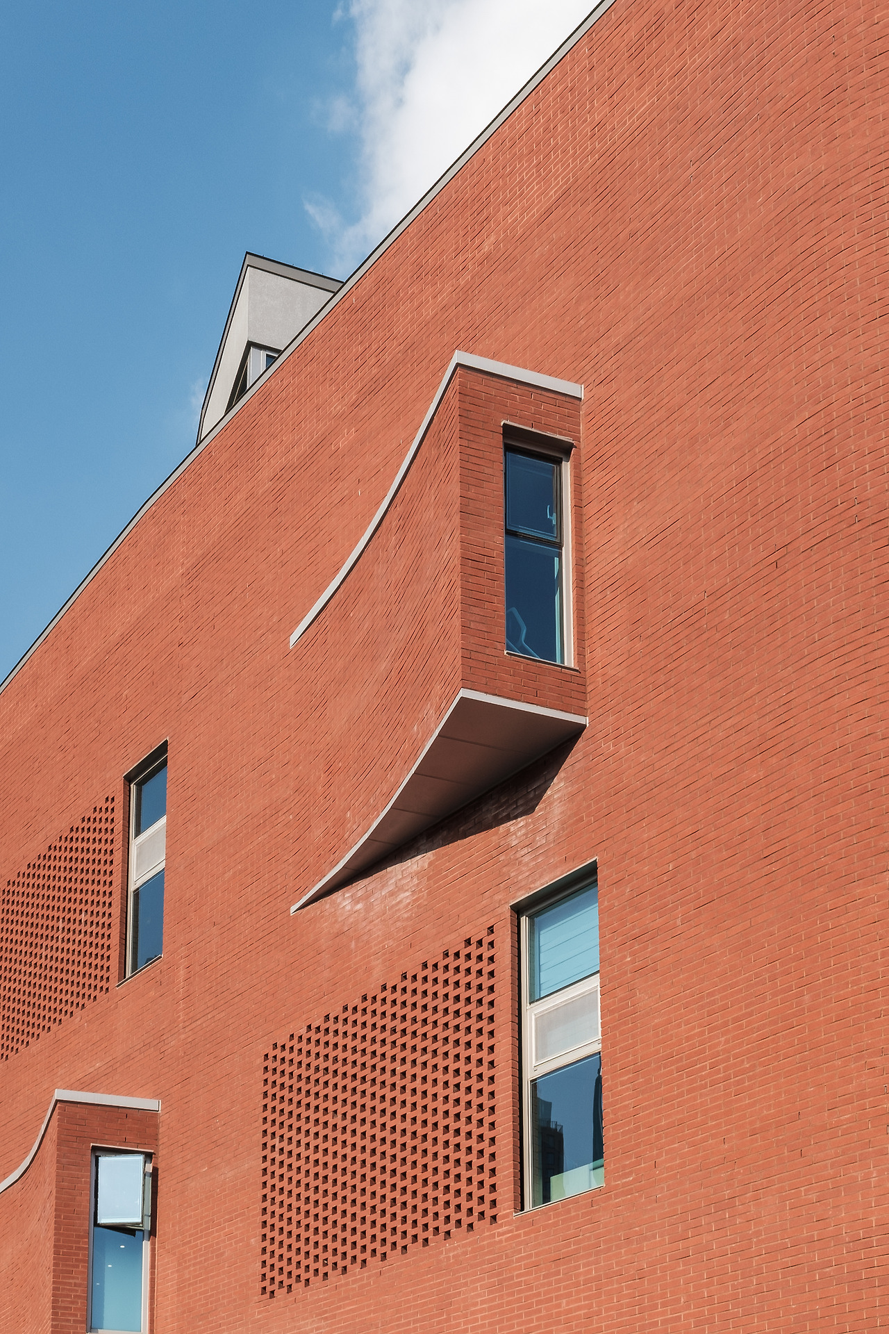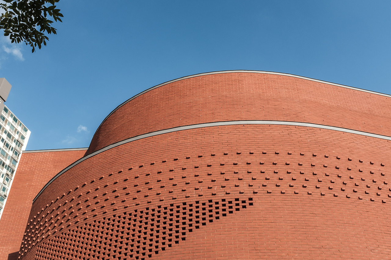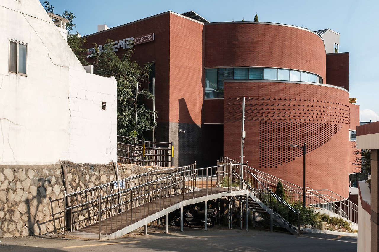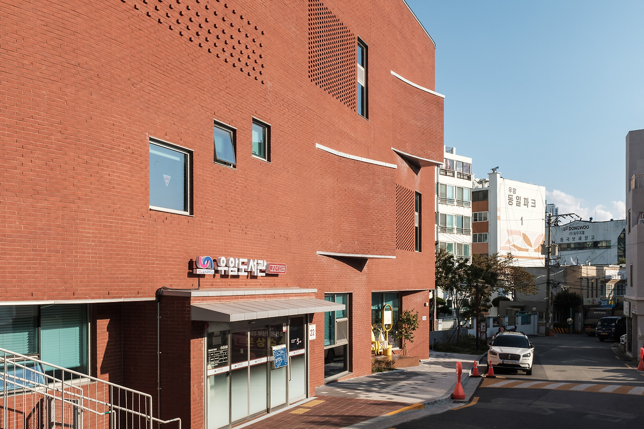 우암도서관은 경사를 따라 올라가는 골목, 비정형의 대지 위에 자리한다. 외벽을 감싼 붉은 벽돌은 다양한 쌓기 방식을 품고 있다. 어디는 들어가고, 어디는 튀어나오며, 일정한 패턴을 이룬 벽면은 골목 방향을 따라 둥글게 감싼다. 마치 도자기를 빚어낸 것처럼, 이 곡선은 건물에 부드러운 인상을 남긴다.