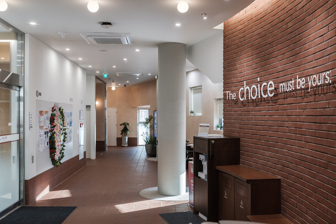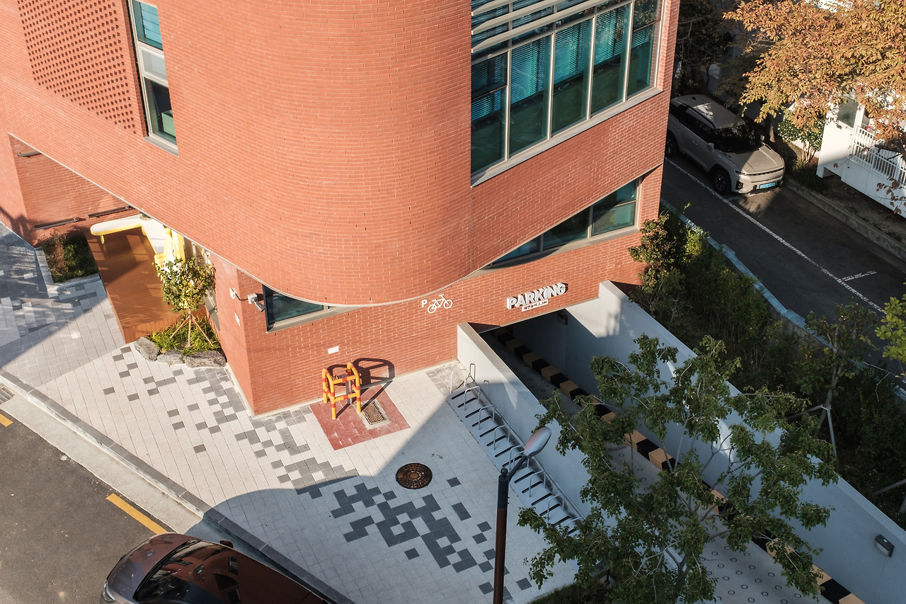 고저차가 있는 지형 위에 놓인 건물은 어느 방향에서든 진입이 가능하다. 골목 초입에선 차량을 타고 지하 주차장으로, 도보로는 자연스럽게 1층으로 진입할 수 있다. 골목 위에서 내려오는 사람은 슬로프와 계단을 통해 2층으로 이어진다.