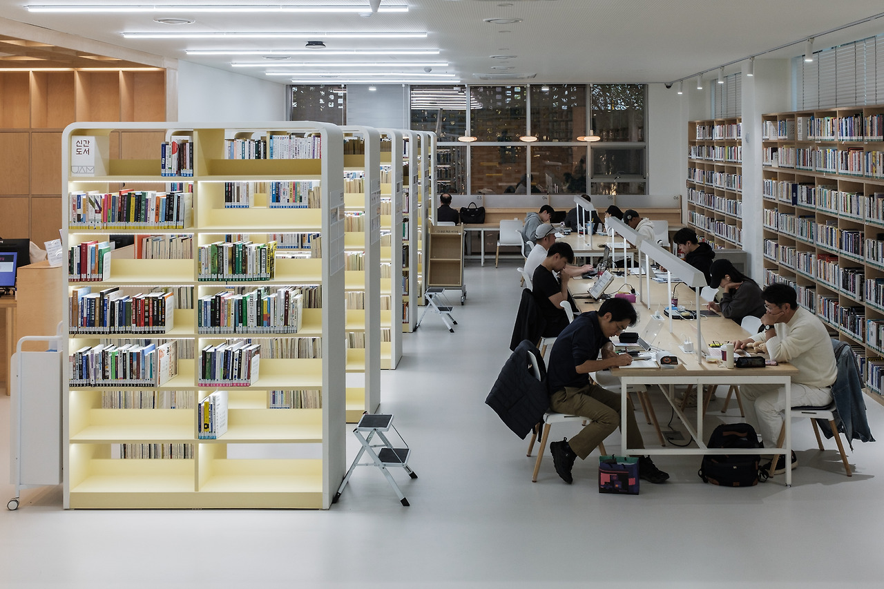 안쪽에 마련된 열람실은 흰색 벽면과 원목 마감이 어우러져 따뜻하고 차분한 분위기를 만들어낸다. 열람실은 남북으로 길게 나뉘며, 그 안에서 용도에 따라 공간이 세분화되어 있다. 제한된 면적을 최대한 활용하기 위해 서고를 중심으로 주변엔 독서와 작업을 위한 가구를 배치해 동선을 효율화했고, 동시에 공간의 개방감을 확보했다.