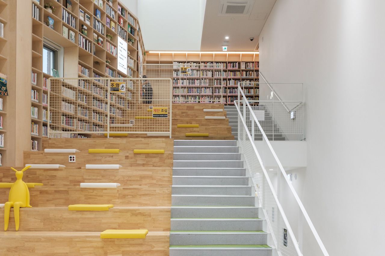 3층으로 이어지는 계단형 서고는 외부 동선과 연결돼 있어 이용객은 이동 중에도 자연스럽게 서가를 마주하게 된다. 서고 사이사이에 낸 창은 주변 주거지를 프레임처럼 담아낸다. 열람실 안에서도 창을 통해 마을 풍경이 들어와 내부가 단절된 공간이 아닌 마을의 일부를 끌어안는 열린 공간임을 나타낸다.
