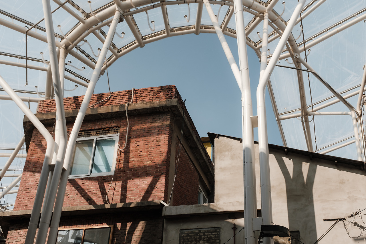 카메라 삼각대처럼 세워진 기둥 위로 골목 전체를 감싸는 구조물은 빛을 통과시키면서 비와 눈을 막아주는 가림막 역할을 한다. ‘우산처럼 골목을 덮는 지붕’이라는 개념 아래, 구조물은 ㄷ자 형태로 이어지는 시장의 동선을 따라 구조물이 배치되었다. 길과 길이 교차하는 지점마다 세워진 기둥은 업장의 간판이나 진입로를 가리지 않도록 치밀하게 설계되었고, 그 배려의 흔적은 시장 곳곳에서 엿볼 수 있다.