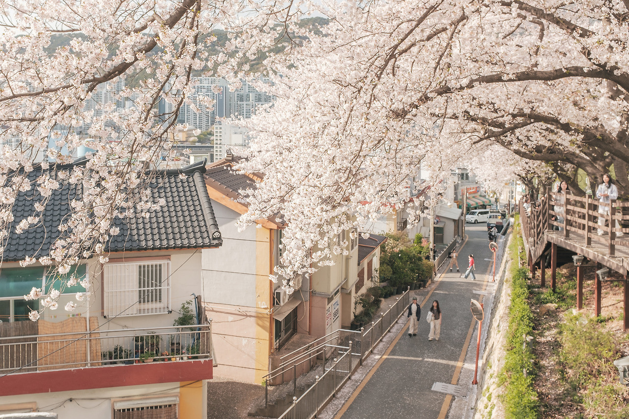 다시 몇 분을 올라가니, 이내 사람들이 '개금벚꽃문화길'이라 부르는 풍경이 눈앞에 펼쳐졌다. 길이 180m 남짓한 이 길은 언덕과 주택 사이 남은 틈새 공간을 따라 조성됐다. 이 벚꽃길은 '산복도로 르네상스 프로젝트'일환으로 탄생했다.