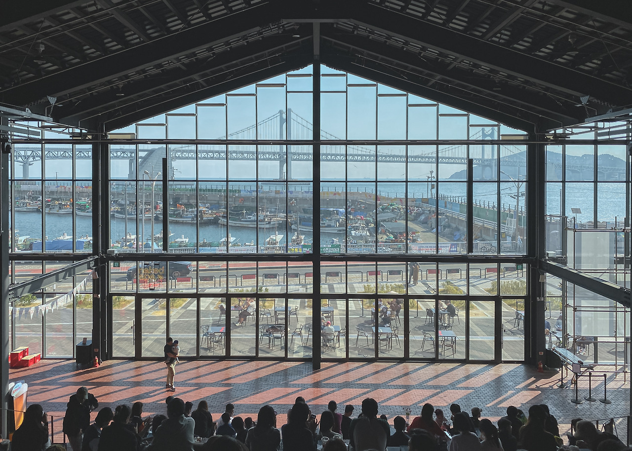 창고의 원형은 부산항의 수변이 가지는 도시적 맥락을 형성함과 더불어 빈 공간을 구현하기에 적절한 모티브다. ‘ㅅㅅㅅ’ 세 개의 분절된 형태로 매스는 바다 조망이 가려지지 않는 높이로 주변 인접한 고층 건물과 강한 대비를 이루며 도시풍경을 그린다. 지하 1층, 지상 2층 규모로 1층에는 주차장과 여행객들을 위한 다양한 프로그램, 버스킹 무대 등이 마련돼 있고, 2층에 들어서면 다양한 식음료 업체, 리테일 편집숍, 팝업 스토어 등의 공간요소들로 채워져 있다. 그리고 이곳의 상징적인 공간은 남측에 1층부터 2층까지 대계단(grand stair)을 놓고, 커튼 월로 통창을 세워 선착장과 바다를 연접해 광안대교를 가장 가까이서 조망할 수 있게 디자인하여 사람들과 나아가 바다와 관계를 풀어낸다.