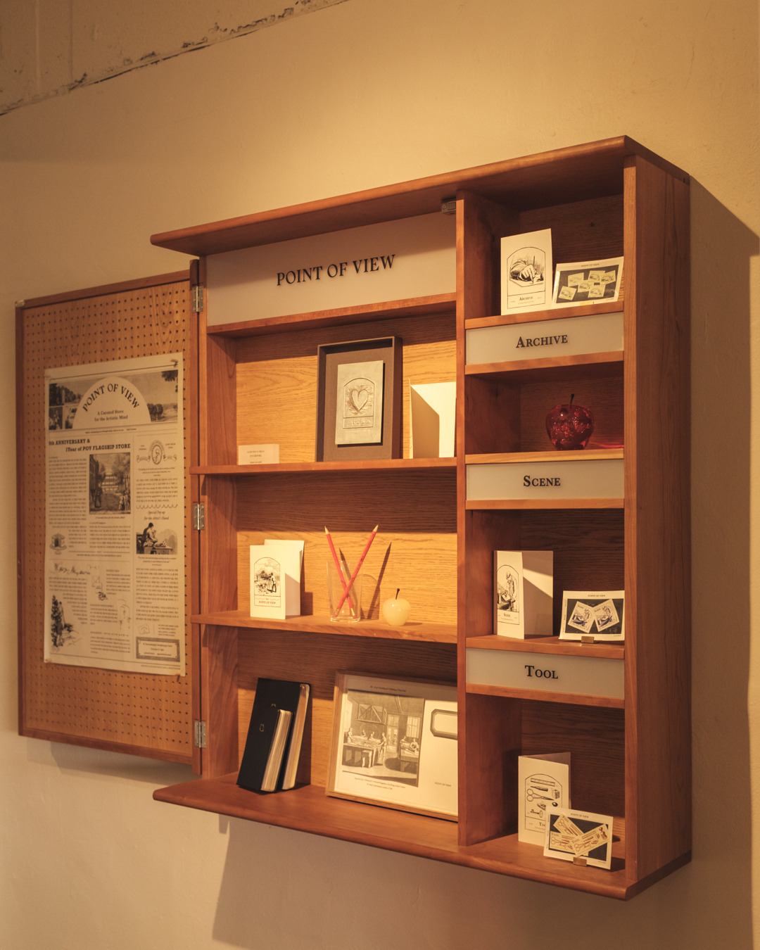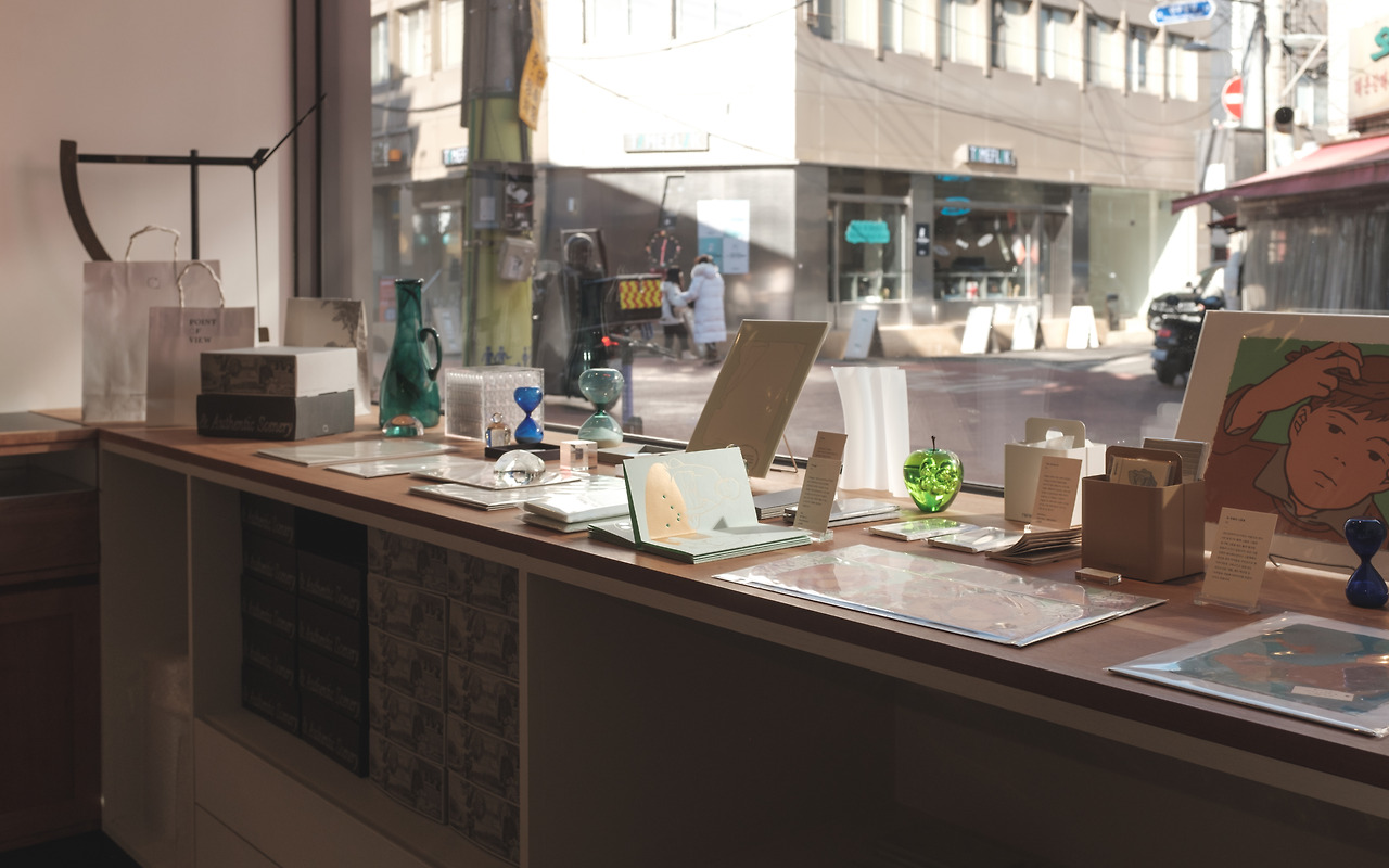 TOOL, SCENE, ARCHIVE 각 테마를 지닌 3개 층으로 구성되어 창작의 단계적 과정을 본떠 만들어진 이곳은 층을 거듭할수록 깊어지고 뚜렷해지는 관점의 변화와 포인트 오브 뷰(Point Of View)가 전하는 아티스틱 마인드를 경험할 수 있다. 일반 문구점에서 볼 수 없는 다양한 해외 브랜드 제품부터 포인트오브뷰의 상징 ‘세잔의 사과’가 새겨진 자체 제작 상품까지 다양한 문구류로 가득하다. 더불어 감각적인 인테리어와 스토리텔링 있는 제품 진열과, 공간을 채우는 사운드까지 합쳐져 매장이 아닌 단순 전시회에 온 듯한 느낌을 받는다.