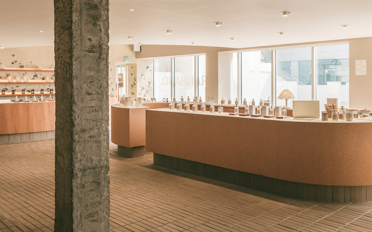 그리고 돌의 질감이 느껴지는 벽면과, 엔틱 한 바닥 타일, 깔끔한 화이트 천장, 코르크와 나무, 질감이 느껴지는 구조물들이 눈길을 사로잡는다. 다소 거친 텍스처들은 깔끔하게 잘 정돈되어 있는 가운데 일부는 잘 만들어진, 일부는 자연스럽게 러프한 형태를 갖춰 공간에 다채로운 시선을 더한다. 텍스처 요소들은 그랑핸드의 마음과 온기가 전달되는 섬세한 스토리텔링과 함께 제품이 가진 특징과 용기 등이 지닌 질감을 더욱 친근함을 느끼게 한다.