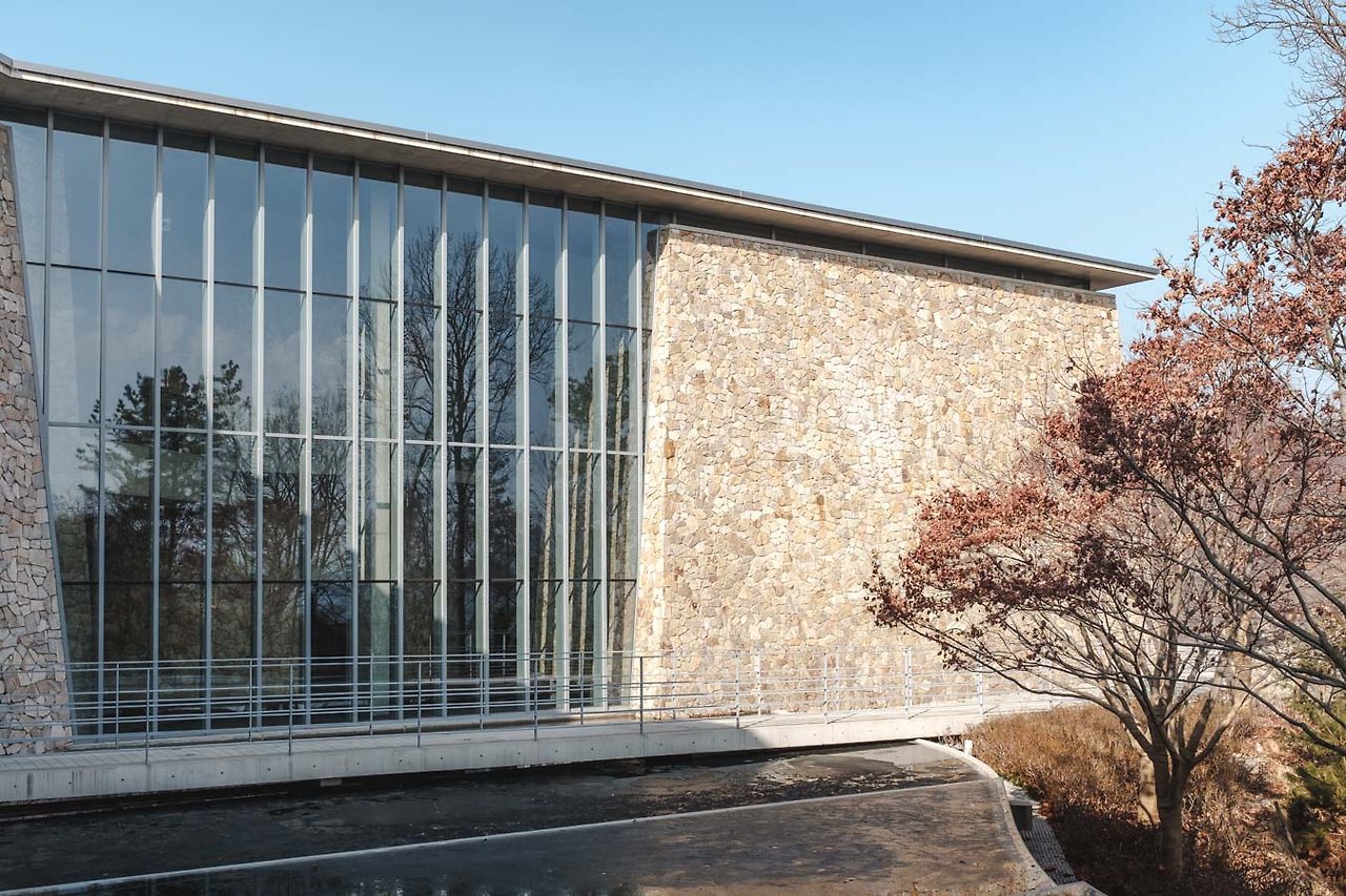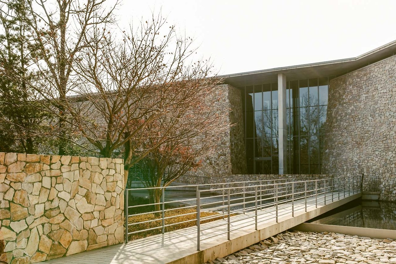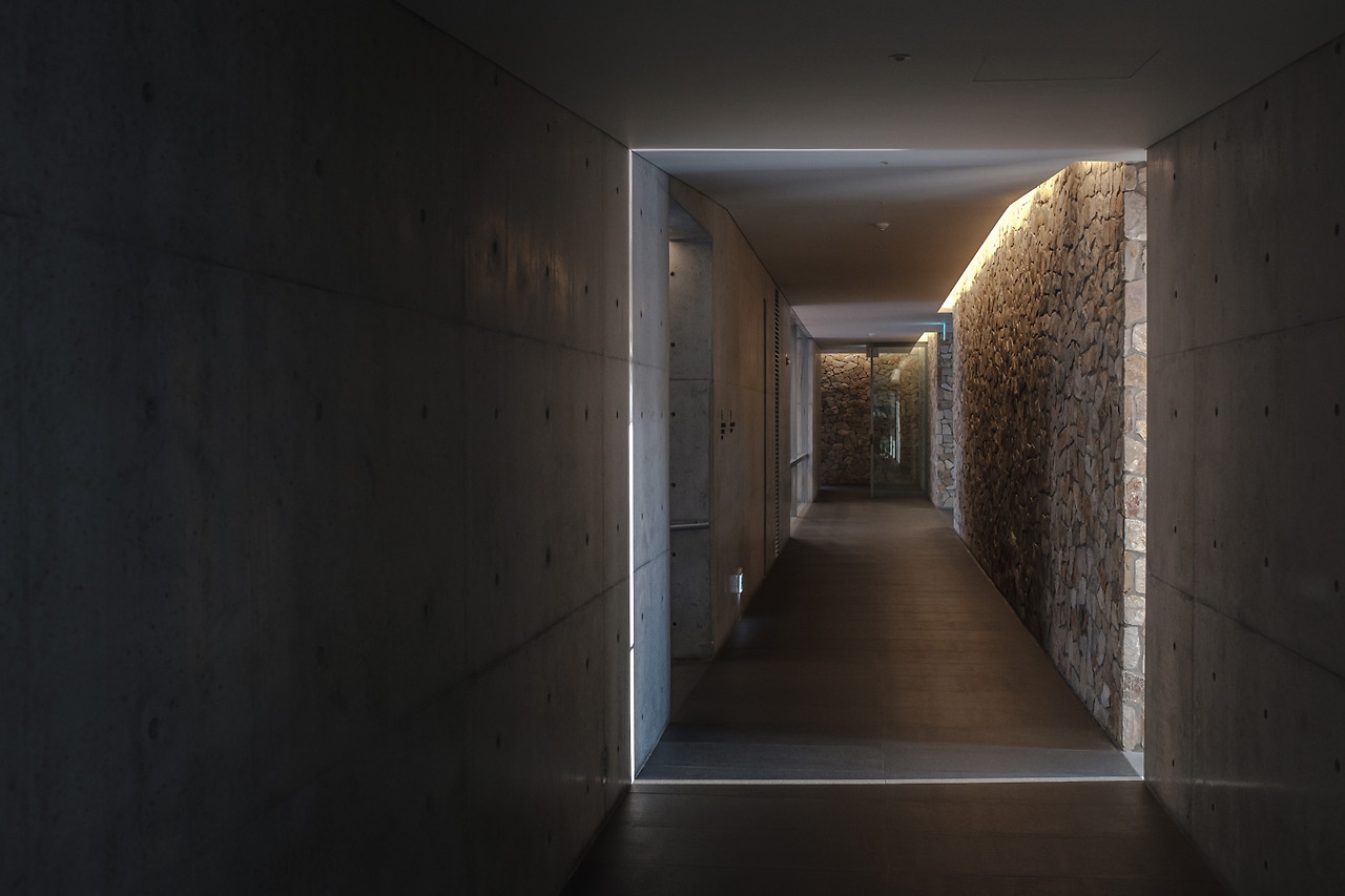 입구에 다다르면 가장 먼저 보이는 것이 돌이다. 산속에 감춰진 공간답게 수 없이 쪼개진 돌무더기들로 형성되어 마치 우리나라의 산성처럼 산을 끼고 있는 느낌이 든다. 건물의 입구는 그 건물의 첫인상을 나타내고 그 여운은 끝까지 간다. 노출 콘크리트가 아닌 돌을 사용한 이유가 여기 있지 않을까?