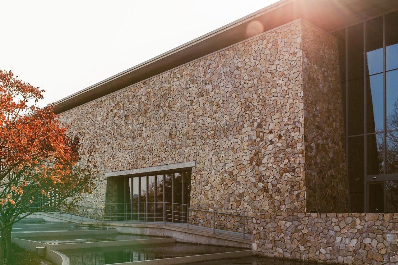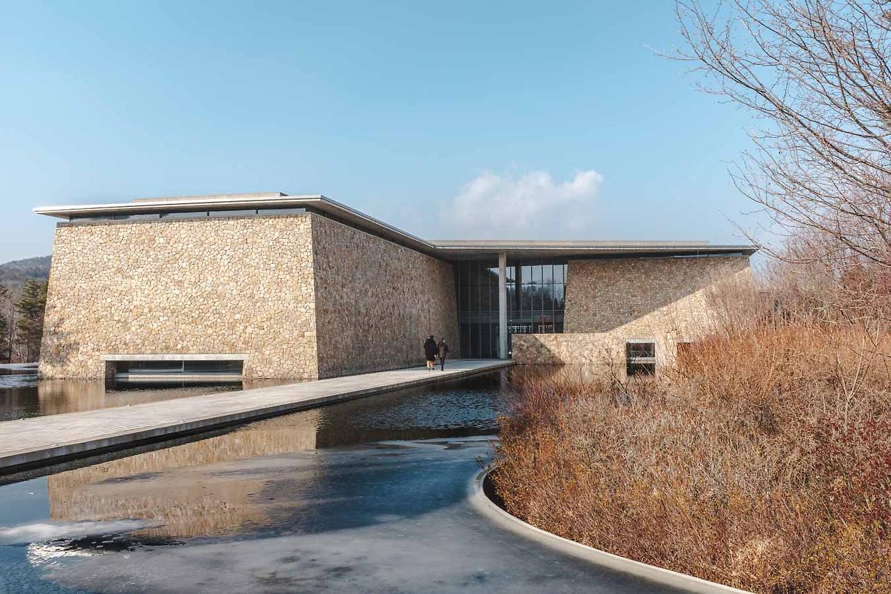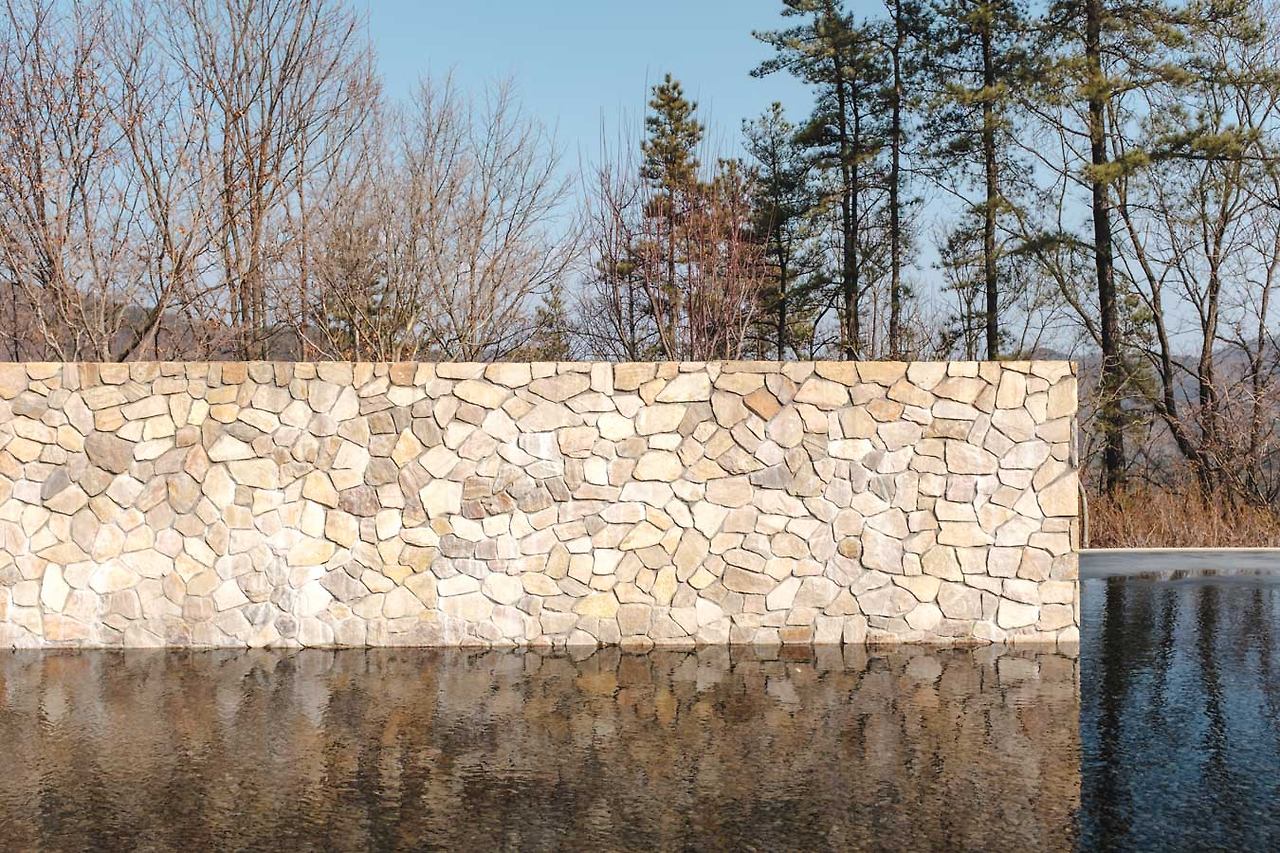 성벽처럼 쌓인 돌벽은 내부에 들어와서도 이어지고 하나씩 쌓은 정성이 느껴진다. 일직선으로 깔끔하게 마감된 노출 콘크리트와는 대조되어 더 두드러지게 보인다. 입구를 지나 경치를 빌려 산책을 하다 보면 고요한 물의 정원이 드러난다. 무거운 돌로 끊임없이 쌓인 박물관은 보기만 해도 묵직하게 느껴지는데 마치 물 위에 떠 있는 것처럼 느껴져 가볍고 고요하게 느껴지기까지 한다. 이는 물의 반사 성질 때문인데 이를 더 극대화하기 위해 또 다른 디테일을 찾아볼 수가 있다. 그것은 바로 물아래로 깔려 있는 해미석이다. 물은 검은색에 담겨 있을 때 더 선명한 풍경을 반사시킨다. 날이 좋은 날에는 내부에서도 물의 연흔 효과를 관찰할 수 있다.