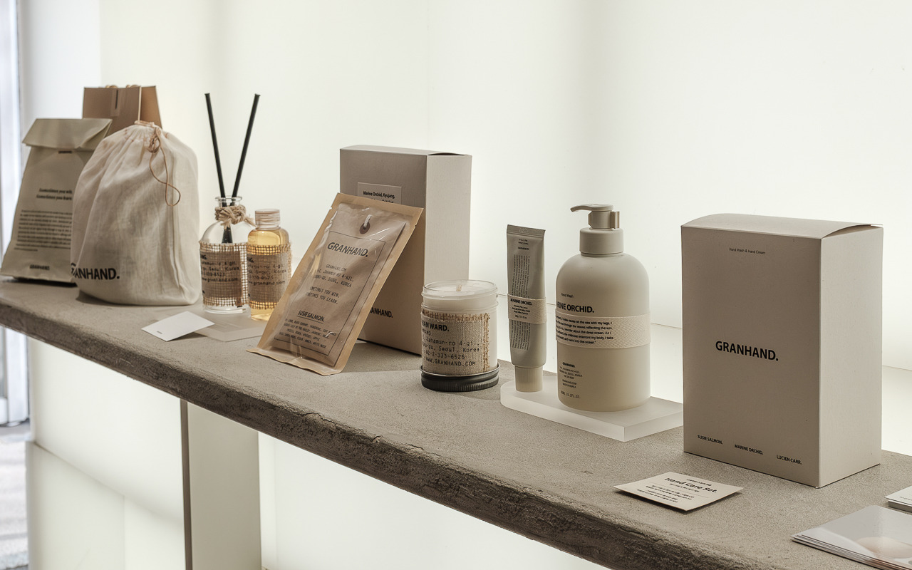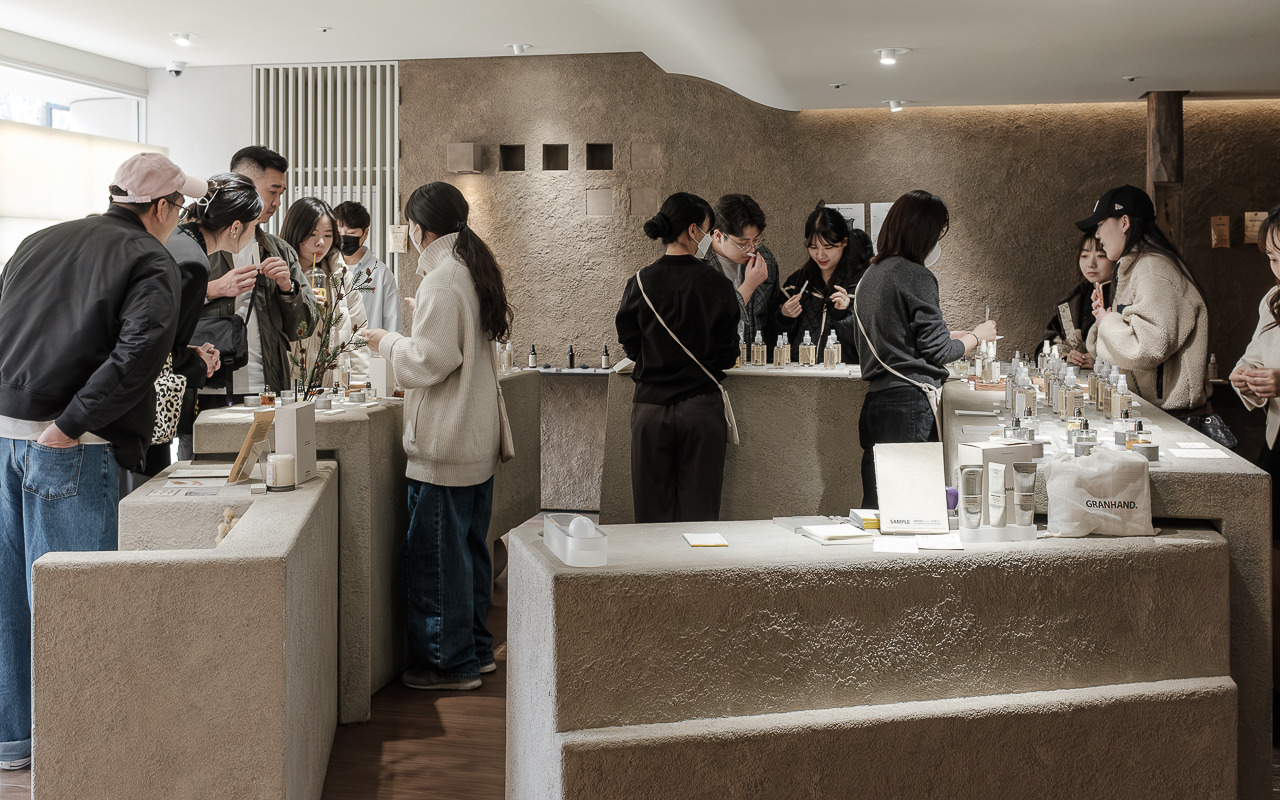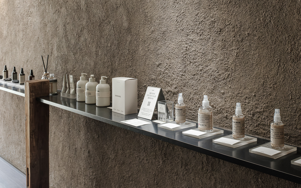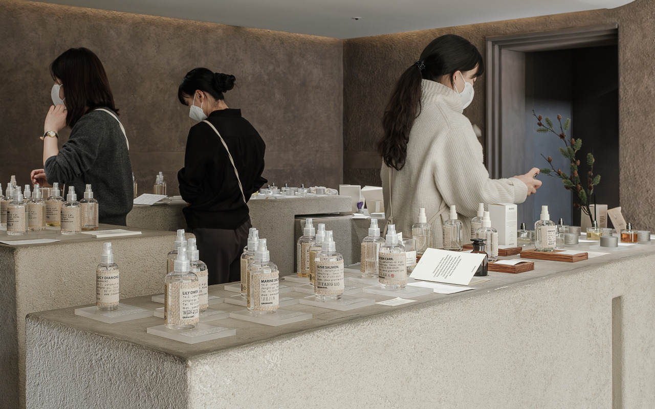 그랑핸드 마포점은 종로에 자리 잡은 그랑핸드 오프라인스토어와 차별화된 이미지가 특징이다. 기존 매장에서 한옥의 고즈넉함, 서까래의 자연 친화적인 느낌을 살려 제품과 함께 공간 경험을 전달했다면 마포점은 공간의 ‘질감’이 두드러진다. 거칠고, 부드럽고, 맑고, 불투명한 그랑핸드의 다양한 모습을 공간 안에 모두 표현했다. 어울리듯 어울리지 않는 텍스처들이 충돌하며 공존하고 또 흡수하며 새로운 복합적인 감각을 표출한다. 마치 우리가 향을 기억하는 과정처럼.