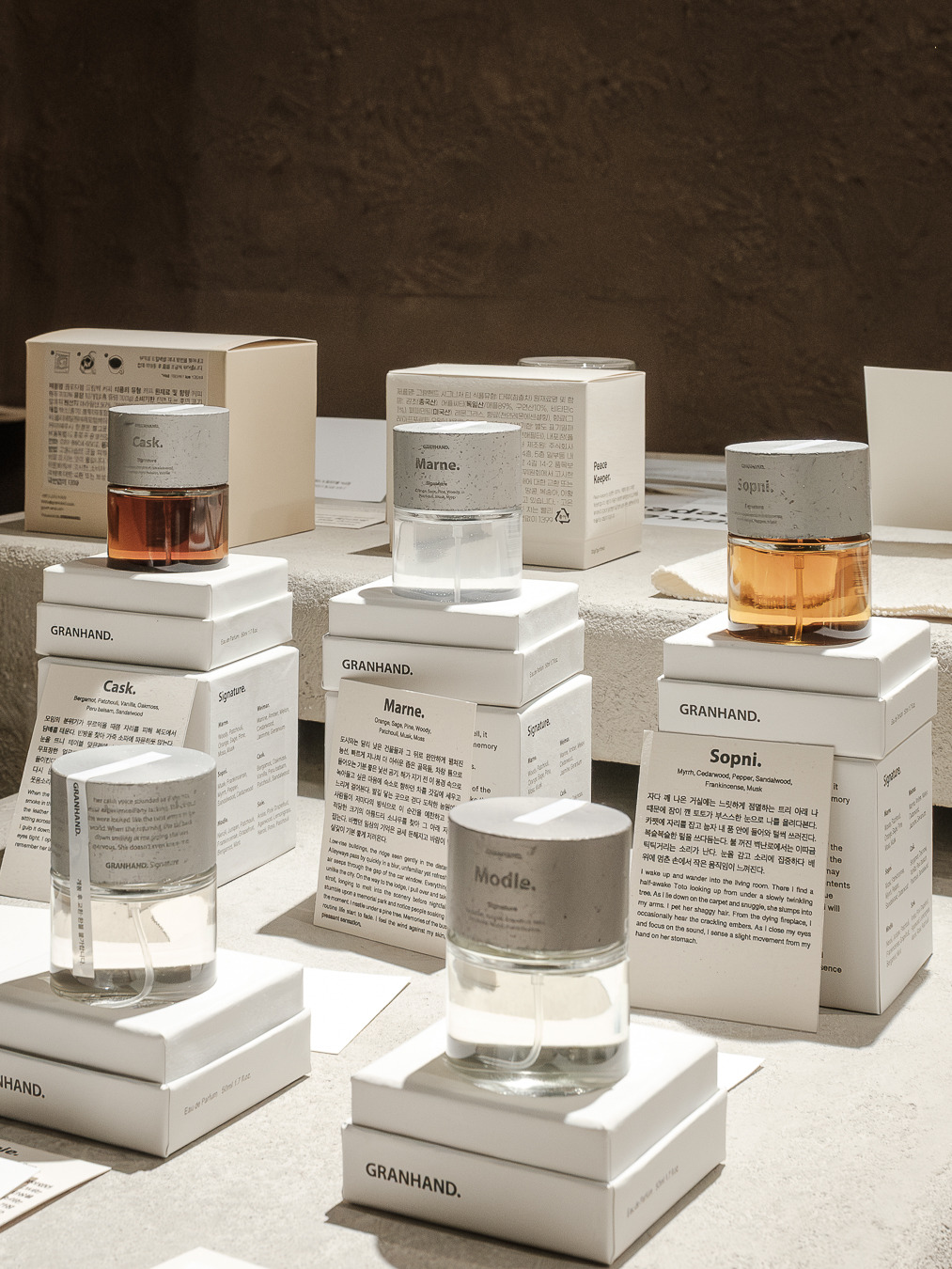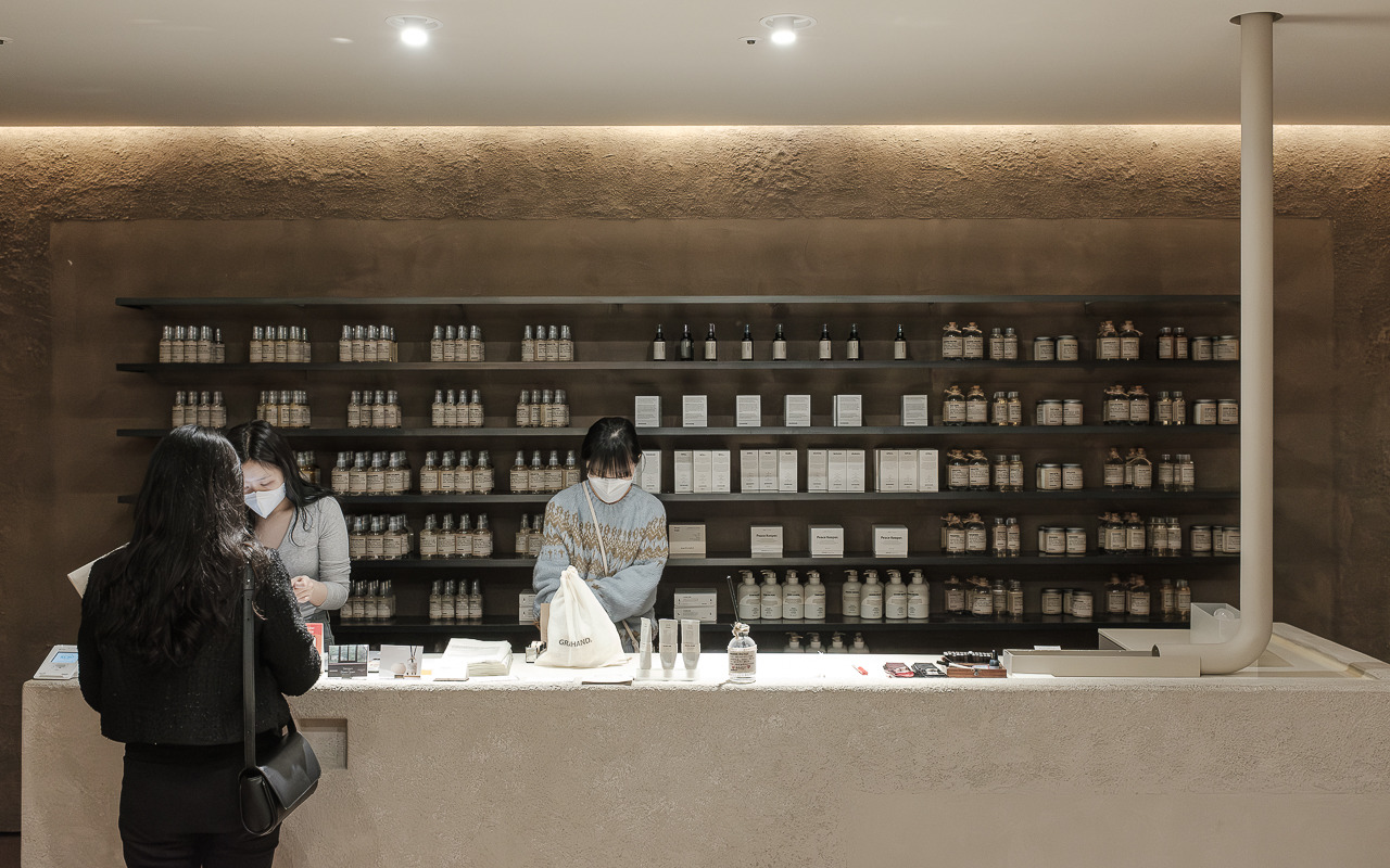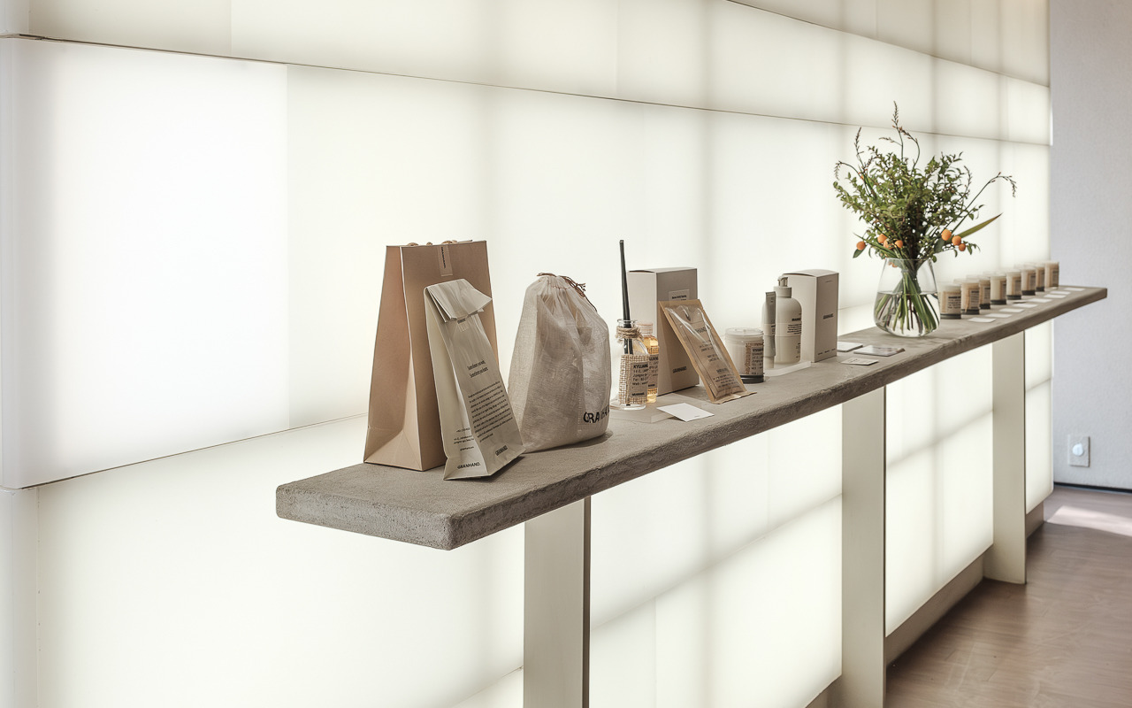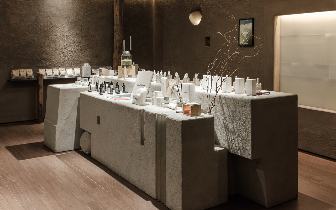 그랑핸드 마포점은 종로에 자리 잡은 그랑핸드 오프라인스토어와 차별화된 이미지가 특징이다. 기존 매장에서 한옥의 고즈넉함, 서까래의 자연 친화적인 느낌을 살려 제품과 함께 공간 경험을 전달했다면 마포점은 공간의 ‘질감’이 두드러진다. 거칠고, 부드럽고, 맑고, 불투명한 그랑핸드의 다양한 모습을 공간 안에 모두 표현했다. 어울리듯 어울리지 않는 텍스처들이 충돌하며 공존하고 또 흡수하며 새로운 복합적인 감각을 표출한다. 마치 우리가 향을 기억하는 과정처럼.