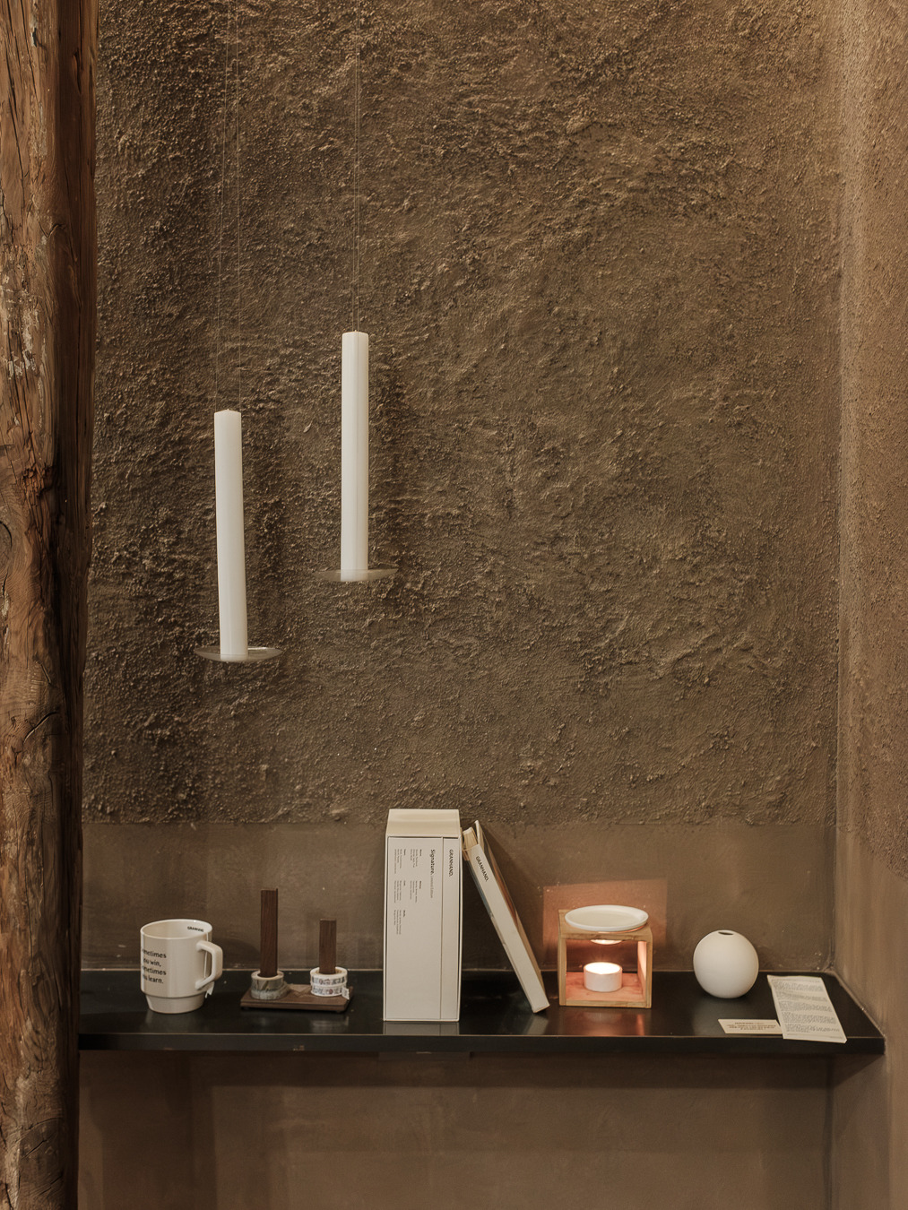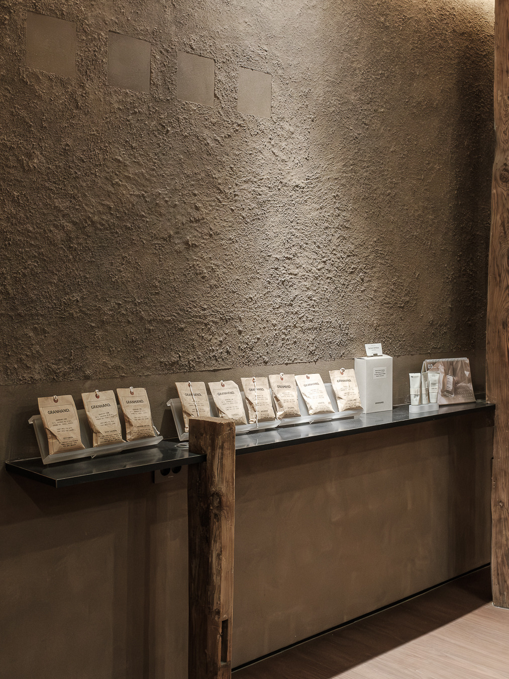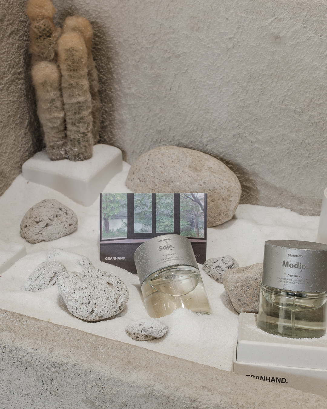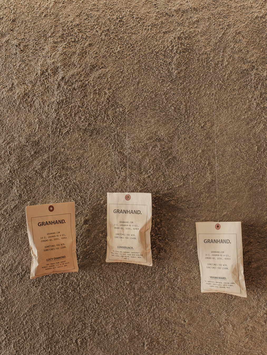 그랑핸드 마포점은 종로에 자리 잡은 그랑핸드 오프라인스토어와 차별화된 이미지가 특징이다. 기존 매장에서 한옥의 고즈넉함, 서까래의 자연 친화적인 느낌을 살려 제품과 함께 공간 경험을 전달했다면 마포점은 공간의 ‘질감’이 두드러진다. 거칠고, 부드럽고, 맑고, 불투명한 그랑핸드의 다양한 모습을 공간 안에 모두 표현했다. 어울리듯 어울리지 않는 텍스처들이 충돌하며 공존하고 또 흡수하며 새로운 복합적인 감각을 표출한다. 마치 우리가 향을 기억하는 과정처럼.
