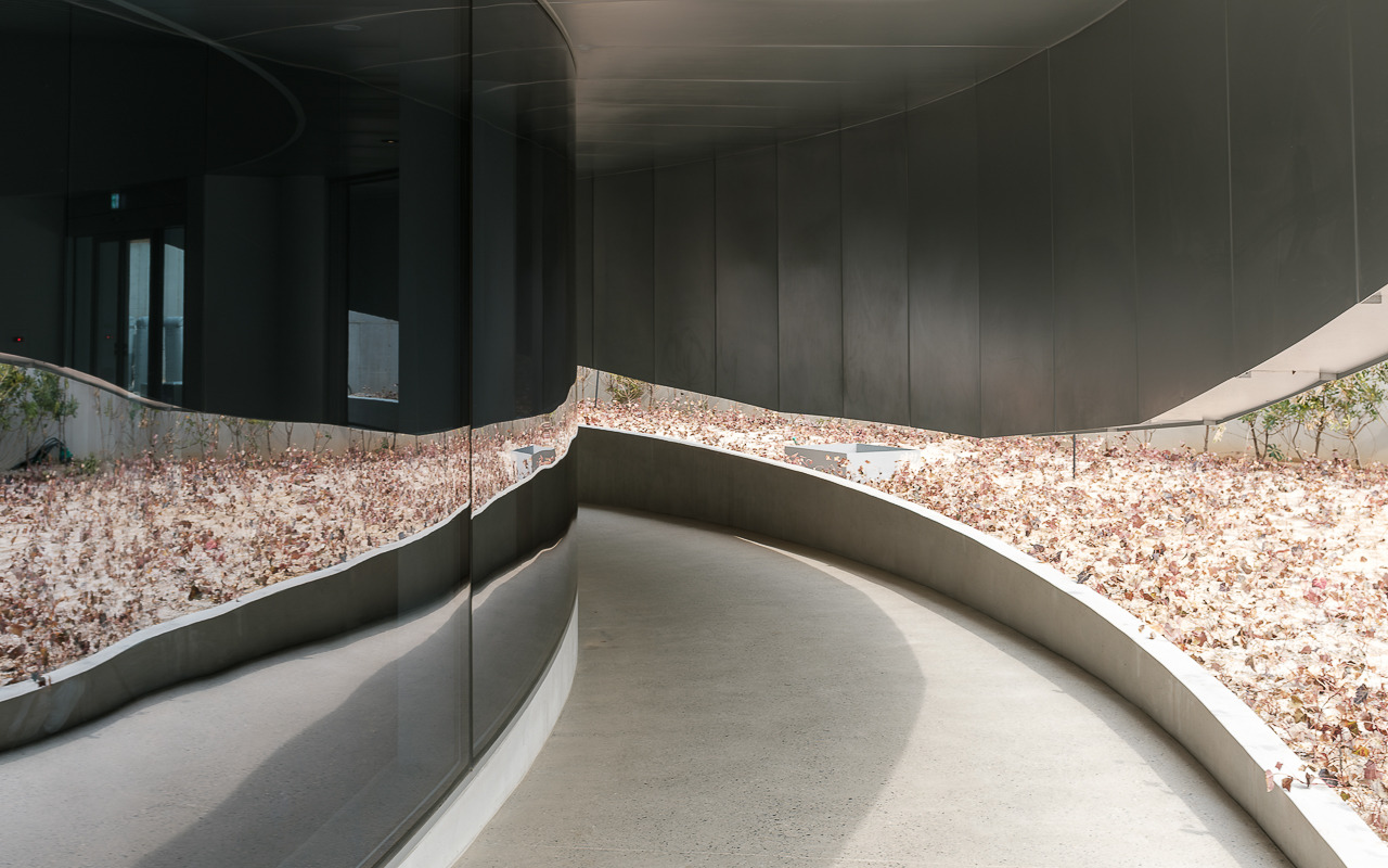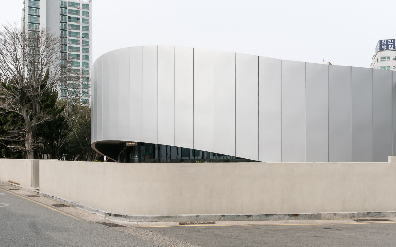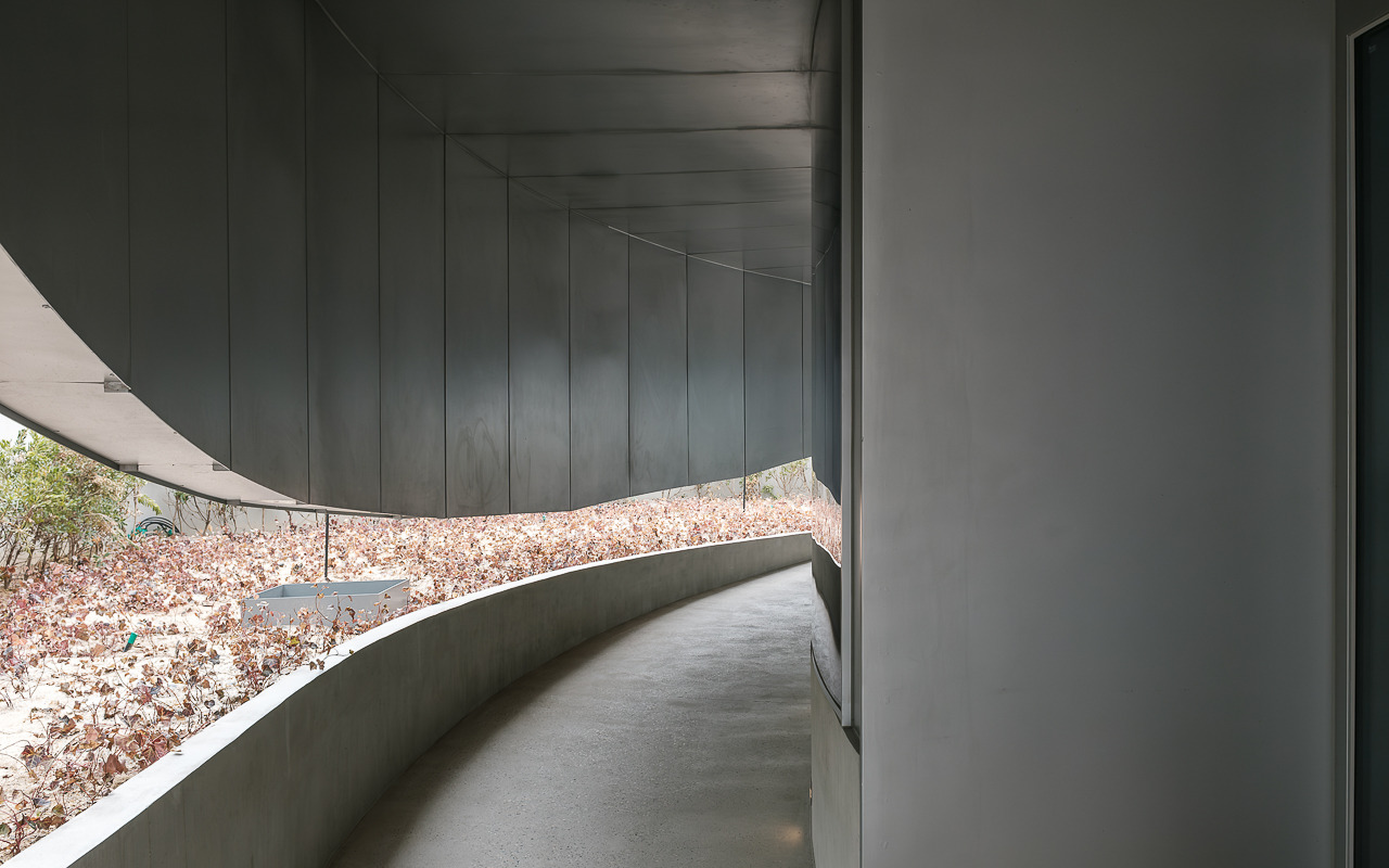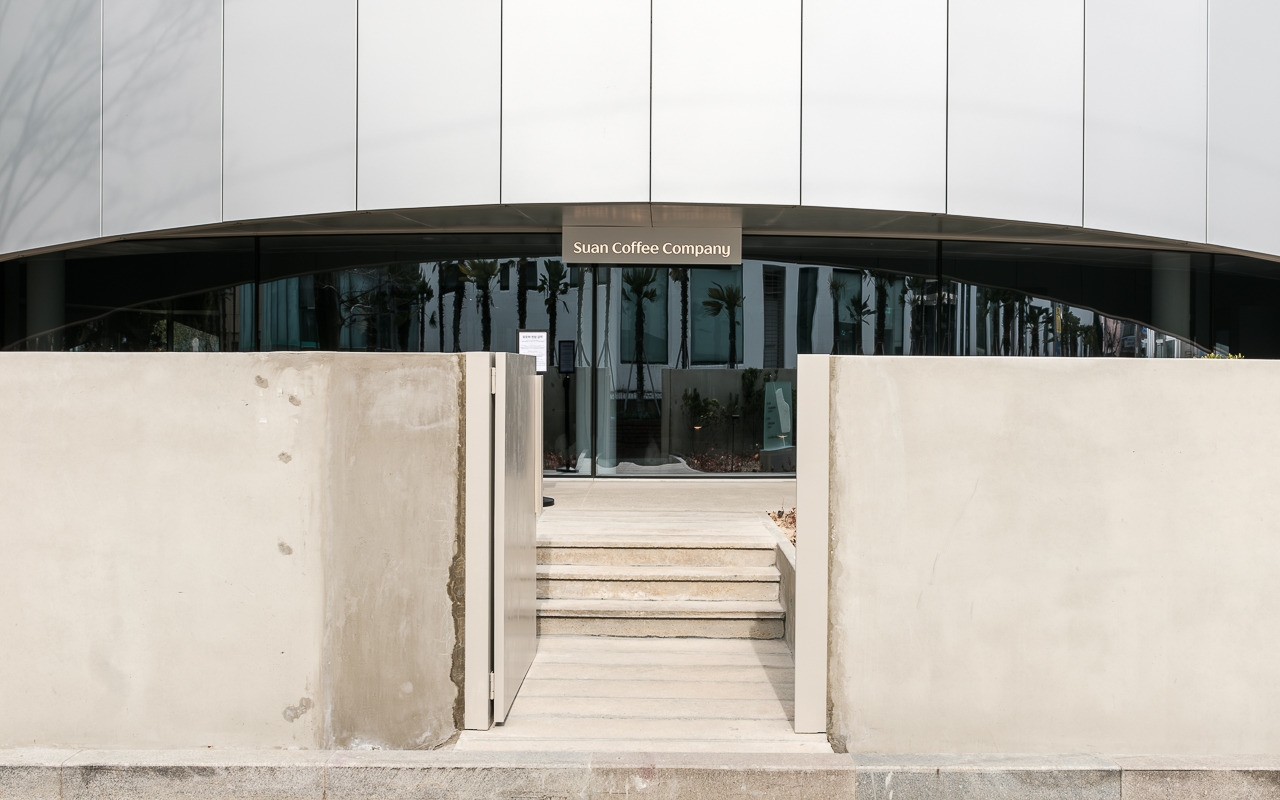 콘크리트 담장 너머 보이는 수안커피 플래그십스토어는 건물 주변을 맴돌지 않으면 어디가 입구인지 찾기도 쉽지 않다. 멀리 떨어져 보면 미술관 혹은 공연장 같아 보이기도 한다. 처음 보면 무엇을 하는 공간인지 용도를 알 수 없어도 보이는 외관의 형태는 인지할 수 있다. 땅에 내려앉은 건축은 뫼비우스 띠처럼 원형의 곡선으로 땅에 길게 내려앉아 있다. 대지 안으로 들어가기 전까지 창과 창호 같은 건축 요소를 찾아볼 수 없다. 이러한 건축 요소를 숨김으로써 수안커피의 건축은 방문객들에게 상상력을 불어넣는다.