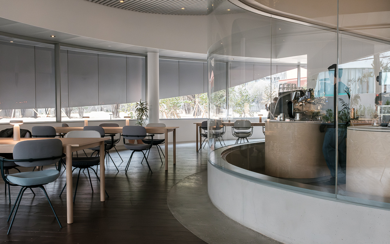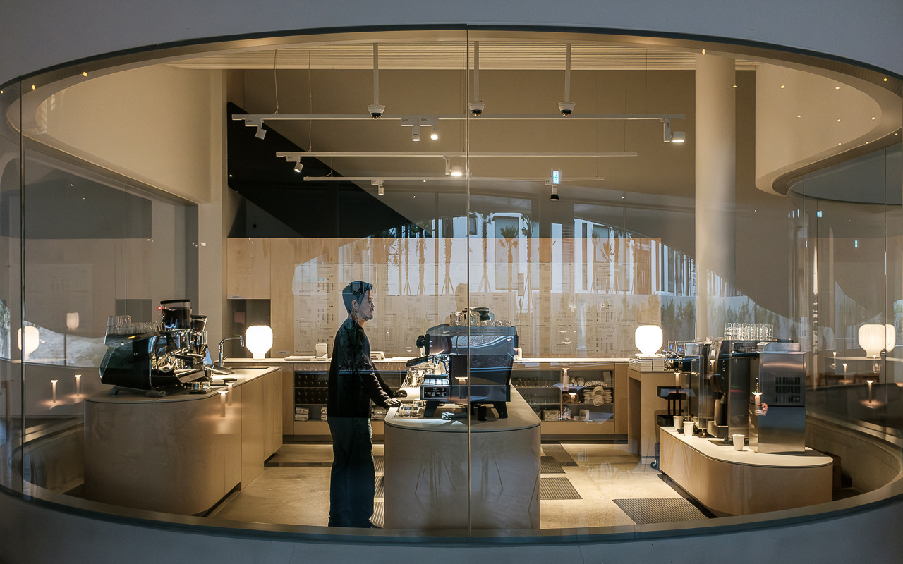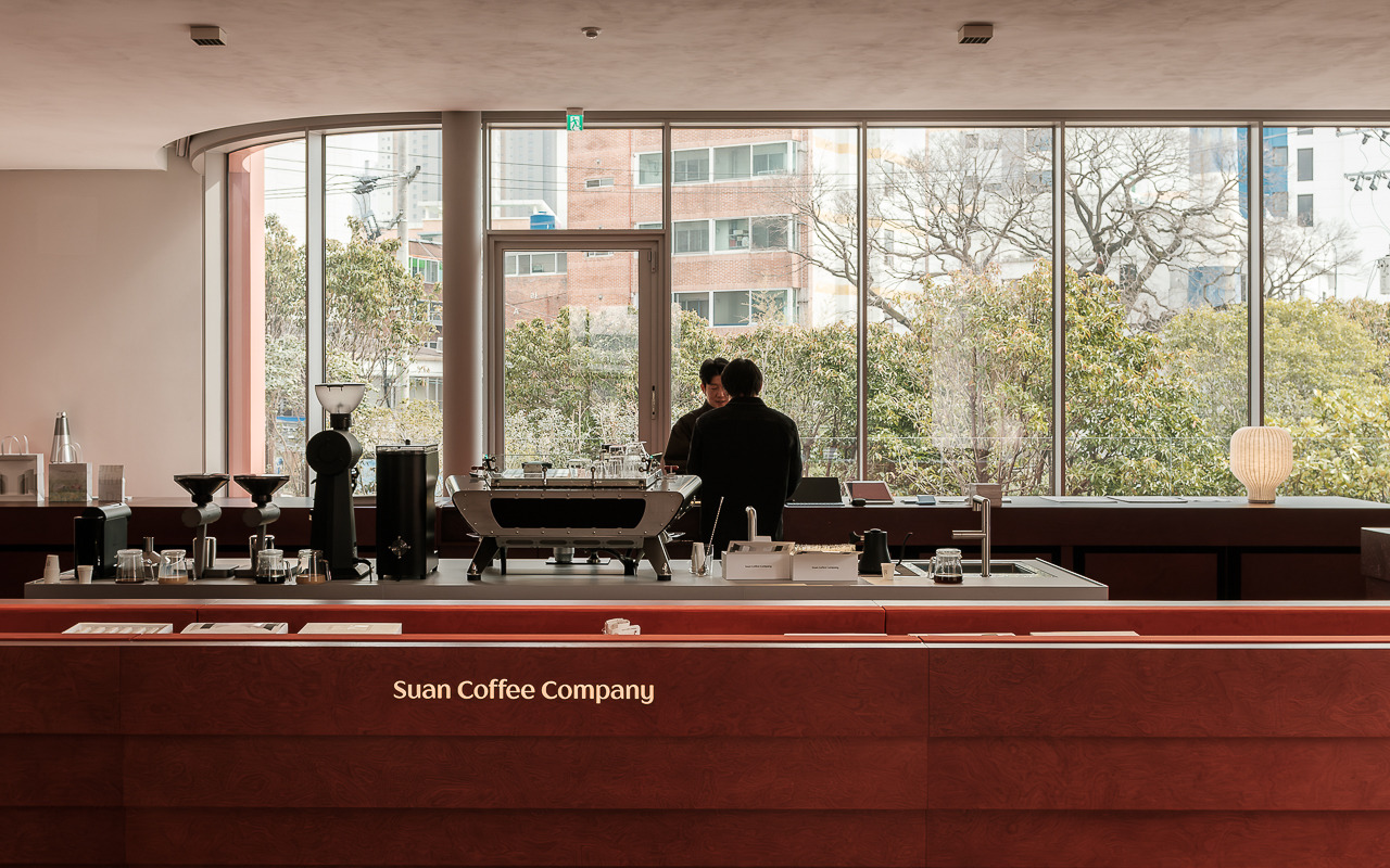 수안커피는 이 모습을 그대로 보여주는데 그 모습을 보고 있으면 한 편의 공연을 보고 있는 것 같다. 내부 공간은 커피를 추출하는 바와 커피를 마실 수 있는 좌석이 곡면 유리벽을 사이로 구분된다.