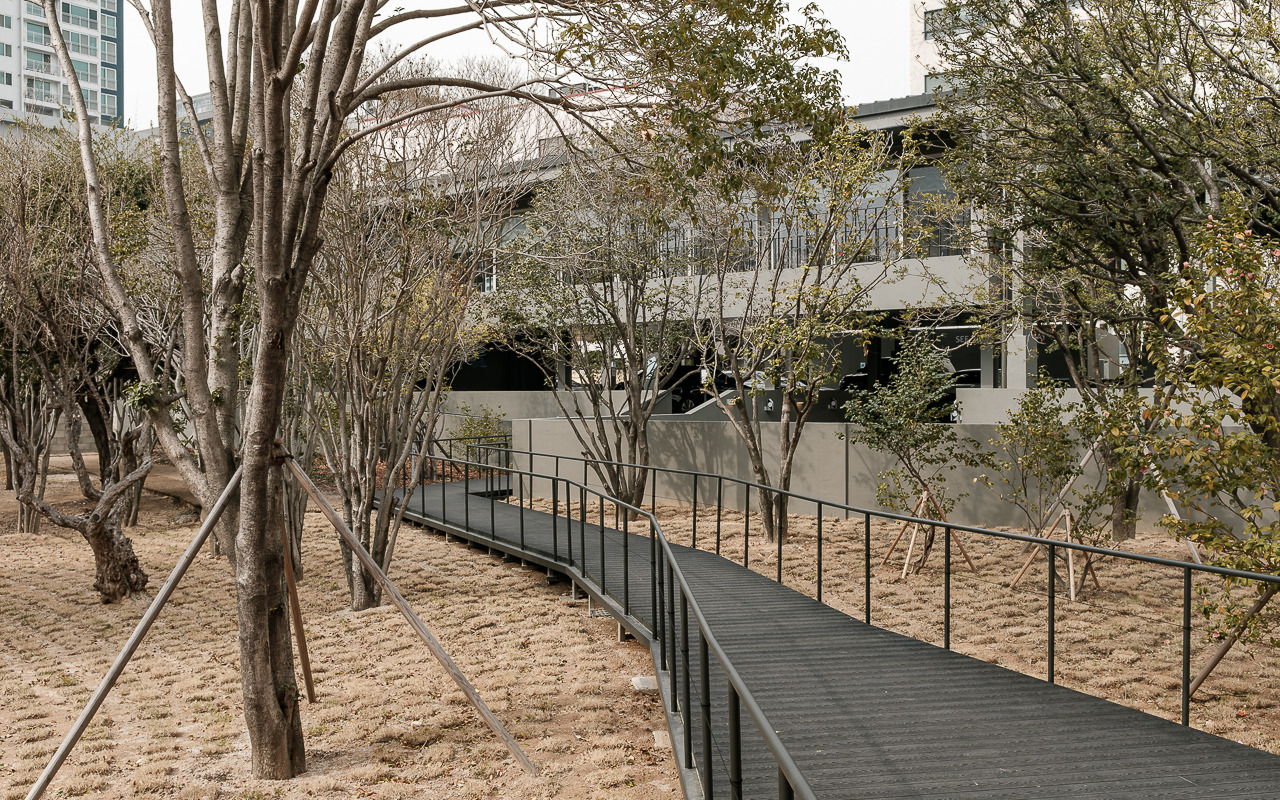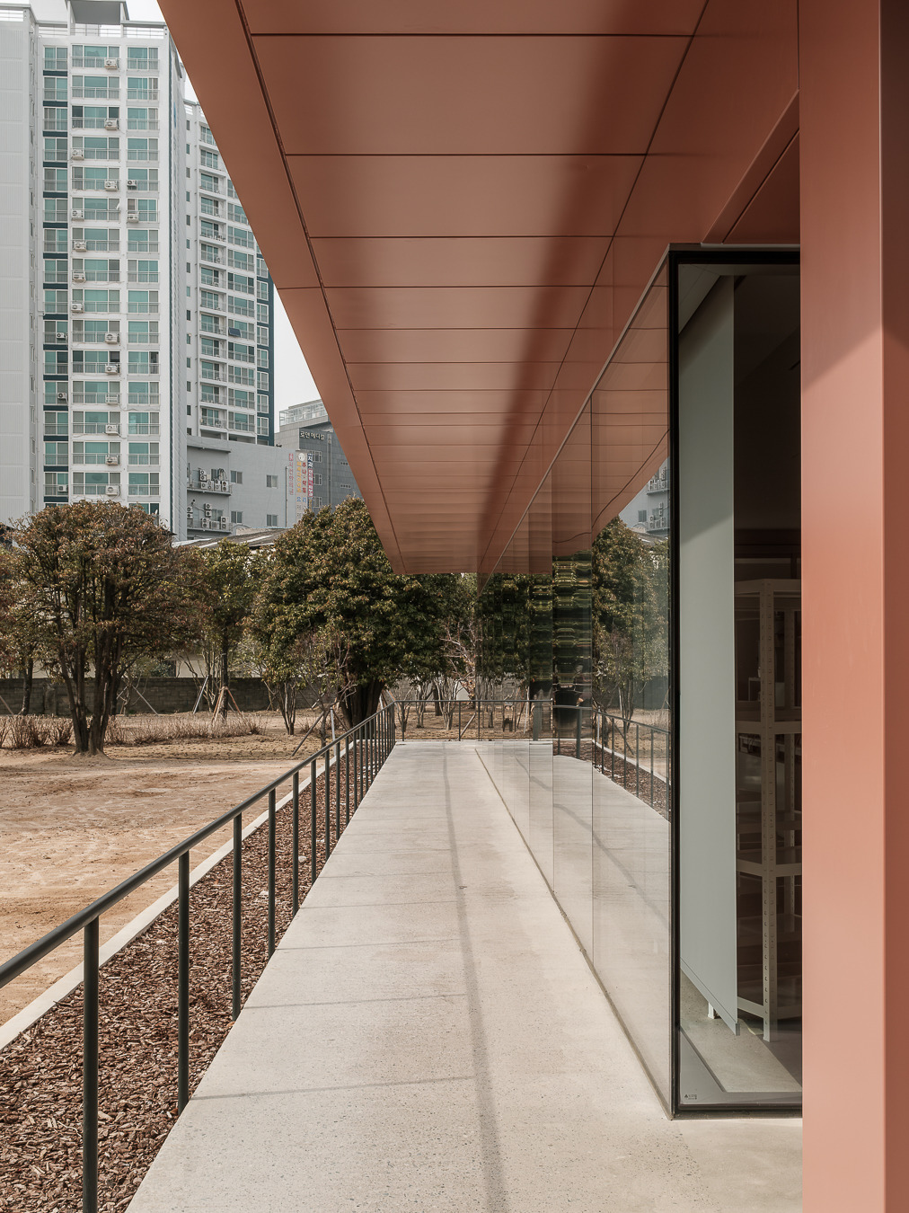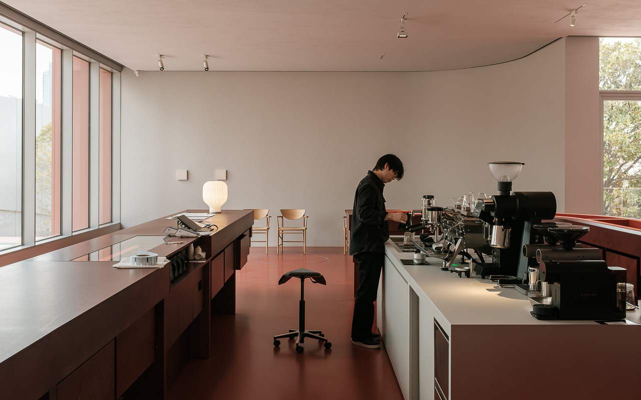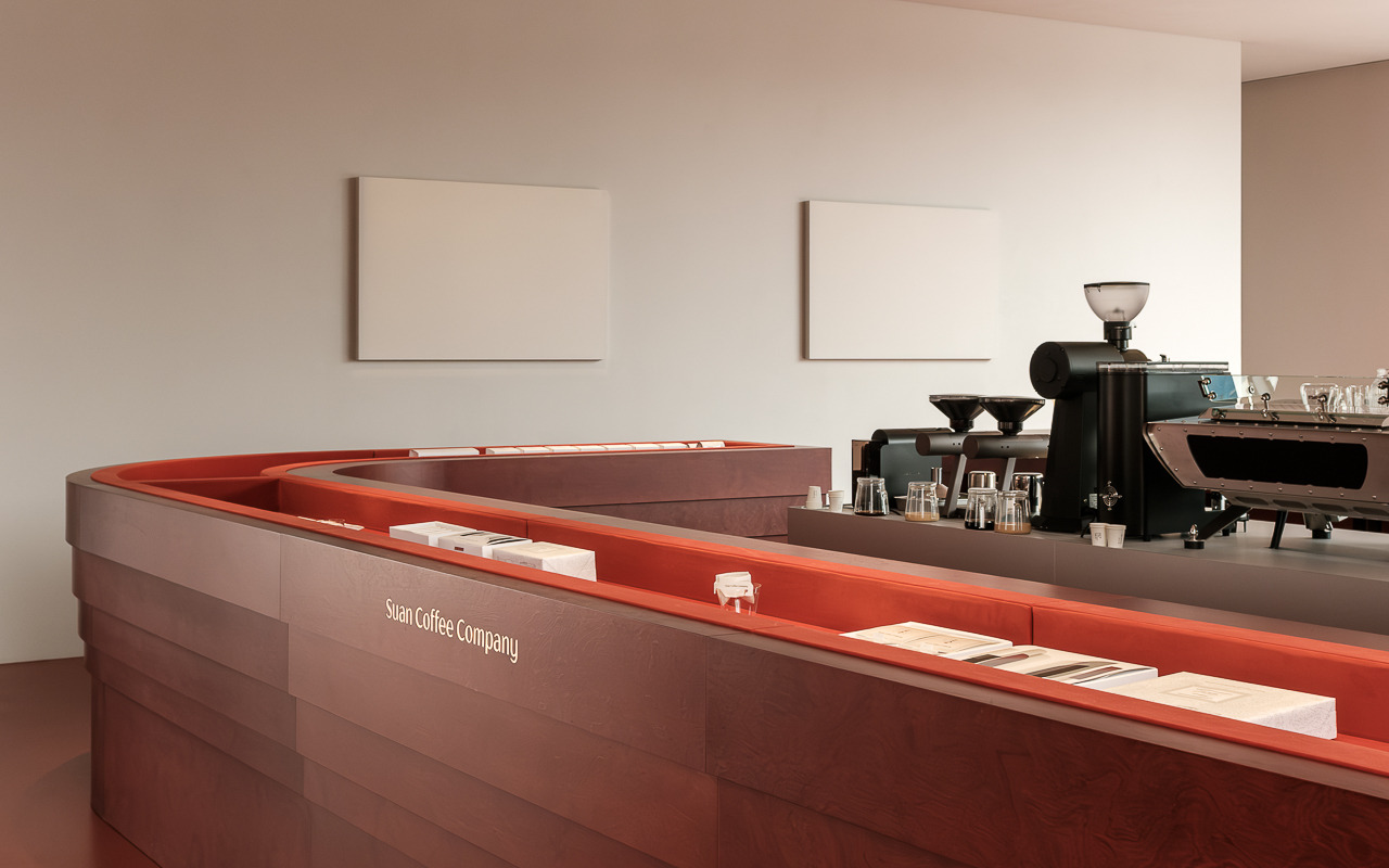 모서리 땅에 자리 잡은 원통의 건물을 벗어나 경사로 데크를 따라 걷다 보면 야외정원의 고객 공간을 넘어 어린 나무들 사이 붉게 펼쳐진 건물의 모습이 보인다. 바깥의 삼거리에서는 볼 수 없었던 숨겨진 공간에 다다르니 수안커피가 그리는 여정 그 어딘가를 걷고 있는 기분이다.