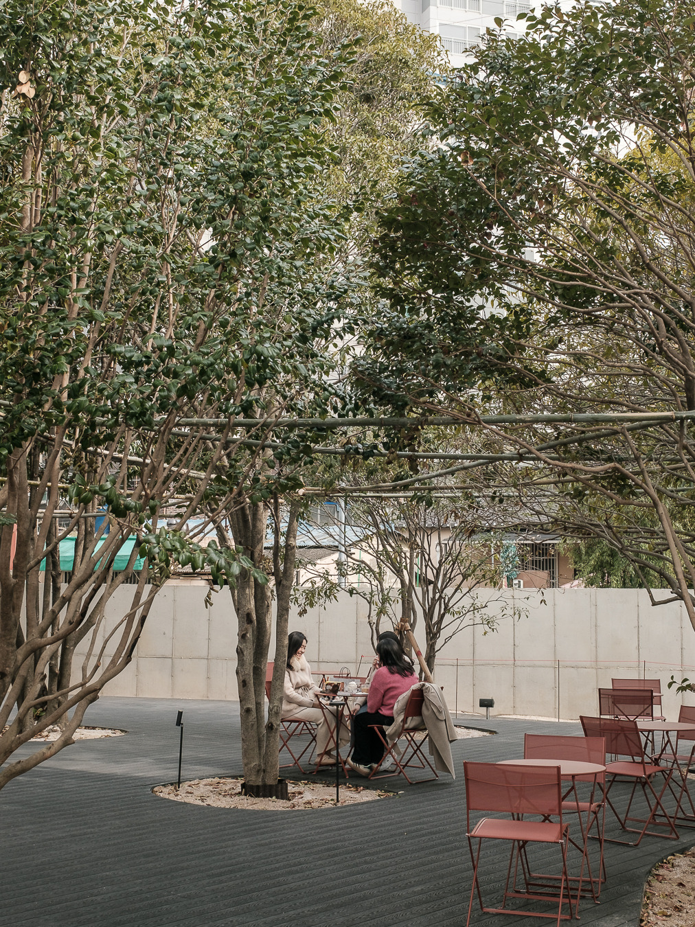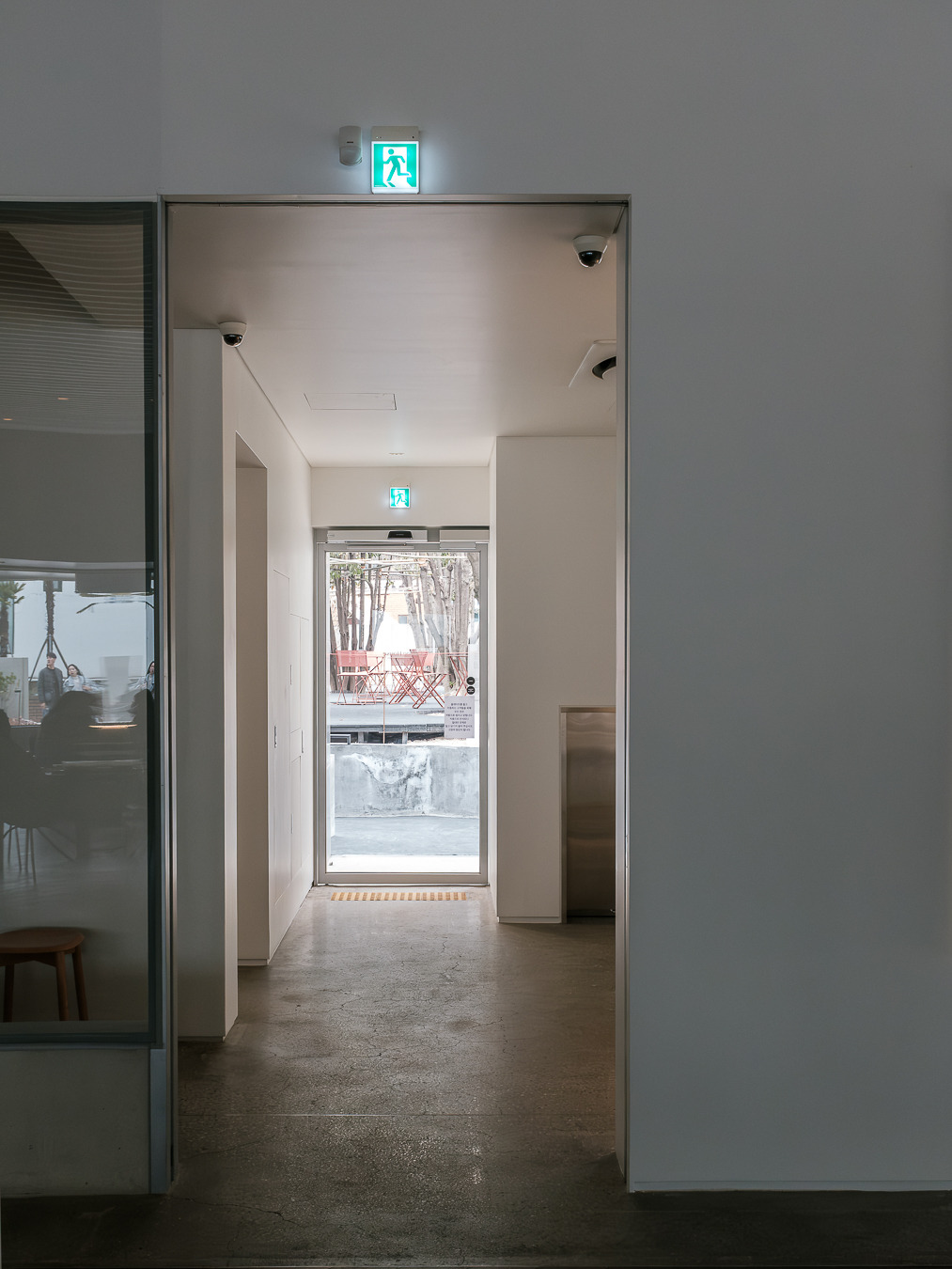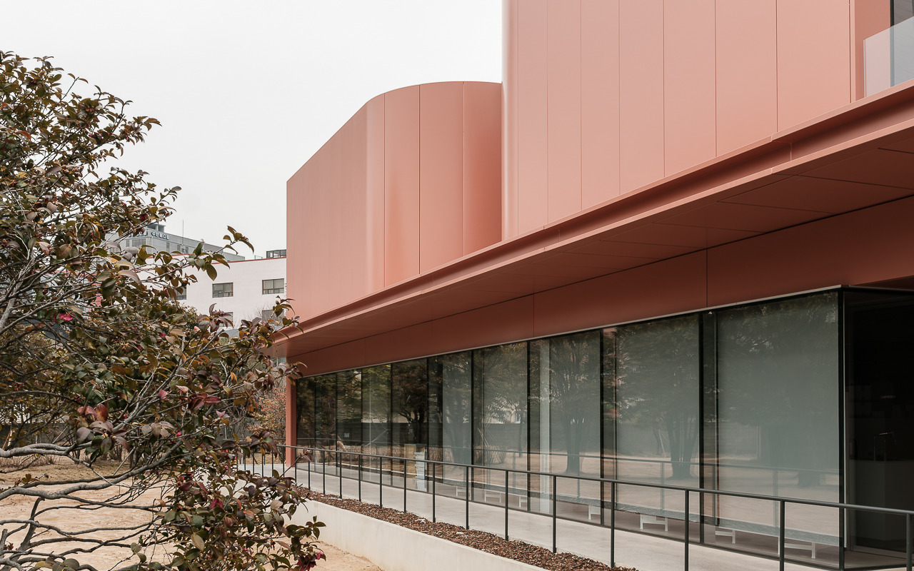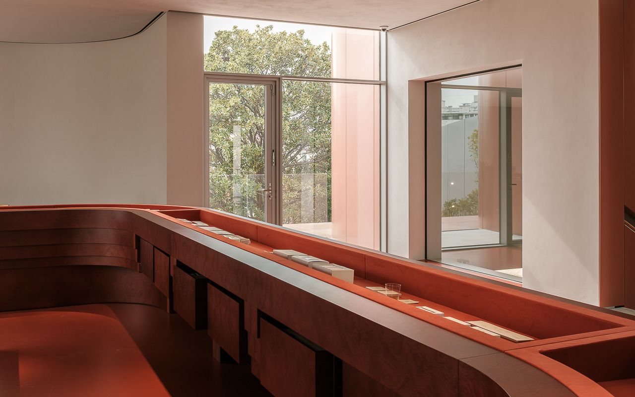 모서리 땅에 자리 잡은 원통의 건물을 벗어나 경사로 데크를 따라 걷다 보면 야외정원의 고객 공간을 넘어 어린 나무들 사이 붉게 펼쳐진 건물의 모습이 보인다. 바깥의 삼거리에서는 볼 수 없었던 숨겨진 공간에 다다르니 수안커피가 그리는 여정 그 어딘가를 걷고 있는 기분이다.
