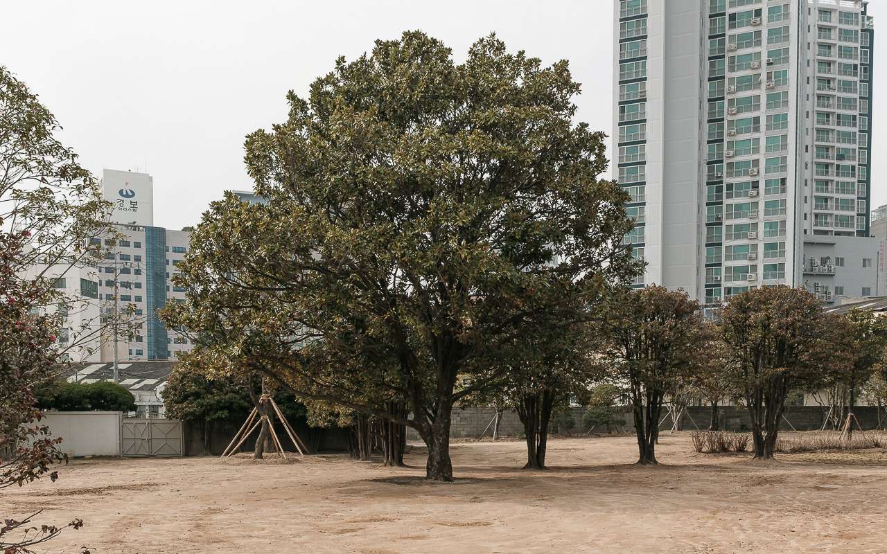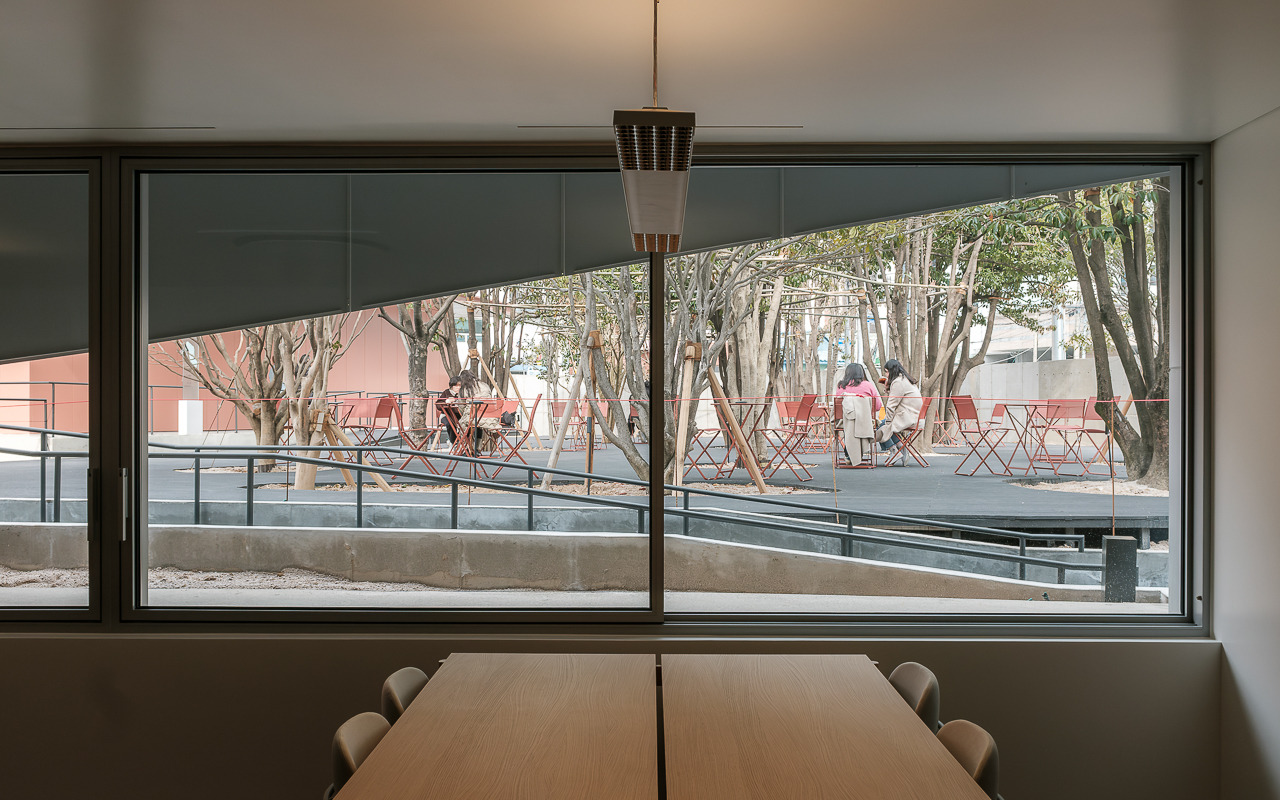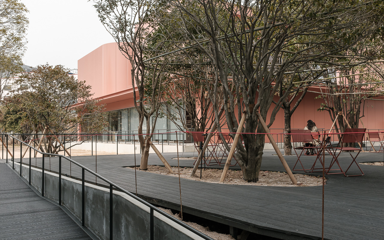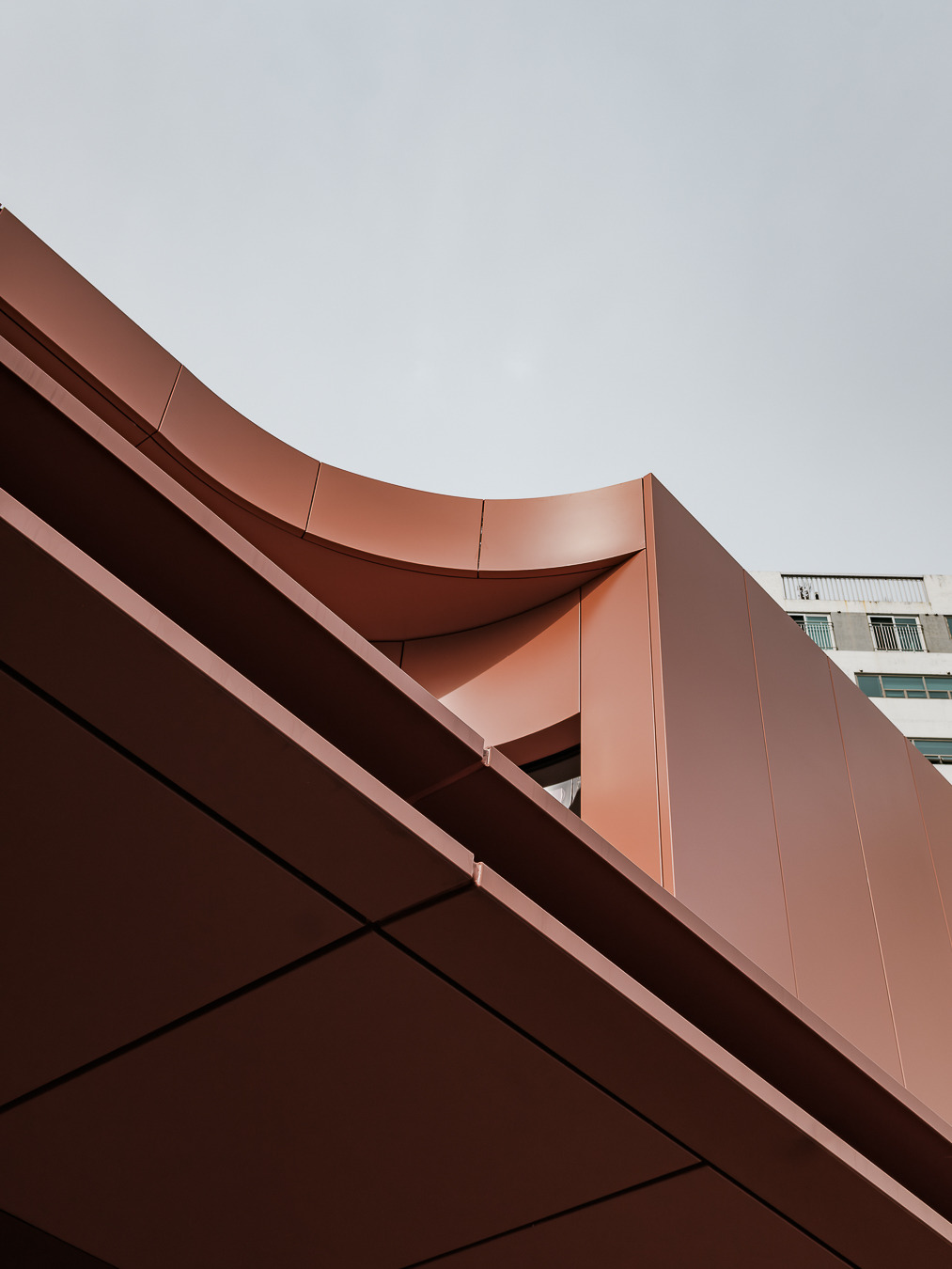 모서리 땅에 자리 잡은 원통의 건물을 벗어나 경사로 데크를 따라 걷다 보면 야외정원의 고객 공간을 넘어 어린 나무들 사이 붉게 펼쳐진 건물의 모습이 보인다. 바깥의 삼거리에서는 볼 수 없었던 숨겨진 공간에 다다르니 수안커피가 그리는 여정 그 어딘가를 걷고 있는 기분이다.