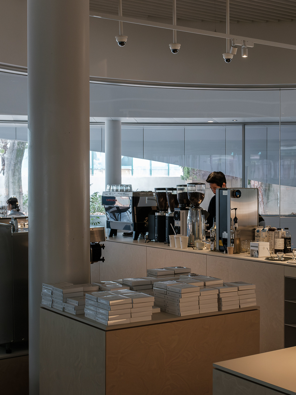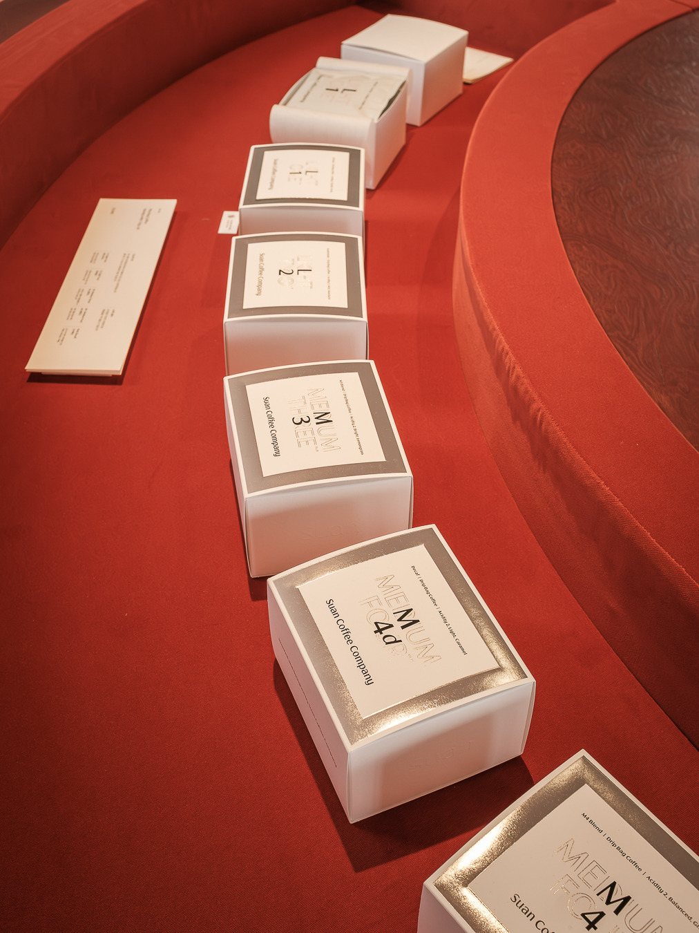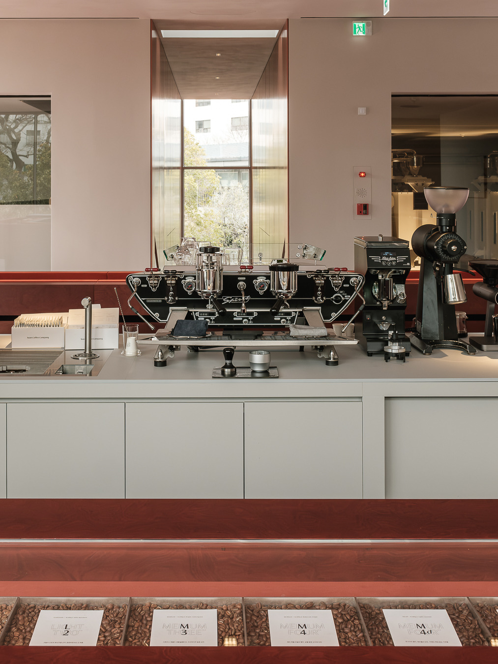 ‘ㄷ’자 형태의 가구는 바리스타 바의 옅은 회색의 색감과 대비를 이루고 나무 소재를 베이스로 레이어를 쌓은 간결한 형태와 패브릭 소재를 얹어 디자인되었다. 방문객들은 제품을 집어보기도, 바리스타의 설명과 함께 시음을 통해 다양한 감각으로 커피를 느낀다.
