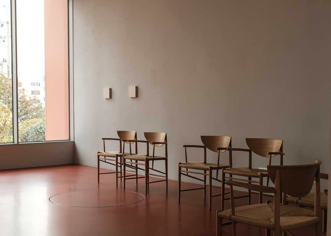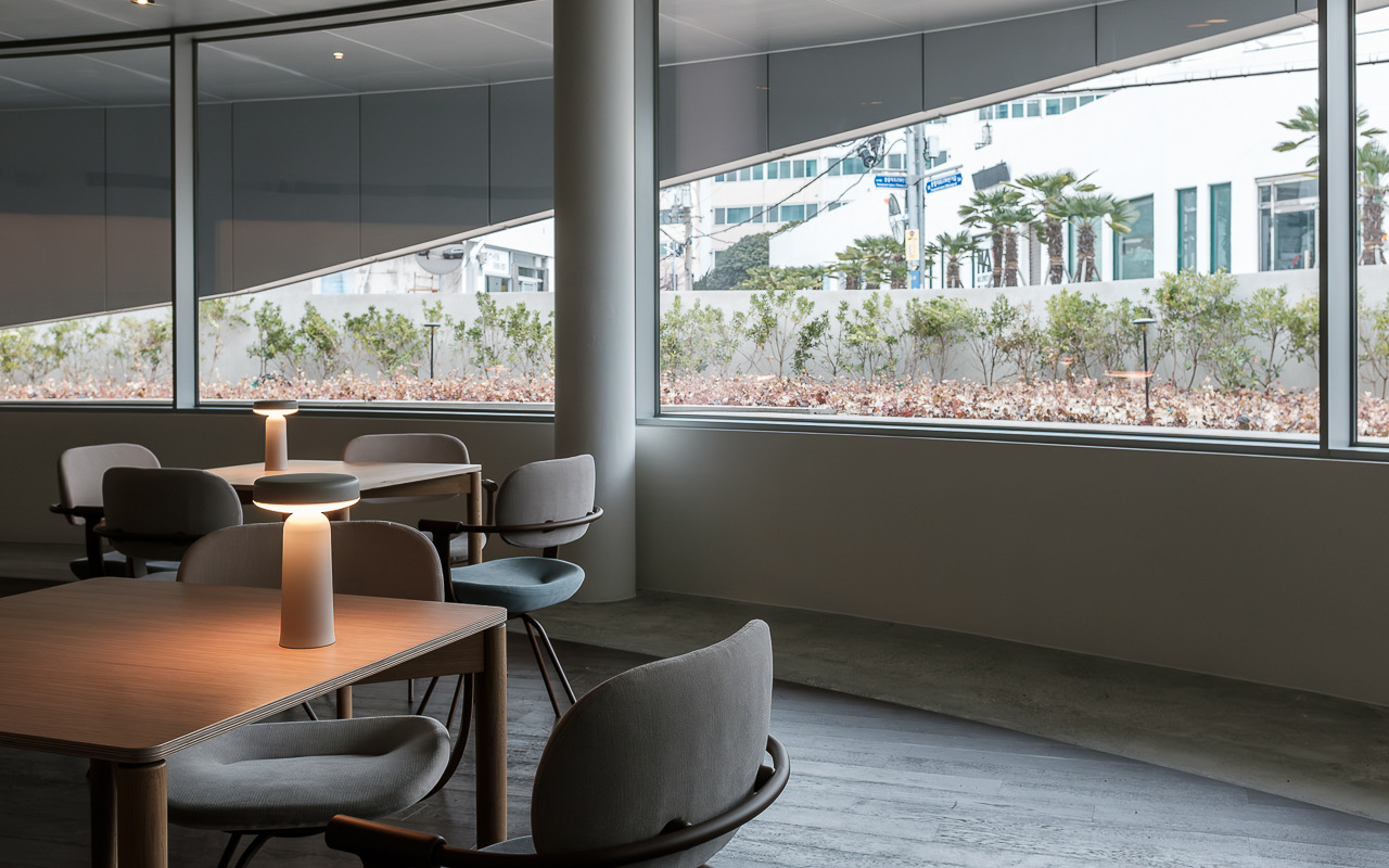 통유리를 통해 최소한의 조도만으로 채워진 공간은 깔끔하고 군더더기 없이 정돈된 디자인이다. 중앙에 자리한 가구를 제외한 그 어떠한 것도 존재하지 않는다. 바닥과 벽은 경계선에서 색으로 나뉘어 칠해졌고, 진열가구는 바닥의 색과 동일하게 입혀 하나의 면처럼 보이게끔 만들었다. 덕분에 공간은 확 트인 개방감과 동시에 깔끔하게 정돈된 느낌이 빛을 발한다.
