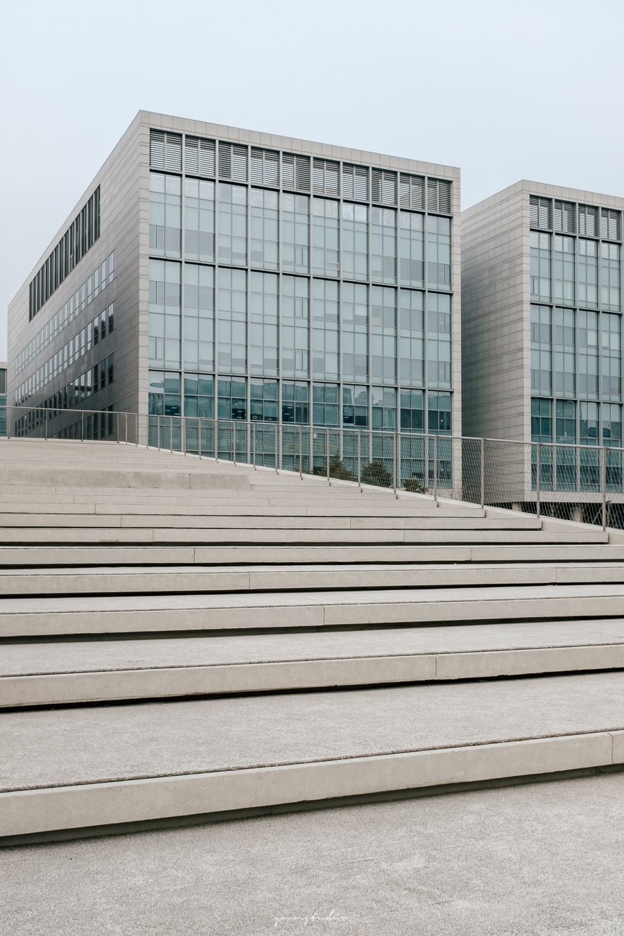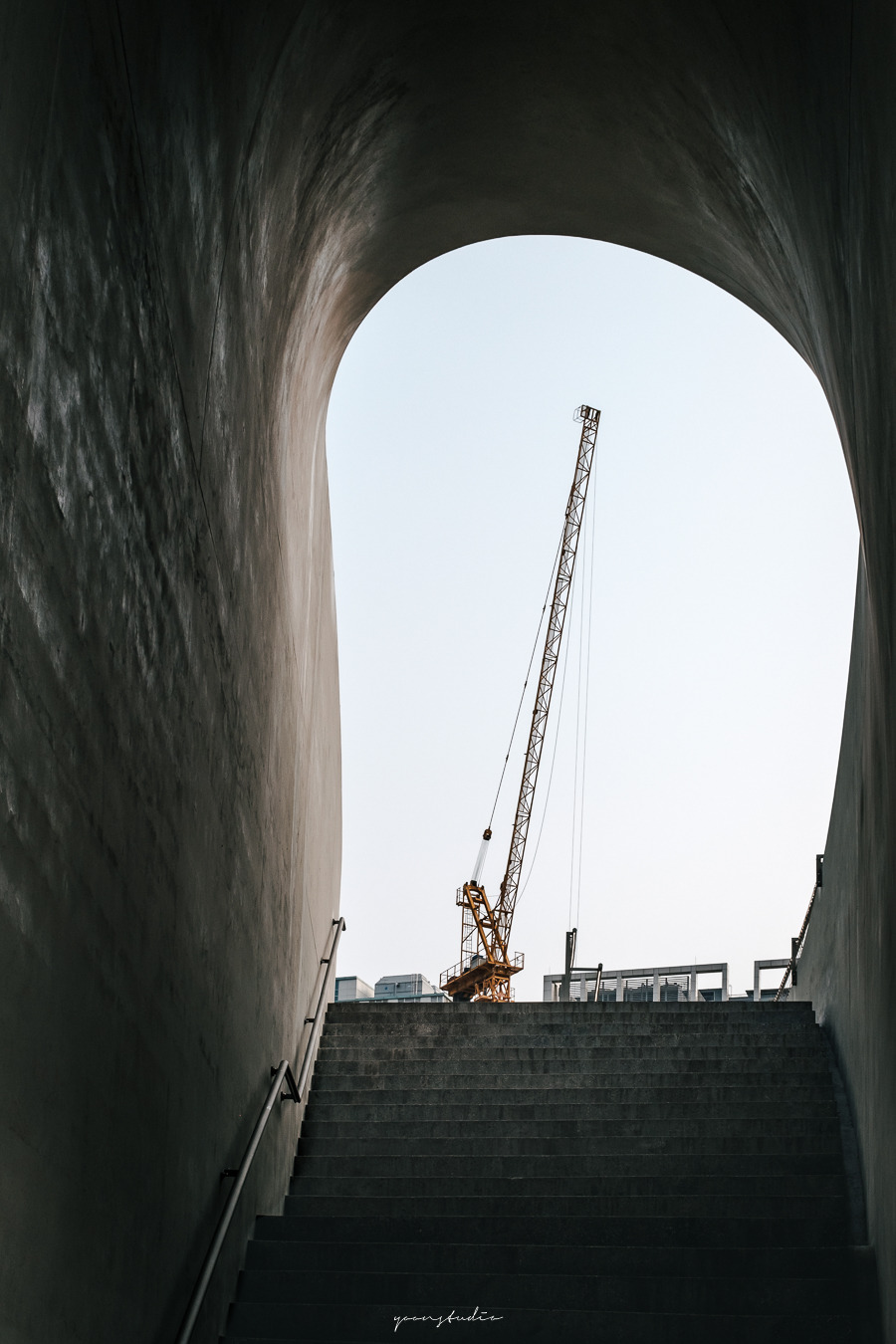 자연스럽게 동선을 유도하는 콘크리트 계단을 올라가면 주변 산업단지를 더 크게 경험할 수 있다. 사진에서 보듯이 뒤에 보이는 건물 역시 동일한 재료로 마감이 되어 마치 한 공간에 있는 듯한 느낌을 받기까지 한다.