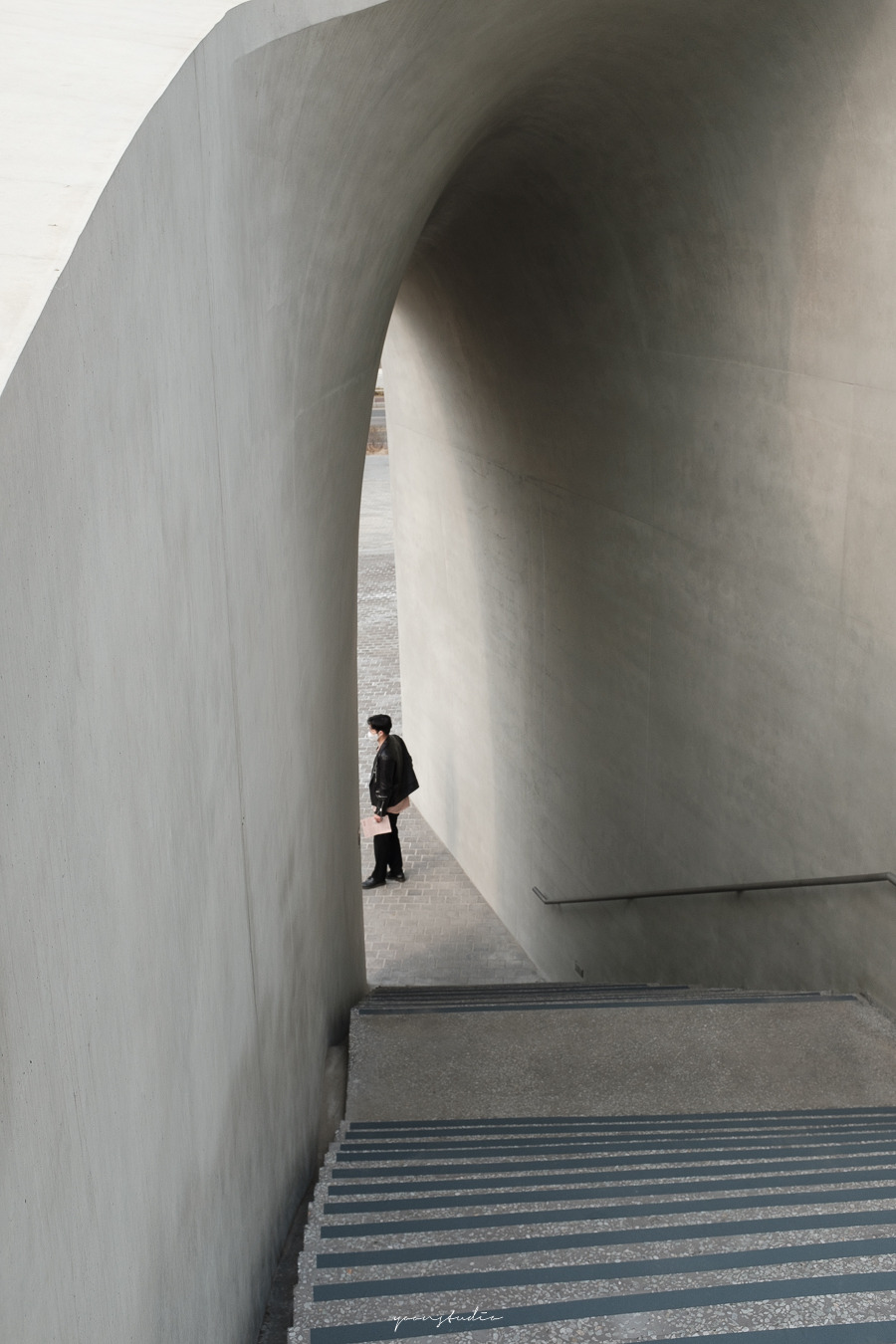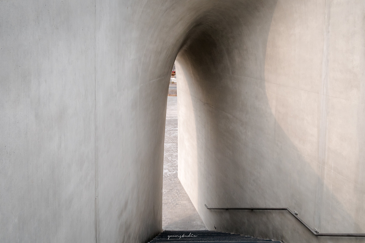 사선으로 날카롭게 떨어지는 곡선을 따라 건물에 진입하게 되면 콘크리트의 외압이 주는 딱딱함과는 다르게 부드럽게 이어지는 통로에 들어서게 되고, 자연스럽게 건물의 옥상에 들어서게 된다.
