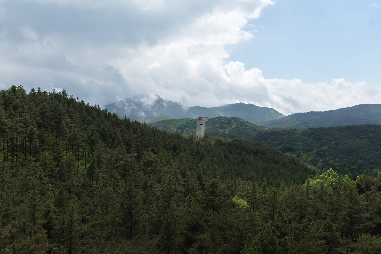 치허문을 지나 꼬부랑길을 따라 15분 정도 걸어 올라갔다. 먹구름이 털어내는 빗줄기와 수증기가 만들어낸 물안개는 숲을 더 신비롭게 산책하게끔 분위기를 조성한다. 어슴푸레 고개를 보이는 탑은 가까이 다가서야 거대함이 드러난다.