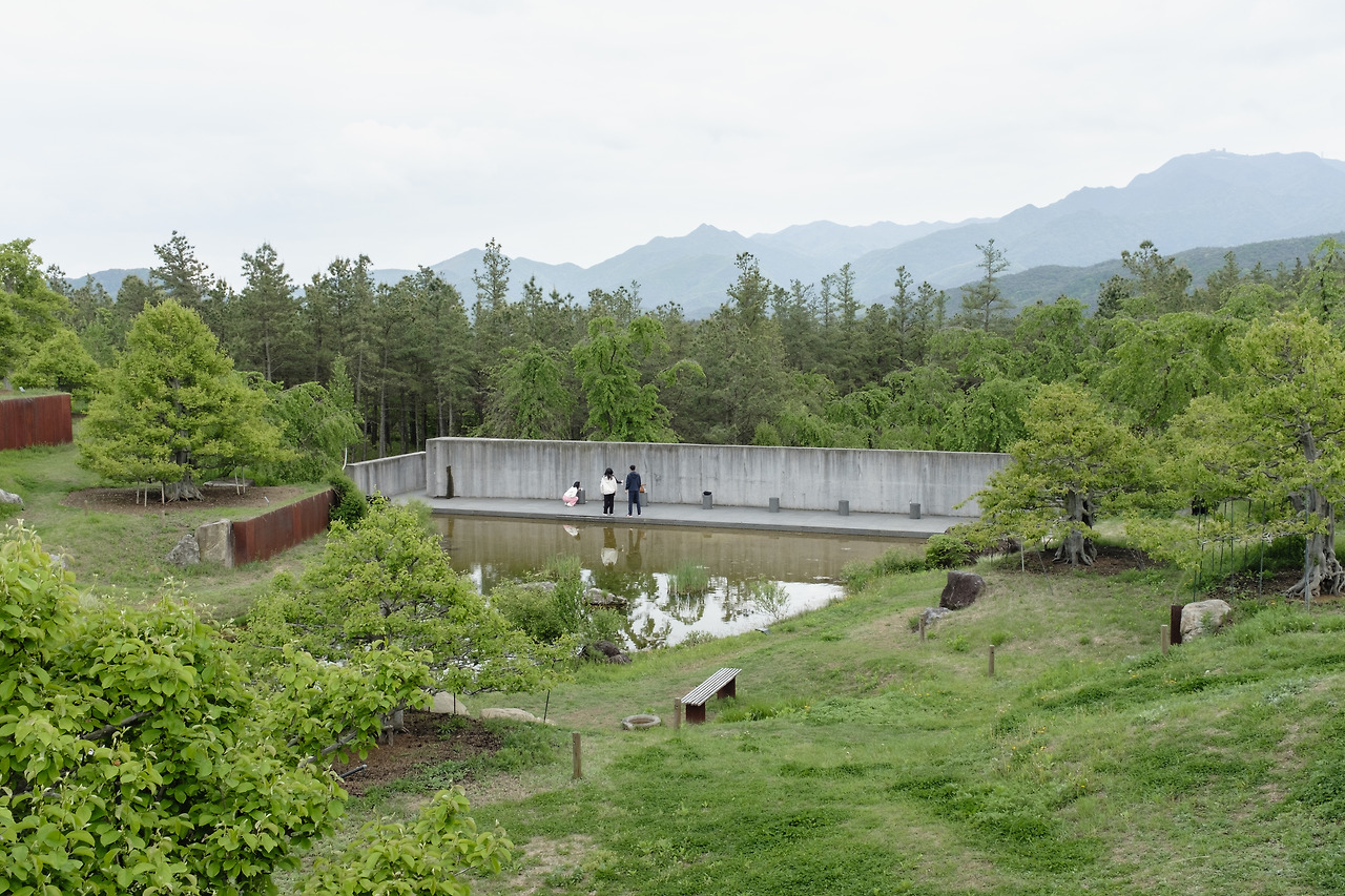 광활한 숲에 비밀의 공간처럼 나타나는 건축도 특별하지만 전체적인 경관을 표현하는 조경에도 엄청난 노력이 드러난다. 국내 최고의 조경가로 불리는 정영선이 방향성을 다음고 일본에서 조경의 장인으로 인정받는 가와기시 미쓰노부는 냇가와 정원에 배치될 돌을 계획했다. 사유원의 건축물은 알바로 시자, 승효상의 철저한 계획 아래 기획되기도 했지만 다수의 공간들과 조경들이 기능이나 용도에 집착한 게 아닌, 온전히 오브제로서 가치를 두어 그 쓰임 자체를 목적으로 했기 때문에 사유원의 공간에 집중할 수 있게 한다.