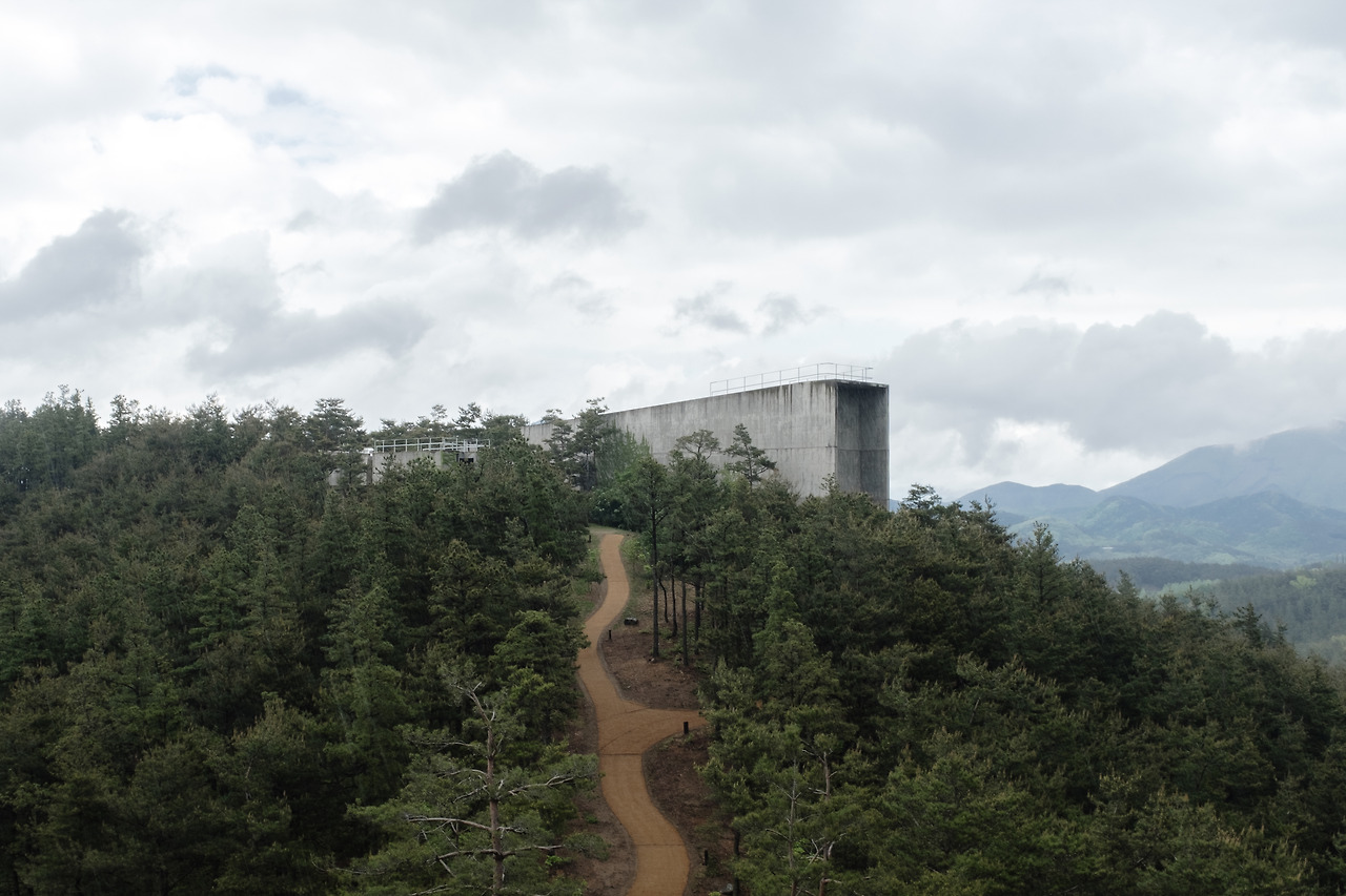 정상을 찍고 내려오는 길, 물이 흐르지 않는 계곡, 인공 연못이 만들어진 땅 위로 뱀처럼 길게 이어진 예사롭지 않은 건물이 보인다. 코르텐 재료로 다섯 개의 박스 형태가 띄워져 있는 건물은 인공 연못을 지그재그로 가로지르며 천정과 벽면에 뚫려있는 개구부 사이로 해의 기울기에 따라 빛이 스며든다.