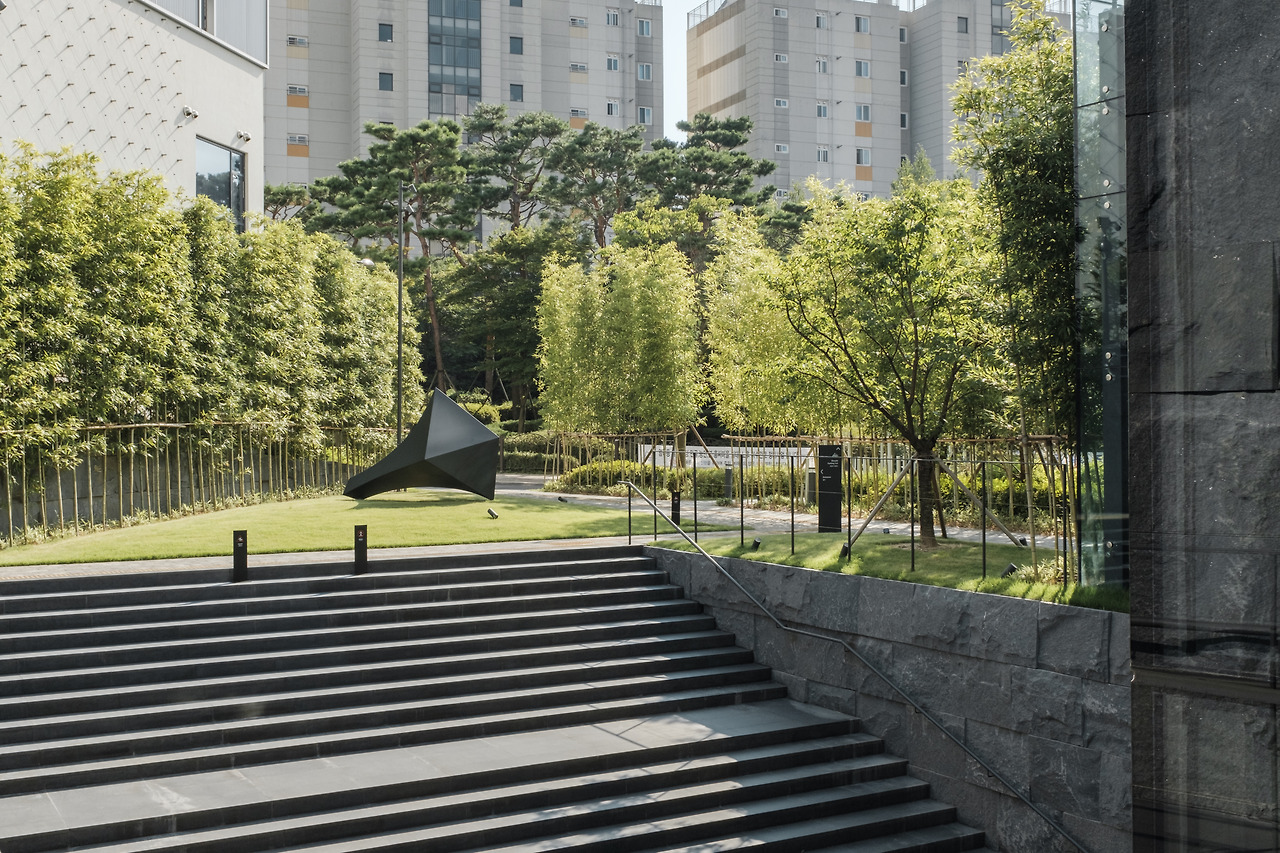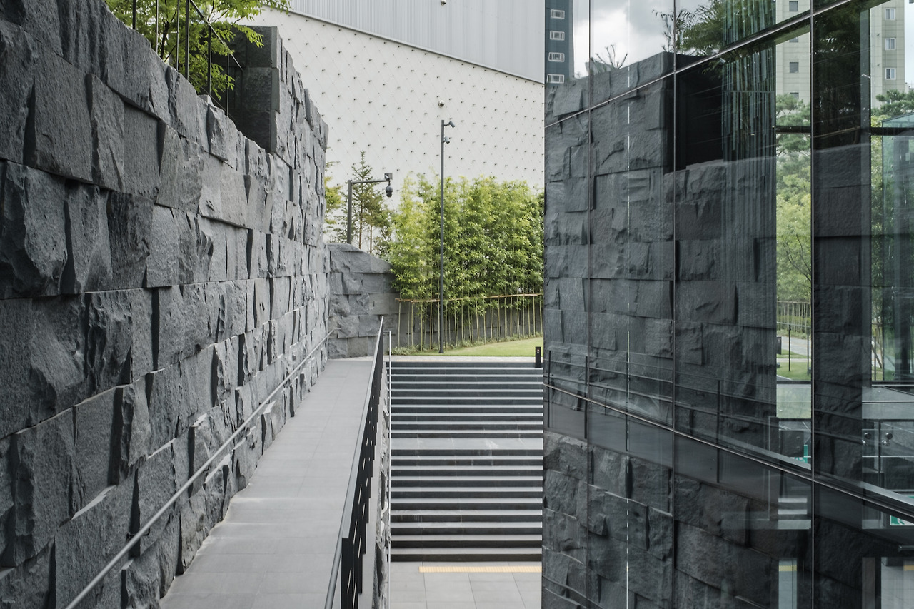 일반적으로 가장 접근성이 좋고 잘 보이는 곳에 입구를 두는 박물관과 달리 오디움의 입구는 건물 후면도로로 이어지는 계단을 타고 내려가는 곳에 자리한다. 계단은 계곡을 만드는 랜드스케이프 요소로 건축을 넘어 그 이상의 의미로 박물관은 하나의 랜드스케이프를 지향한다. 계곡과 숲이 하나 되는 랜드스케이프를 통해 자연에서 우리가 체험하는 공간과 숲의 관계성을 대형 계단으로 구현했다. 여기에 계단 벽면을 구성하는 돌은 두꺼운 석재를 거친 마감해 배치했다. 10센치 이상의 석재를 '혹두기'라는 마감을 통해 계단을 오르내리며 실제 계곡에 와 있는 듯한 공간을 경험하게 된다.