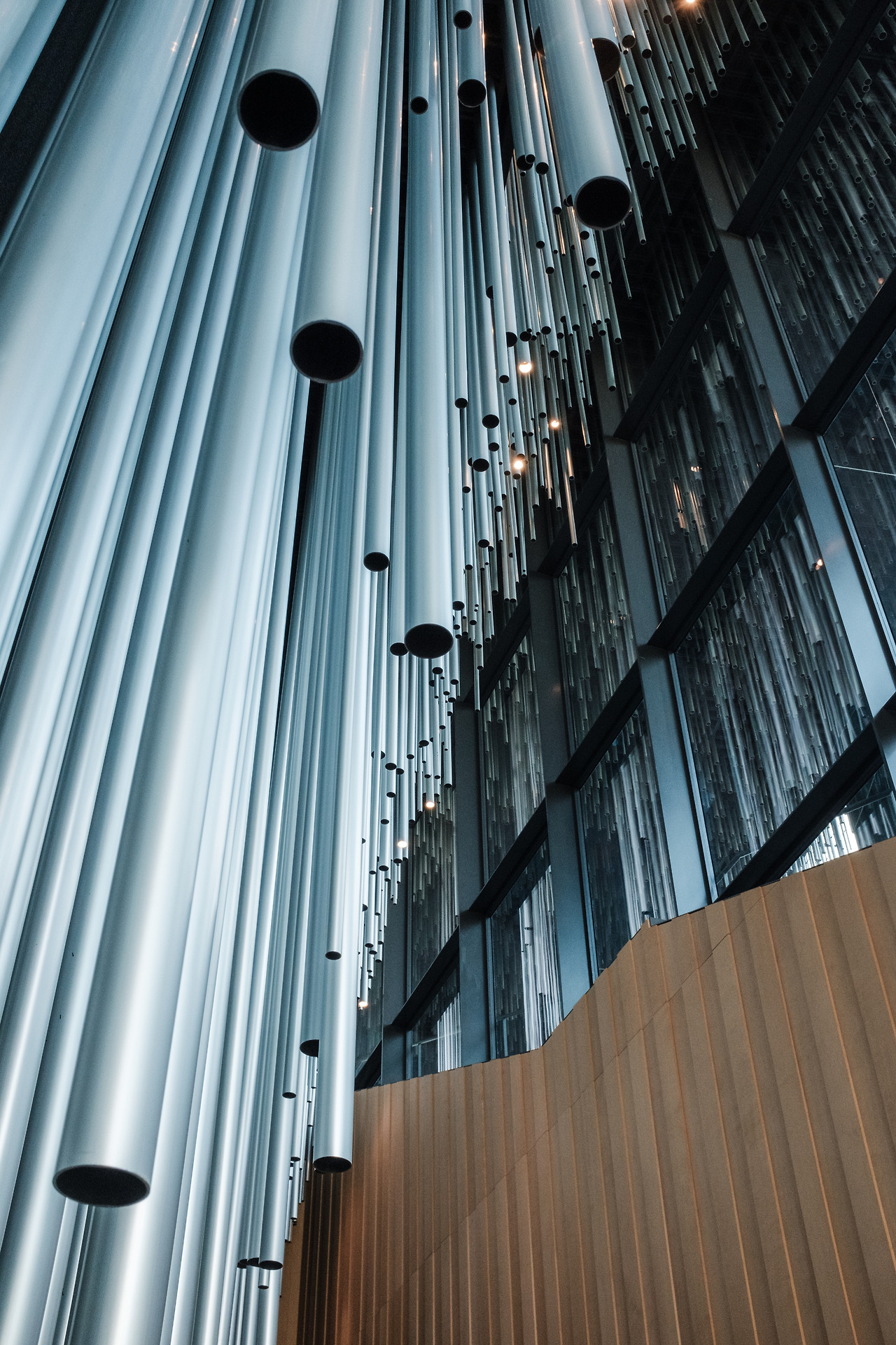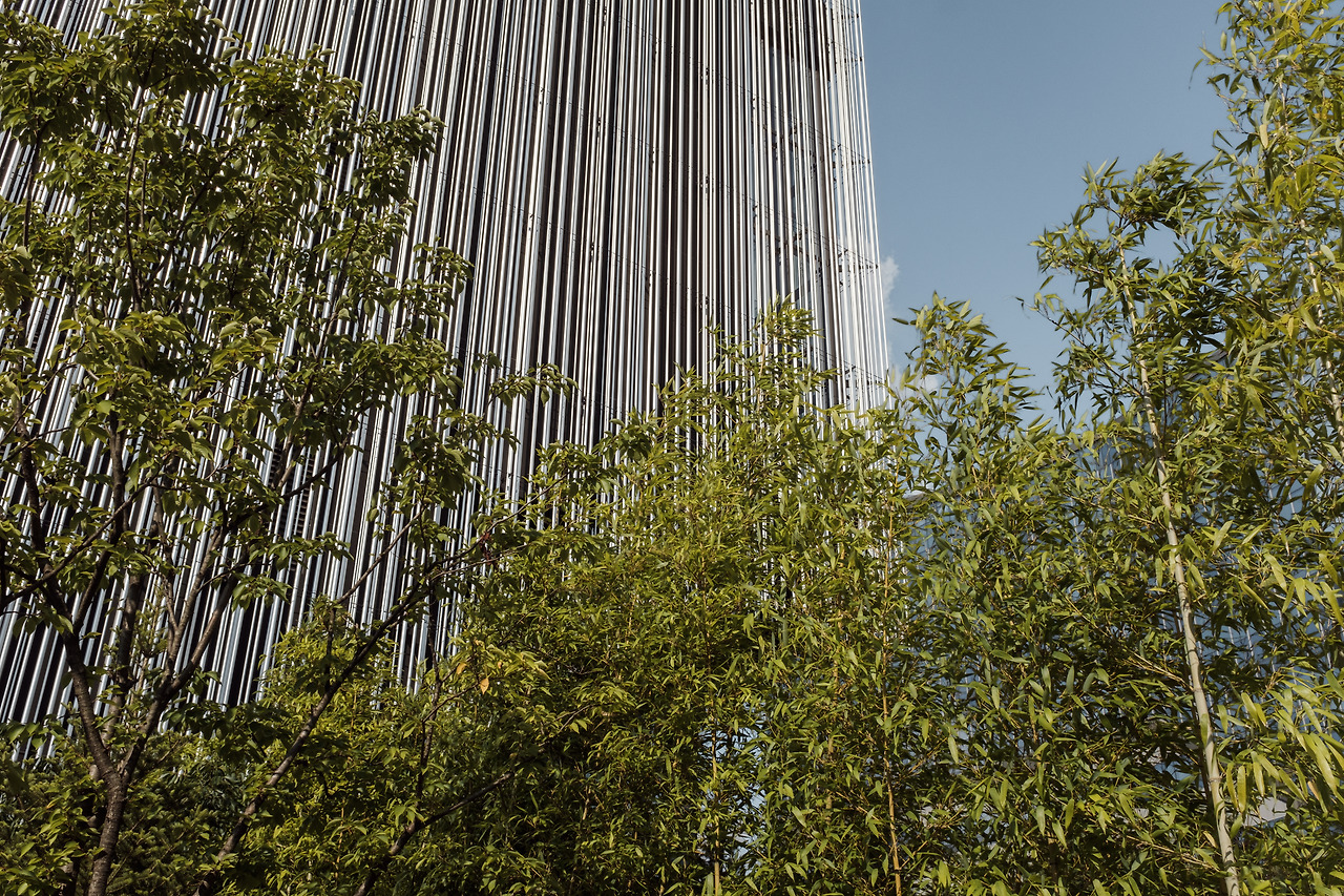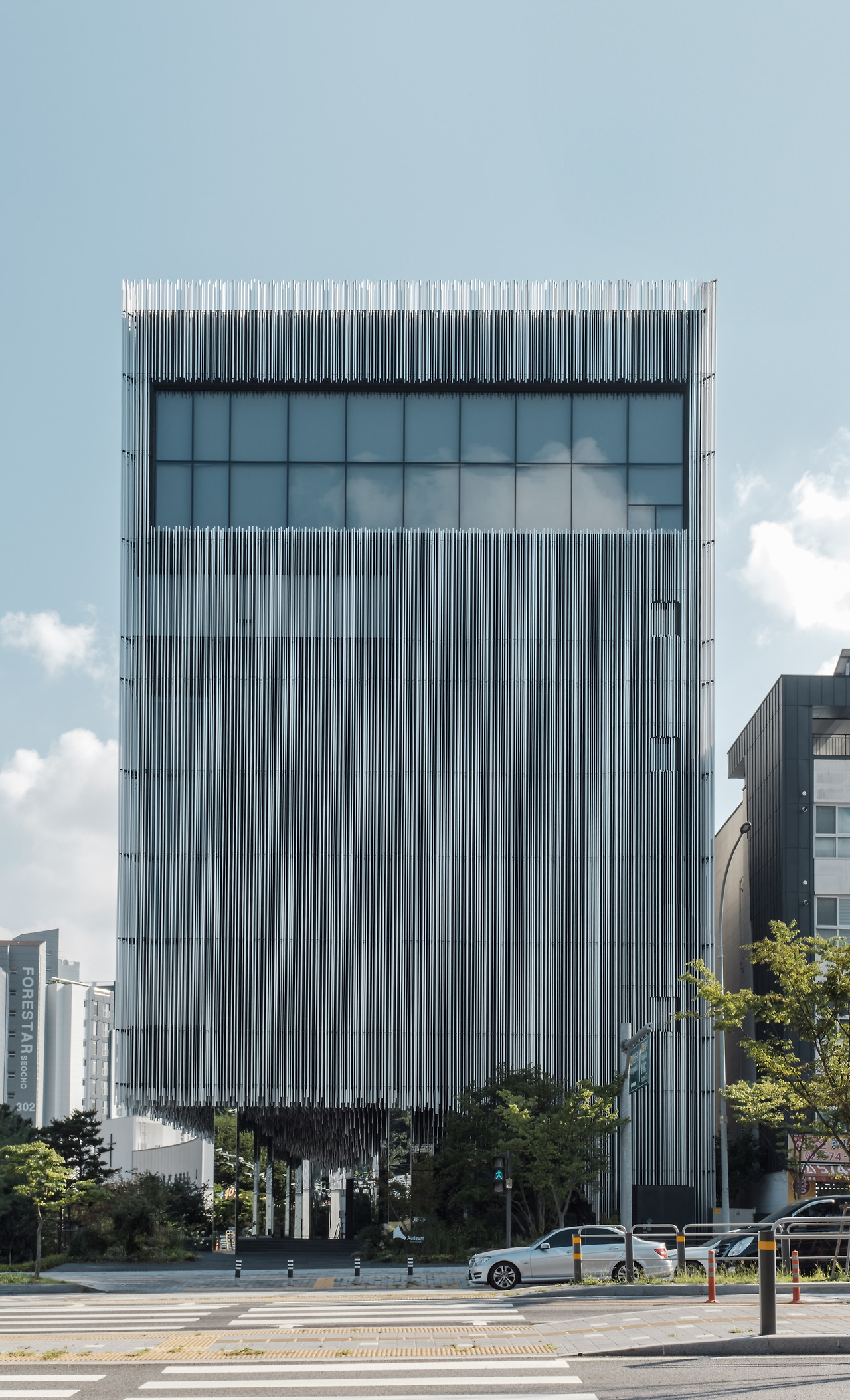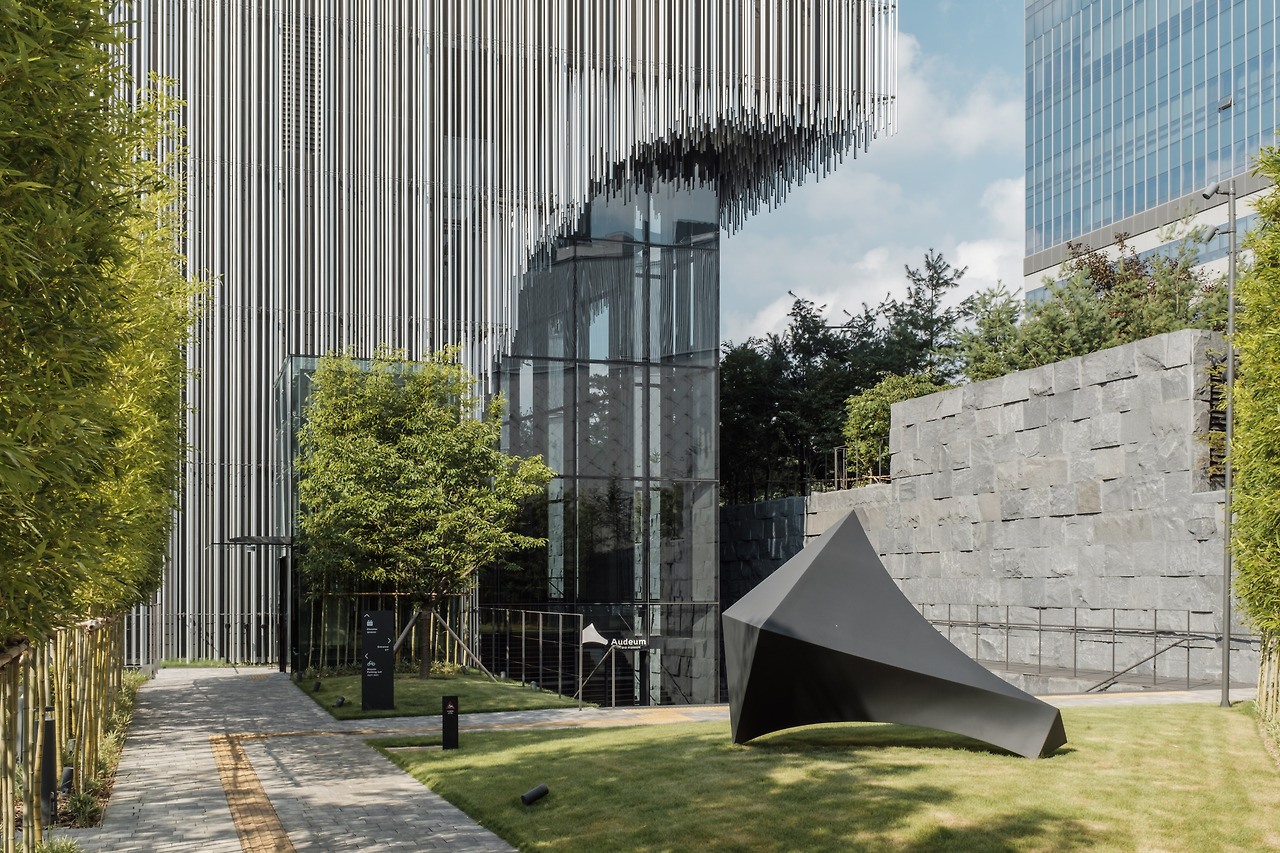 버스에서 내리니 뜨거운 태양 빛이 불가마처럼 활활 타오르는 아스팔트의 열기가 온몸을 감싼다. 하필이면 8월 중에서도 가장 더운 날이었다. 더위를 조금이라도 피해볼까 싶어 발걸음을 옮기니 횡단보도 너머로 보이는 거대한 수직 건물이 눈에 밟히니 밝은 알루미늄 파이트 2만 개가 수직으로 건물을 감싸며 빛과 그림자가 마치 숲에 스며드는 효과를 내는 도심 속 자연을 표현한 곳. 세계 최초 오디오 뮤지엄 '오디움'이었다.