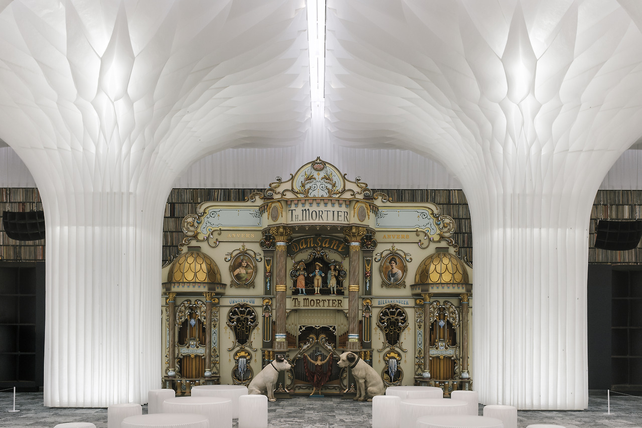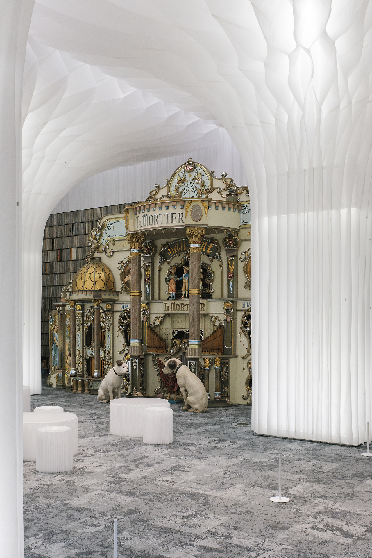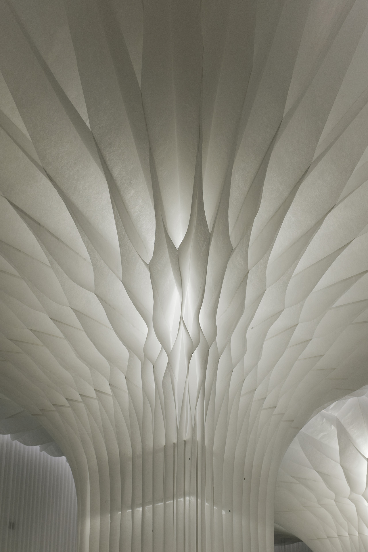 조형미가 돋보이는 밝은 공간에 들어서 가까이 다가가면 꽃의 형태로 이루어진 기둥이 유돋 돋보인다. 오디움 전시의 마지막이자 공간의 시퀀스가 절정에 다다르는 구간으로 부드러운 패브릭 소재로 공간을 가득 매웠다. 부드러운 패브릭 소재는 소리의 가능성을 최대한 끌어내고 패브릭 자체를 조형적으로 연출하는 것이 이 공간의 테마다. 또한 패브릭은 소리만이 아닌 빛까지도 부드럽게 변형시킬 수 있다. 패브릭이 지닌 부드러움을 최대한 살리기 위해 소재의 가능성을 모색하는 과정에서 꽃의 형태에 도달했고 그 결과, 꽃이 지닌 화려함이 이곳에 전시되는 오디오의 여러 디자인과 어우러져 화려하고 드라마틱한 공간으로 완성되어 소리와 빛이 관람각들에게 특별한 체험을 선사한다.
