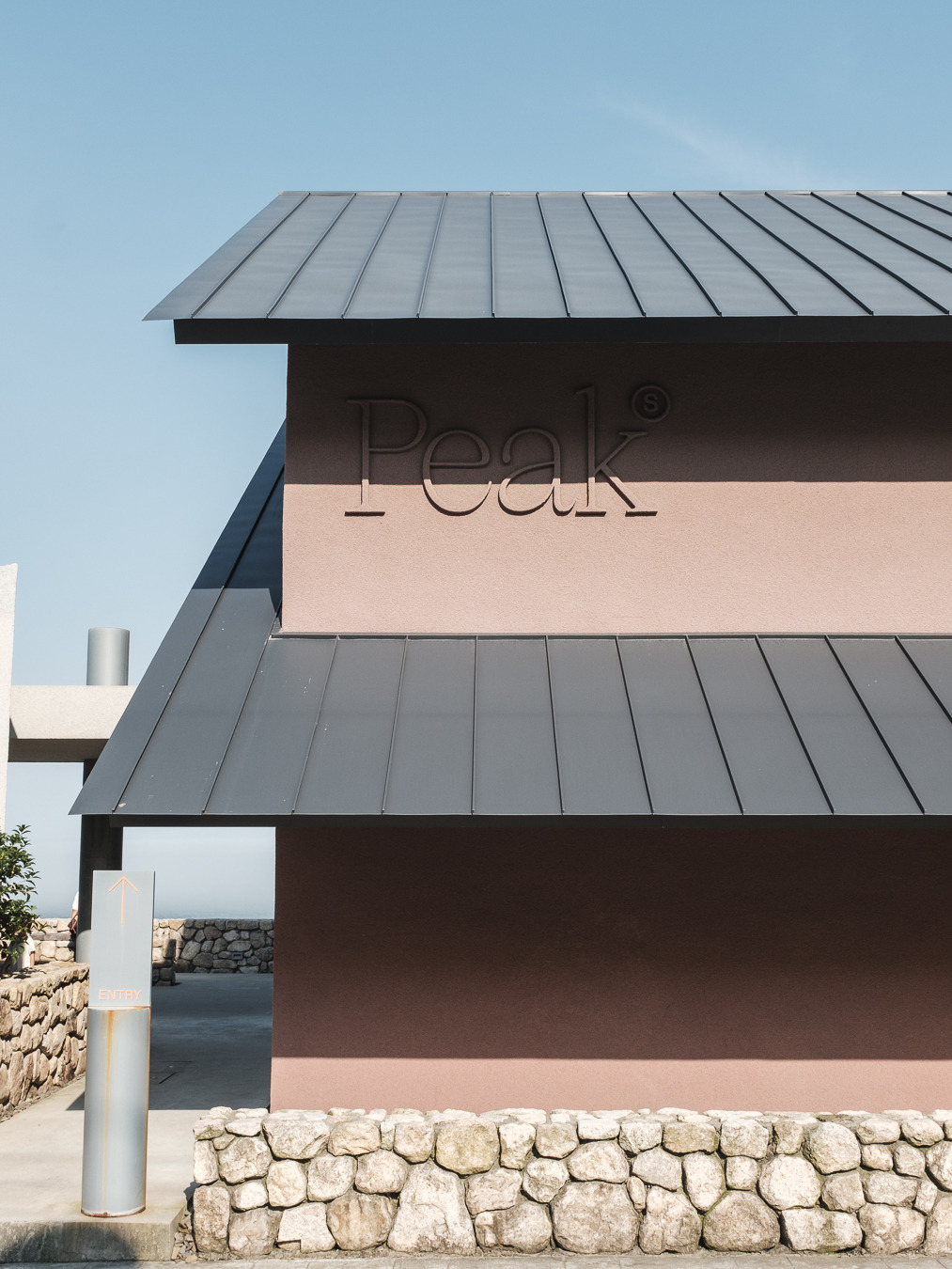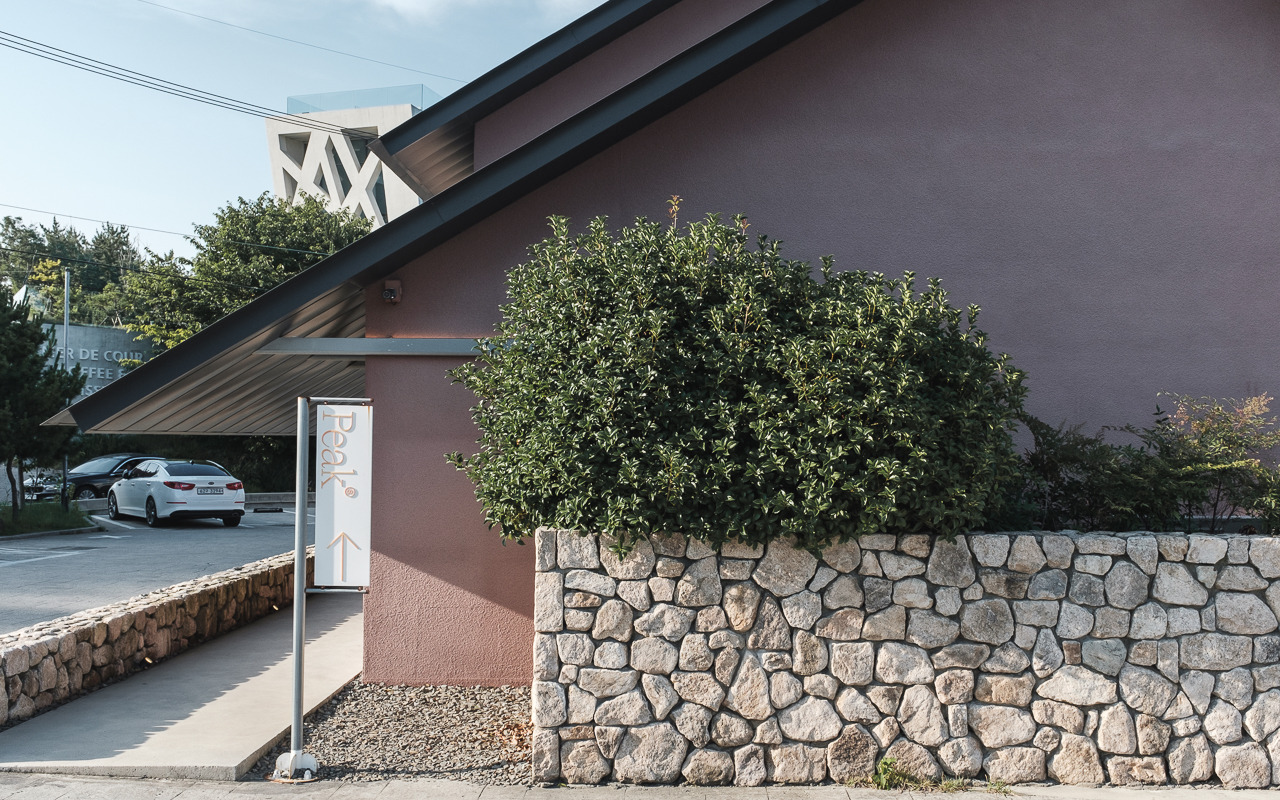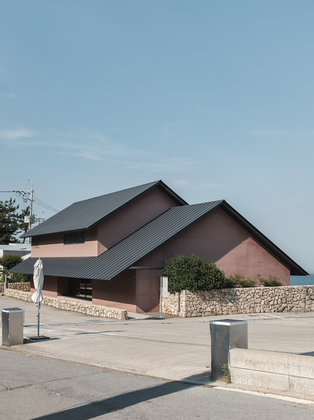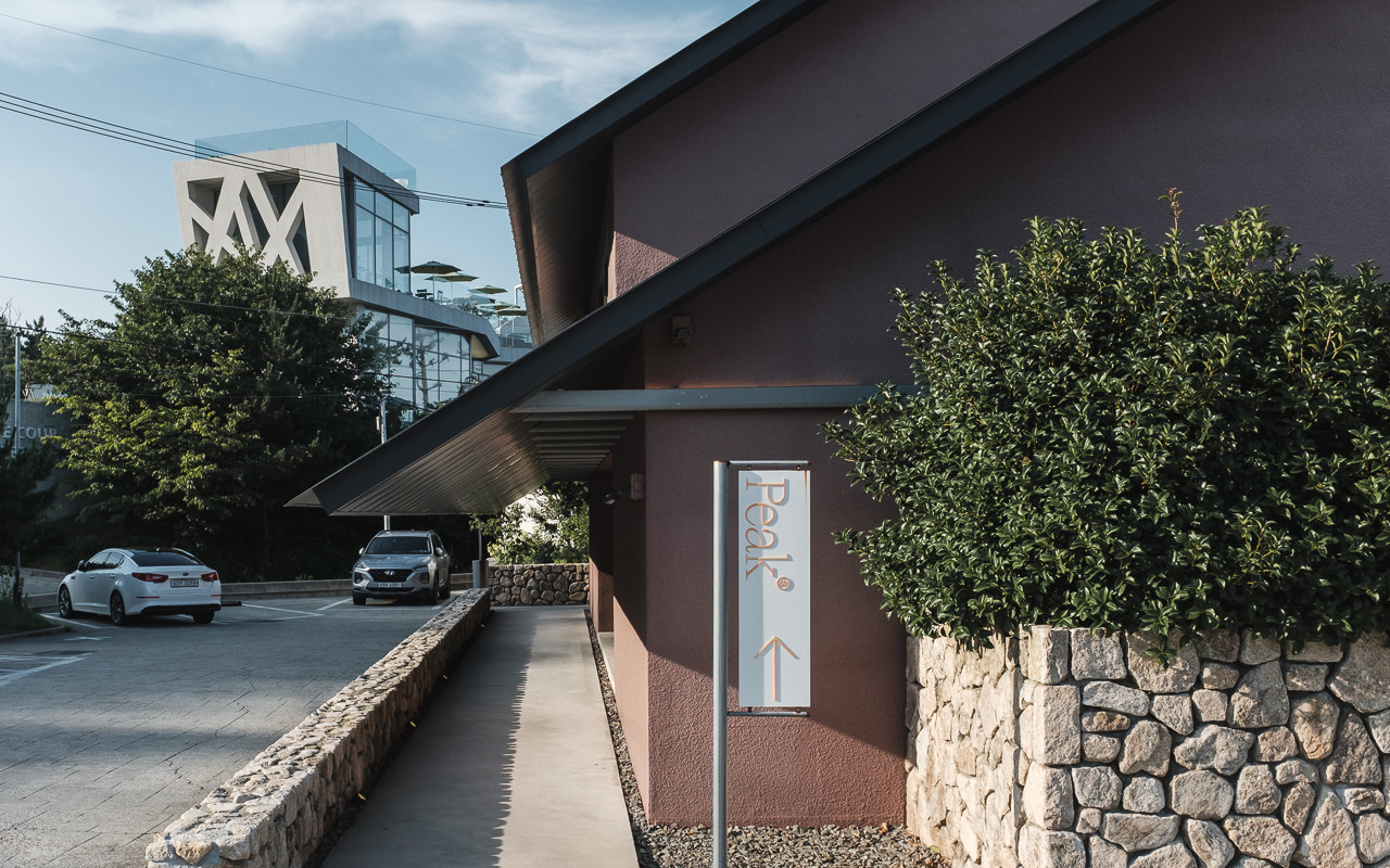 거대한 볼륨감을 선보이는 박공지붕 아래 겹겹이 쌓여있는 건물은 땅의 색깔과 닮아있다. 부산 기장 해안 일대의 갯바위 색상에서 차용해 붉은 모습으로 치장한 건물의 내외부 마감이 눈길을 끈다. 기존 건물이 가지고 있던 산만한 박공 구조는 단정하게 정리하고 동시에 처마 길이를 길게 연장했다. 덕분에 건물은 더욱 입체감 있는 형태를 가지며 바깥의 해안 풍경에 더 가까이 닿아 있는 모습이다. 이곳은 부산 기장에 위치한 카페 ‘피크스퀘어’다.