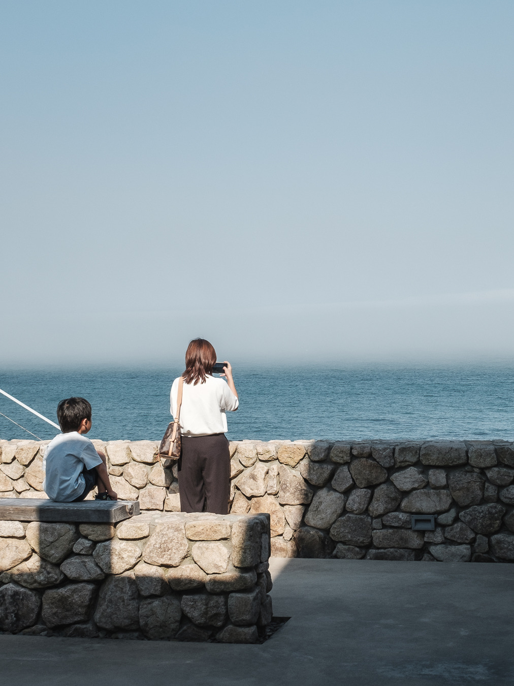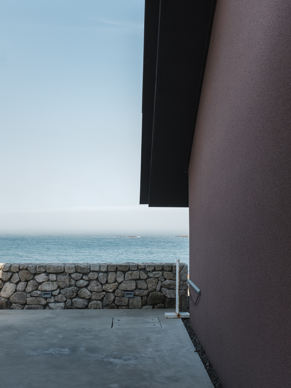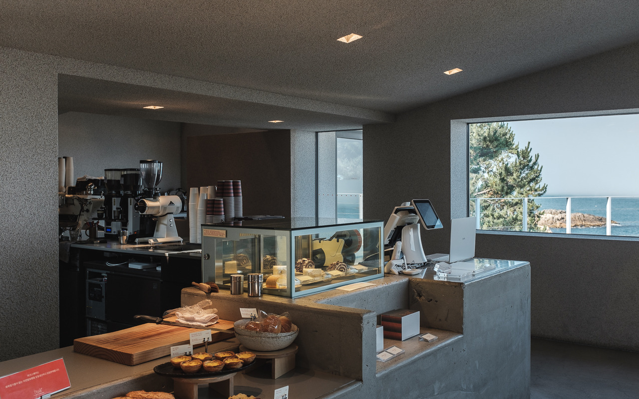 길게 뻗은 진입로를 지나 오른쪽으로 돌면 두 개의 건물 사이로 품 안에 들어오는 기장 해안의 모습이 펼쳐진다. 건물 아래로 내려간 테라스는 내부와 외부의 사람들이 모두 풍경을 공유할 수 있도록 이동했고 오롯이 바닷바람과 파도소리만 들리는 이 자리에 서서 방문객들은 자연과 하나가 된 듯한 경험을 누리게 된다.