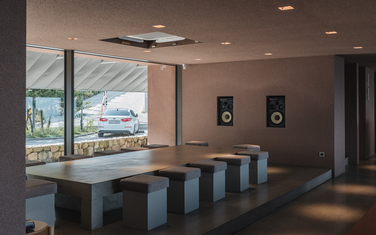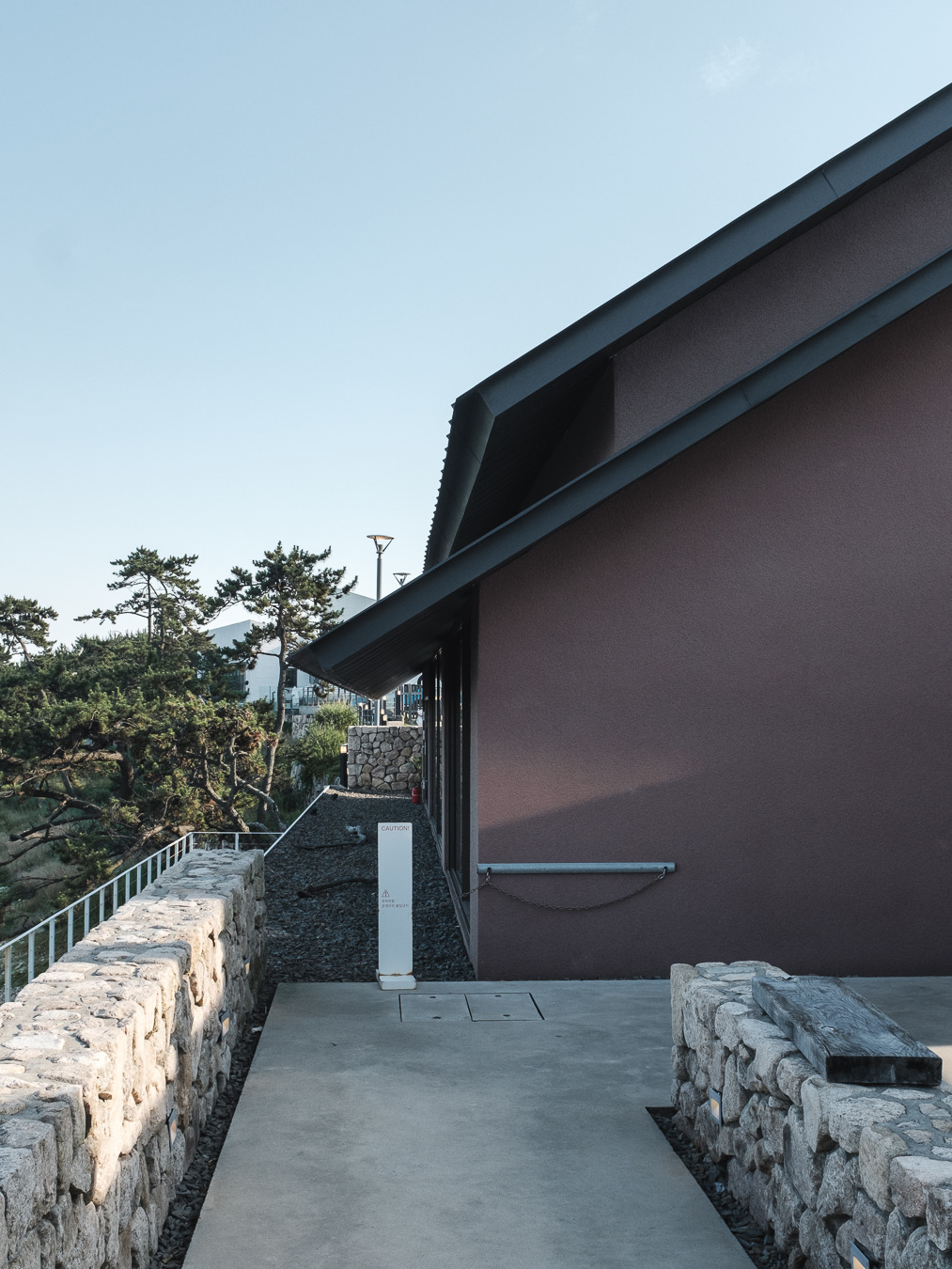 건물 내부에 들어가기 위해선 건물을 관통하는 가로축이자 박공지붕 아래의 전이공간을 지나쳐야 한다. 해안가에 있을법한 돌들을 쌓아 만든 이 작은 담장은 건물과 주차장을 구분하는 장치이자 땅의 성격을 구분한다. 자동차가 머무는 공간과 사람이 머무는 공간으로.