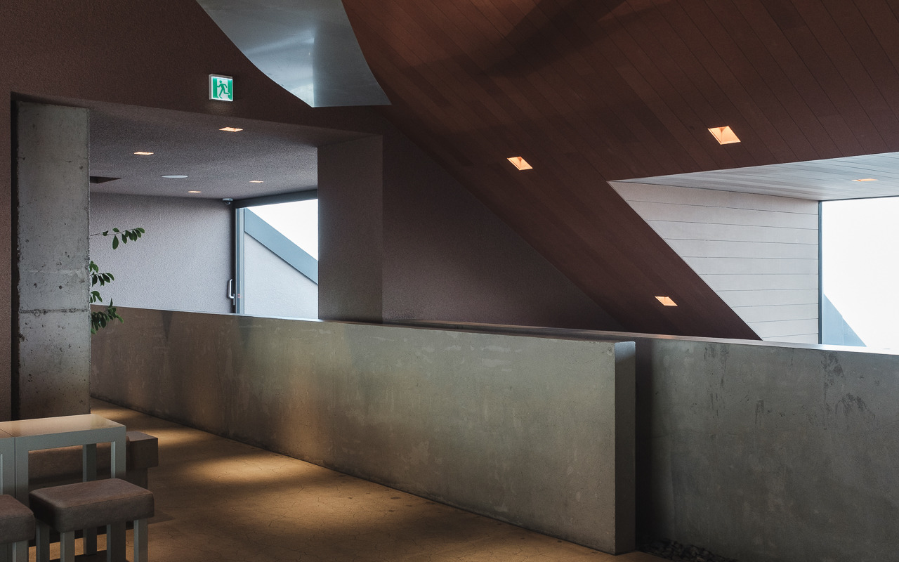 건물 안으로 들어서면 모든 좌석이 바깥의 풍경을 마주할 수 있도록 되어 있고 붉게 칠해진 벽과 돌과 나무 등 물성을 온전히 드러낸 가구들은 무한한 자연성을 다양한 감각으로 방문객들이 경험하게끔 한다. 뿐만 아니라 작은 창부터 커다란 창까지 다양한 크기의 창은 시시각각 변화하는 바깥의 풍경을 다양한 시점과 시각에서 바라볼 수 있게 하는 장치로 사용된다.