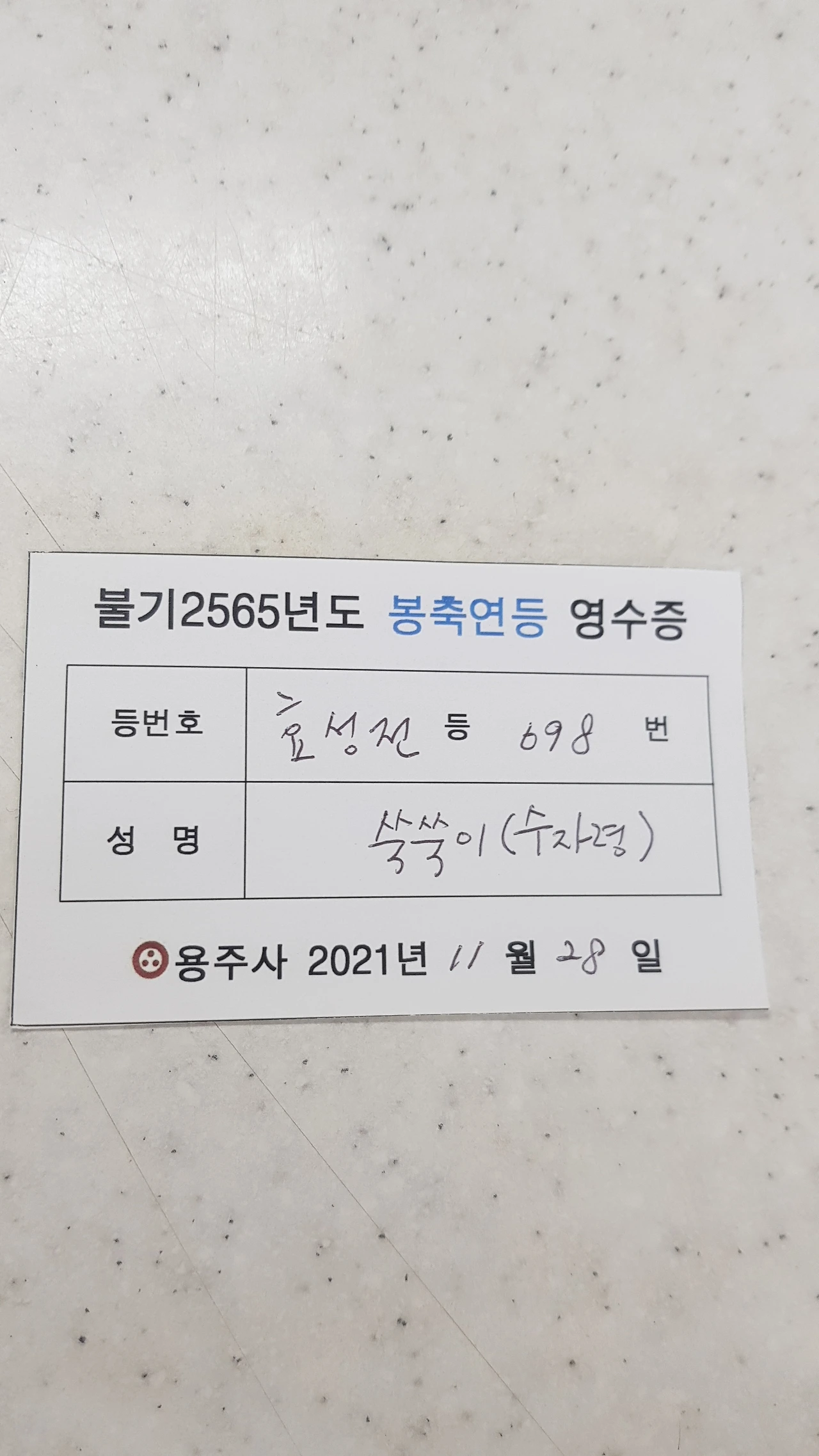아직 한 아이는 아내의 품 속에서 건강하게 살아내고 있다. 이 아이의 태명은 복덩이이다. 우리 부부는 부처님께 쑥쑥이의 영을 부탁하며 복덩이가 남은 시간 잘 버티어 함께 마주하게 해 달라는 기도를 드렸다. 내년 초파일까지는 언제고 시간이 되면 관음전에 달려있을 쑥쑥이를 만나러 오리라.