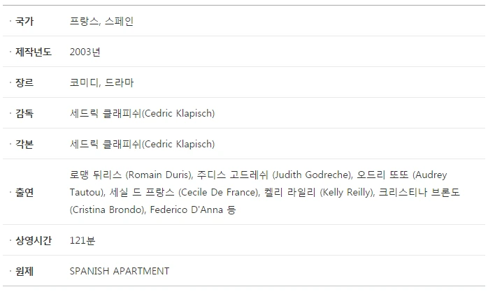 스페인, 영국, 프랑스 등 여러 국가의 학생들이 모여 한 아파트에 거주하며 룸메이트로 지내면서 문화/성별/성향 차이로 인한 갈등도 있지만, 결국엔 서로 믿고 의지하는 찐~한 친구가 되어간다 :D