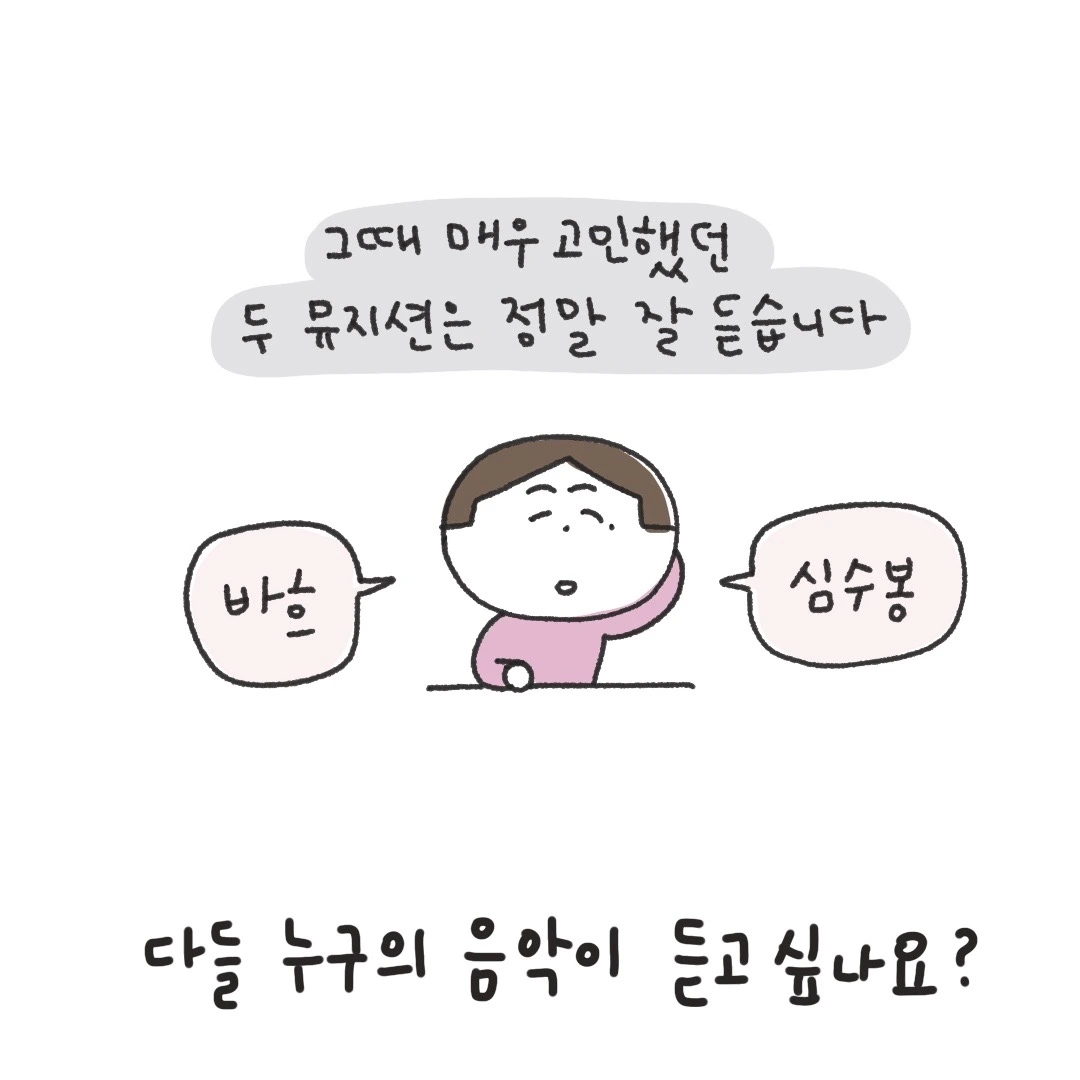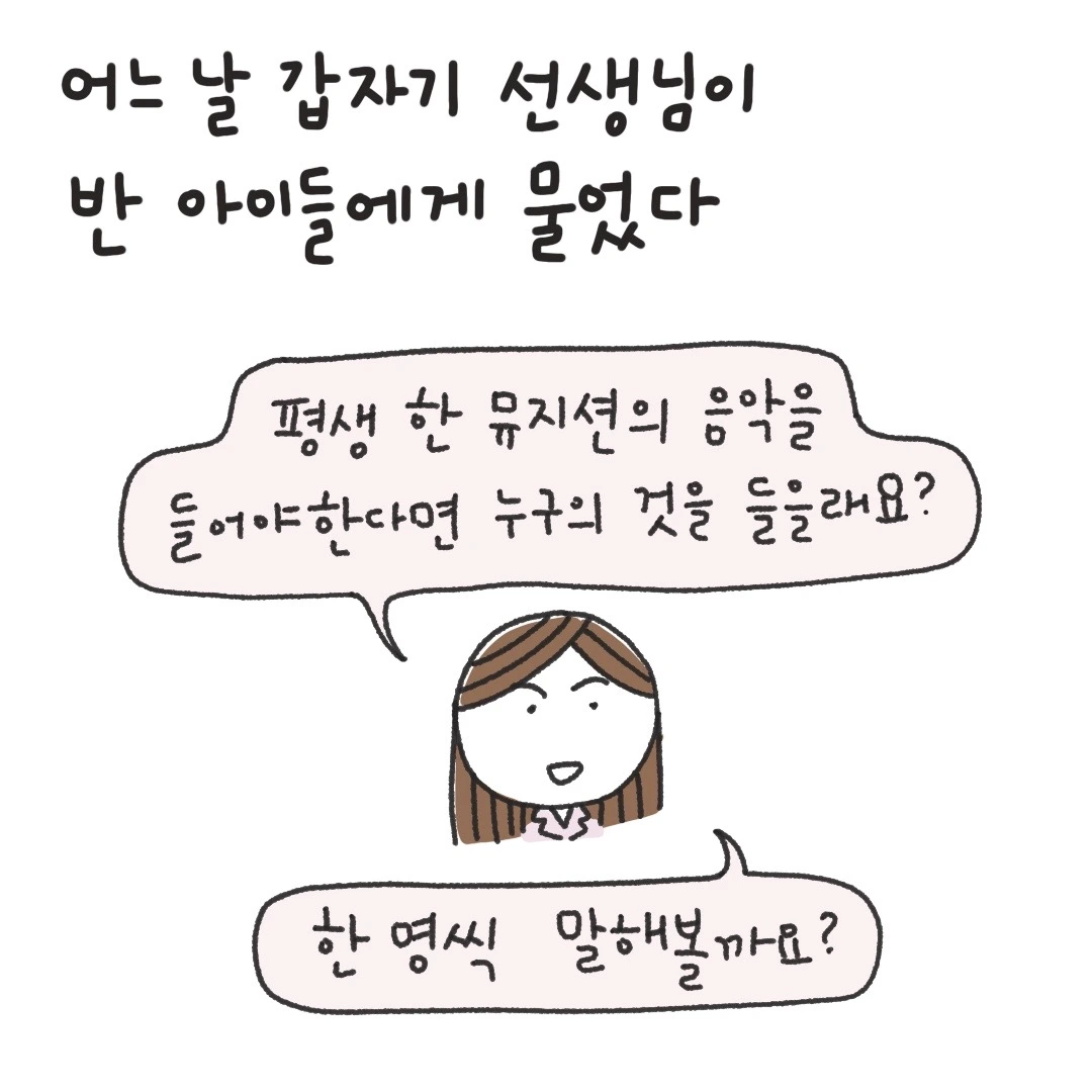 요즘 다시 클래식에 빠진 내 플레이리스트를 보다가 갑자기 떠오른 추억 속 선생님. 수업을 시작하고 다짜고짜 저 질문을 하셨는데 무슨 의도인지는 모르나 십수년이 지난 지금도 가끔 떠오르는 선생님의 질문. 나는 여전히 바흐와 심수봉 사이를 오가며 노래를 듣고 있다. 그리고 반 친구들아. 다들 여전히 그들의 음악을 듣고 있니?