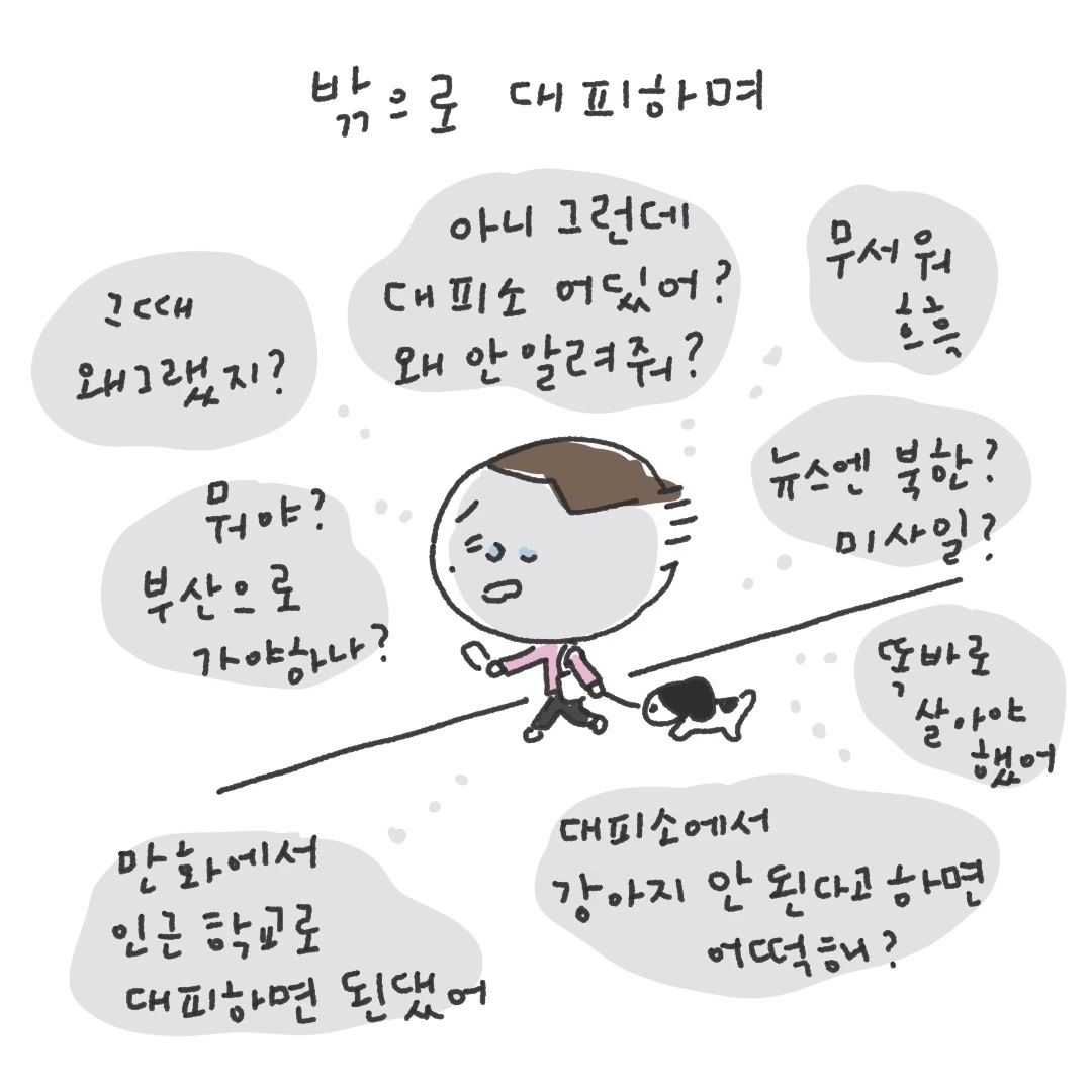 서울만 호들갑이었는지도 모르겠습니다만 새벽에 책상에 앉아있다 울리는 사이렌 소리에 강아지는 짖고 저는 대패닉이었습니다. 진동이 계속 울리는 핸드폰에 터지지 않는 와이파이와 인터넷.. 순간 머릿속에 국제 정세와 수만 가지 생각이 들며 정말 전쟁난 줄 알았던 오늘 아침의 나..