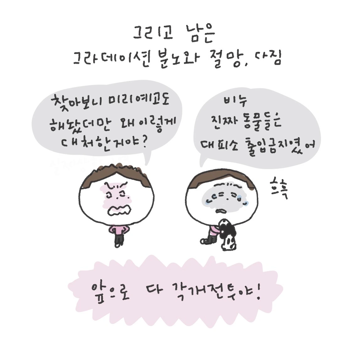 집으로 돌아온 저는 잠깐 침대에 누워 재난대피가방을 검색하고 대피소에 강아지와 함께 갈 수 있는지를 검색해 보았습니다. 몸에 힘이 빠져나가는 아침이네요 일단 몸과 마음에 평화를 좀 찾고 일상을 이어 나가보겠습니다