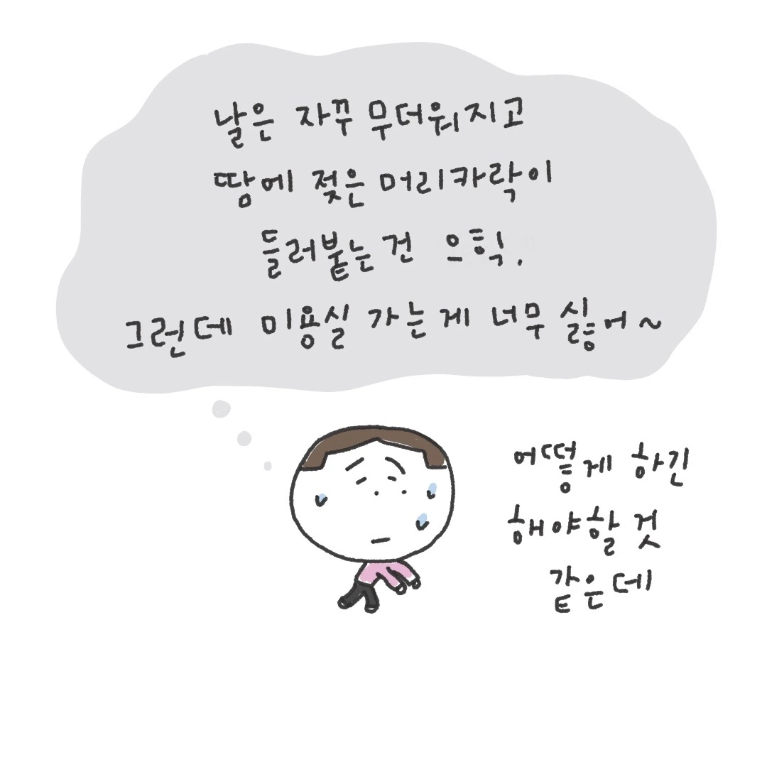 이상하게 미용실 가는 일이 영 껄끄러운 나. 누군가 위에서 내 정수리를 보고 있다고 생각하니 매우 거시기하고 또 미용실의 아주 가감 없이 투영하는 거울에도 무서움을 느낀다. 나만 그런가?