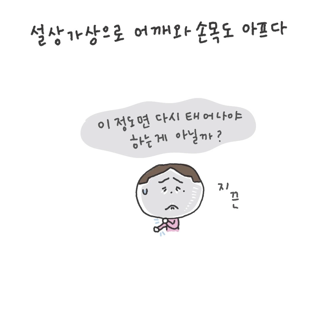 어깨도 사실 안 쓰는 근육에 무리하게 힘을 주며 생긴 근육통인듯하고 직업상 컴퓨터에 앉아있는 시간이 많다 보니 아픈 어깨에 무리가 더 가고 굳은 팔꿈치와 손목이 더 아픈 것 같다.