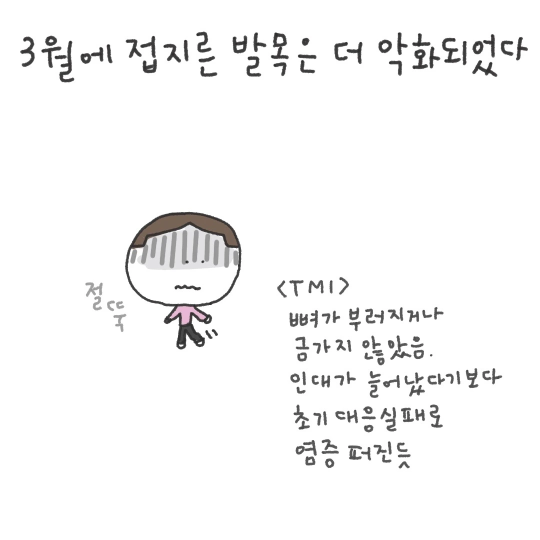 계속 낫지 않는 발목을 이끌고 정형외과 3군데, 한의원 1군데 돌아다닌 결과 초기대응 실패로 인한 염증을 못 잡은 게 원인인 듯하여 그냥 한 곳에 정착해 물리치료와 약물치료를 꾸준히 받는 것으로 했다.
