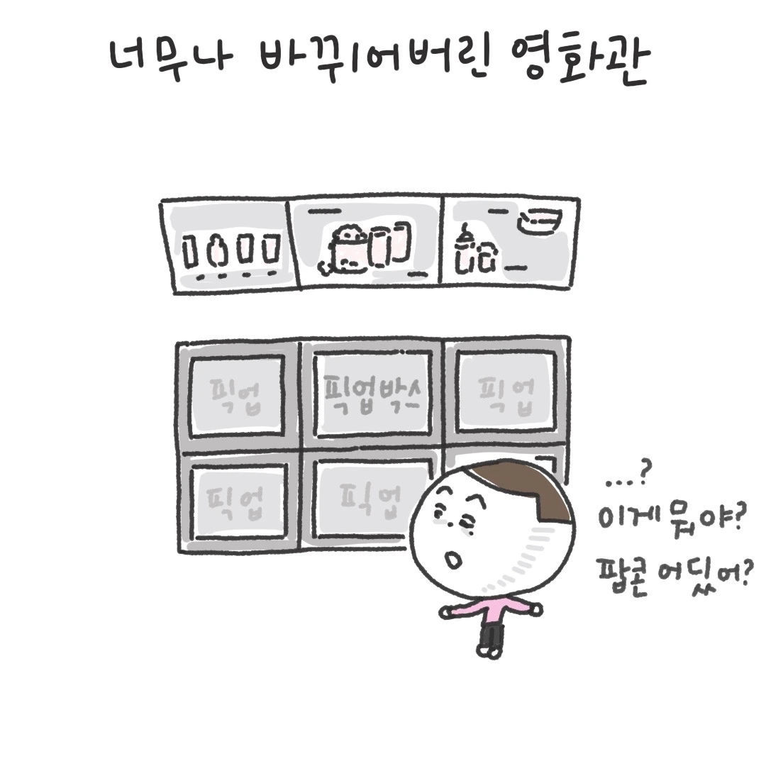 바뀐 영화관 시설에 놀라고 키오스크 공포증이 있는 나는 좀 버벅거리다 예매 확인도 했다. 팝콘도 시켜서 픽업 박스로 받는 것도 처음 해보고.
