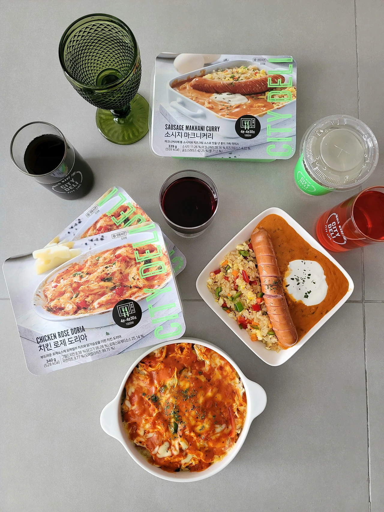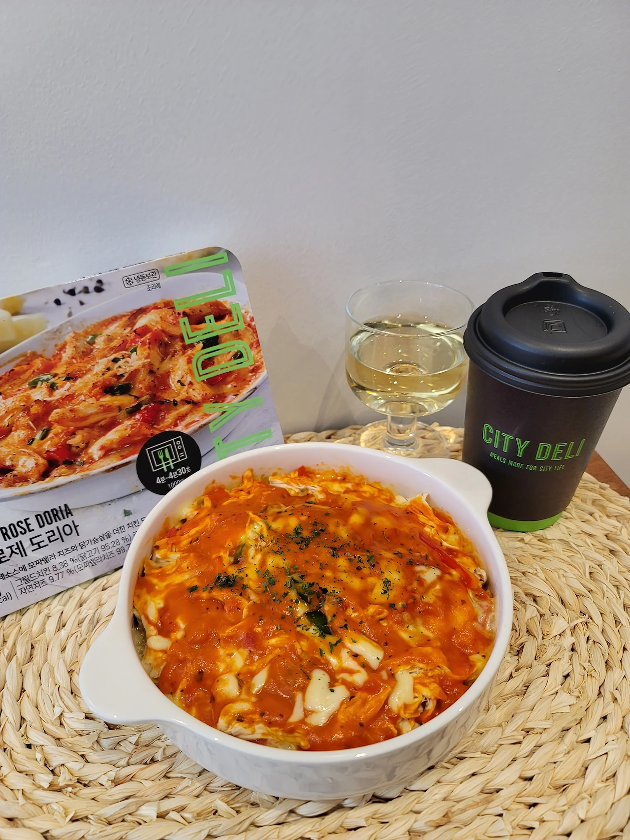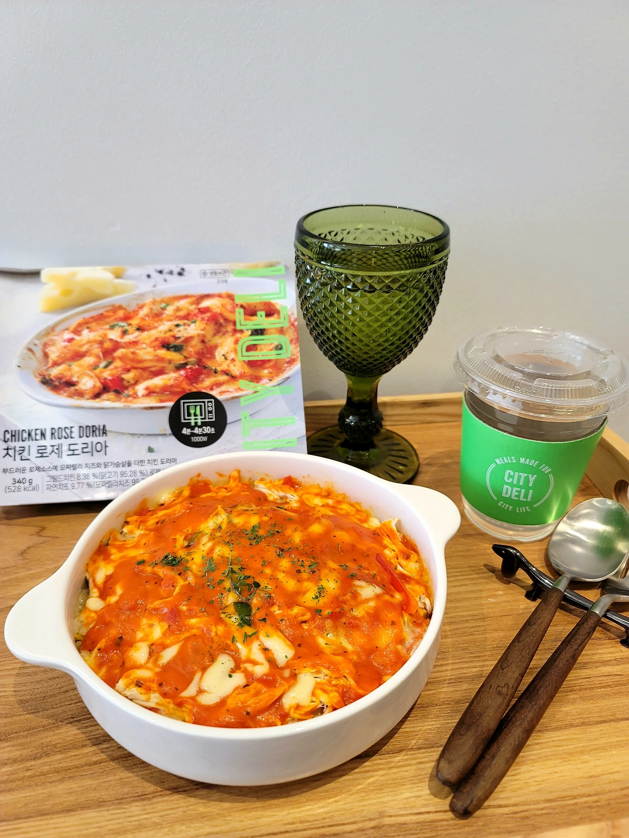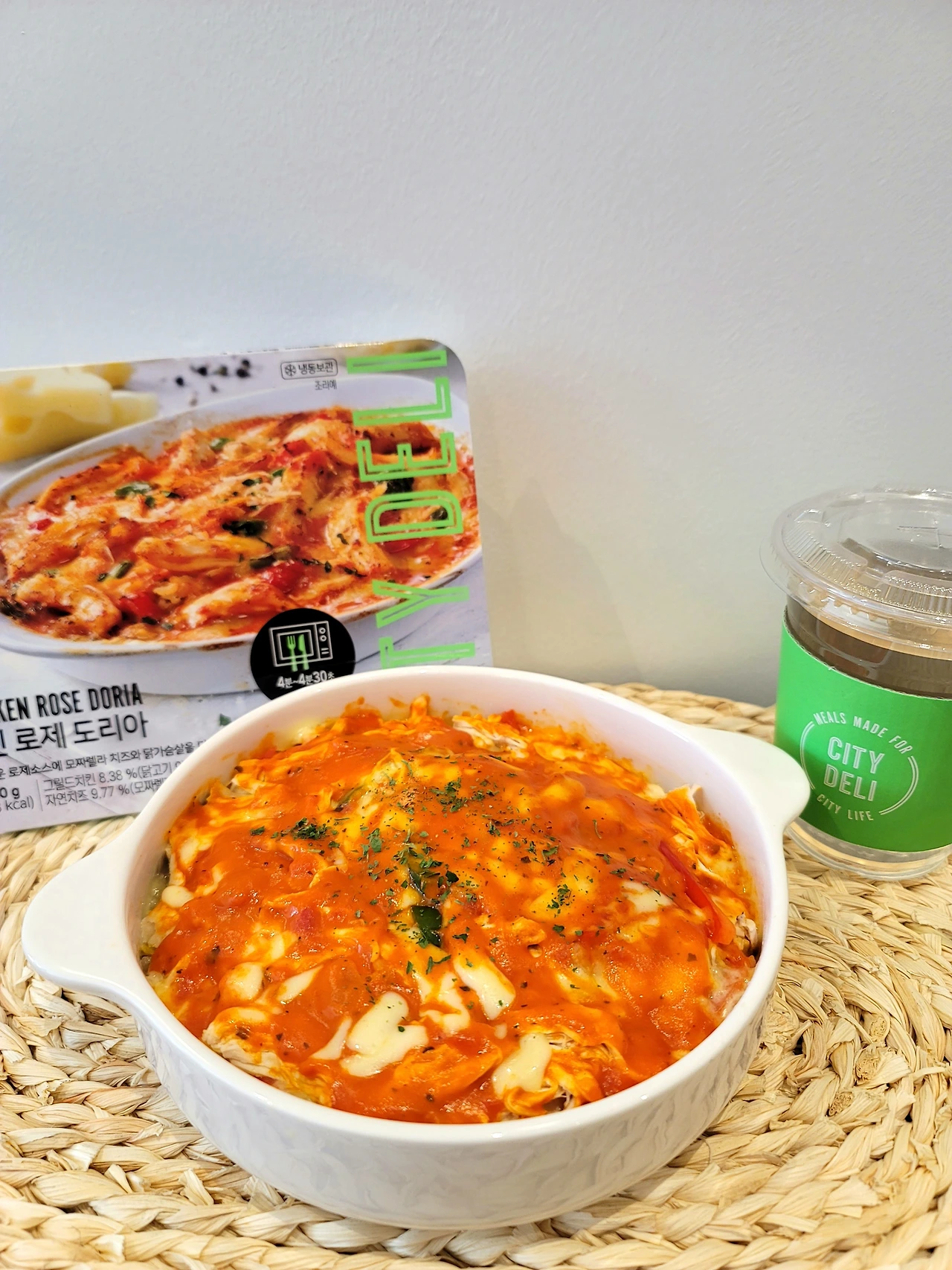 굴 소스 라이스, 닭 가슴살, 홍피망, 청피망, 그라나파다노 치즈, 피자 치즈, 파슬리, 로제 소스로 만든 간편식 시티델리 '치킨 로제 도리아'입니다. 시티델리 간편식 다이닝투고 시리즈 중에서 가장 판매율이 높은 메뉴입니다.